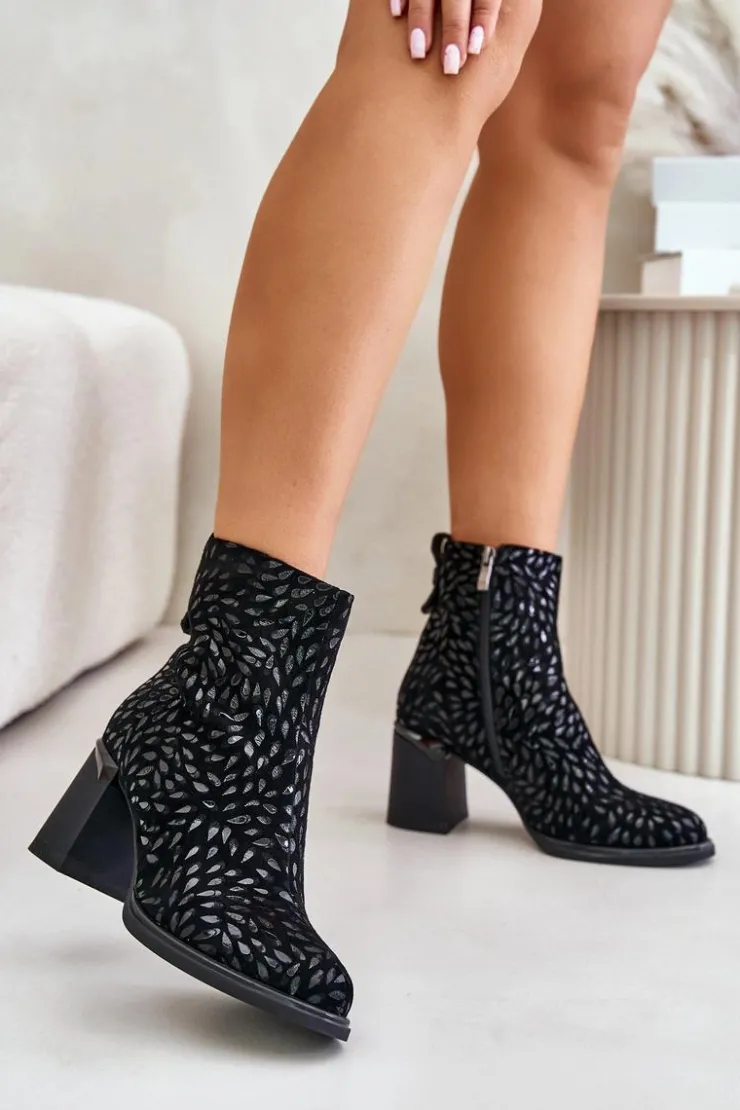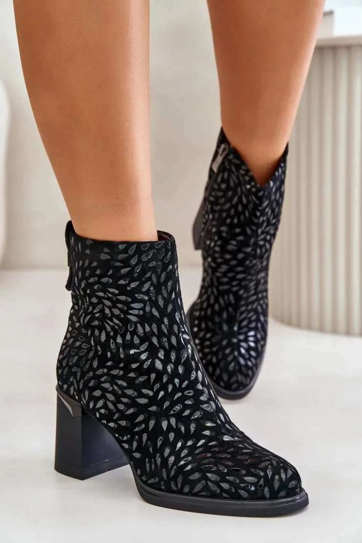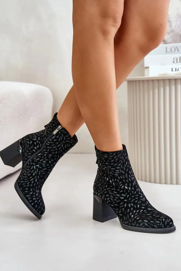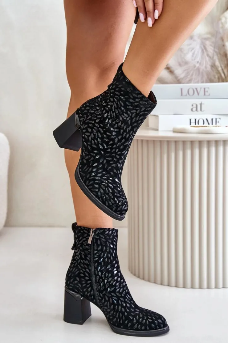 Eleganckie botki damskie wykonane naturalnego zamszu. Osadzone na obcasie w formie słupka. Głównym atutem tego modelu jest liczne tłocznie na cholewce. Noski zaokrąglone. Zapinane na zamek. Środek ocieplany kocem obuwniczym, co zapewni ciepło i komfort w chłodniejsze dni. Przy wyborze rozmiaru prosimy sugerować się tabelą rozmiarów.