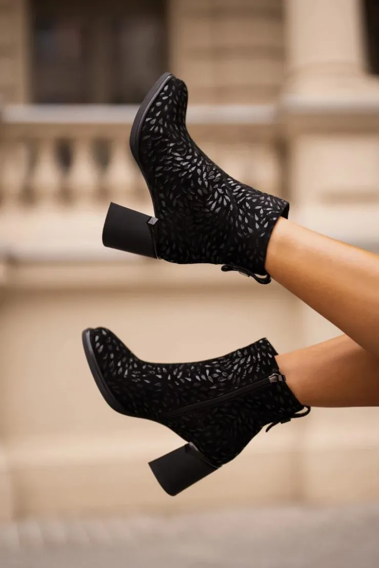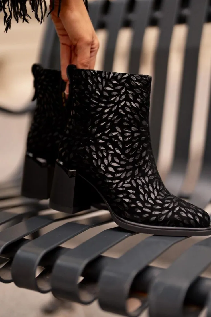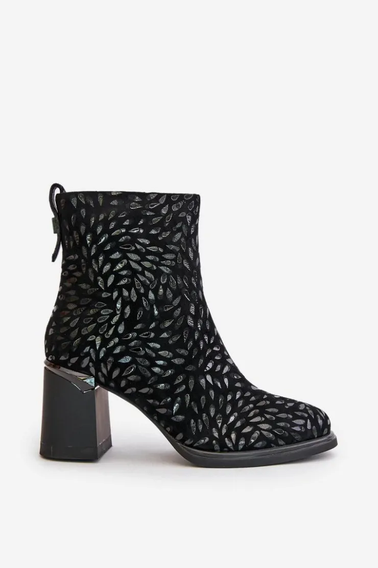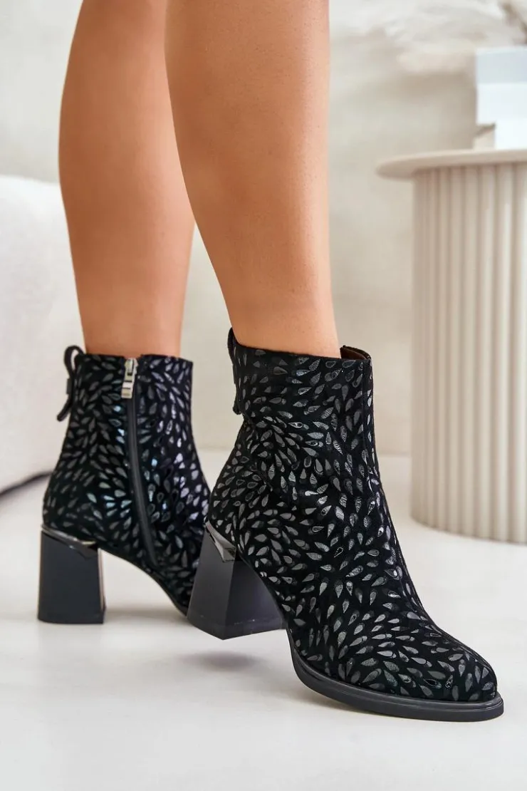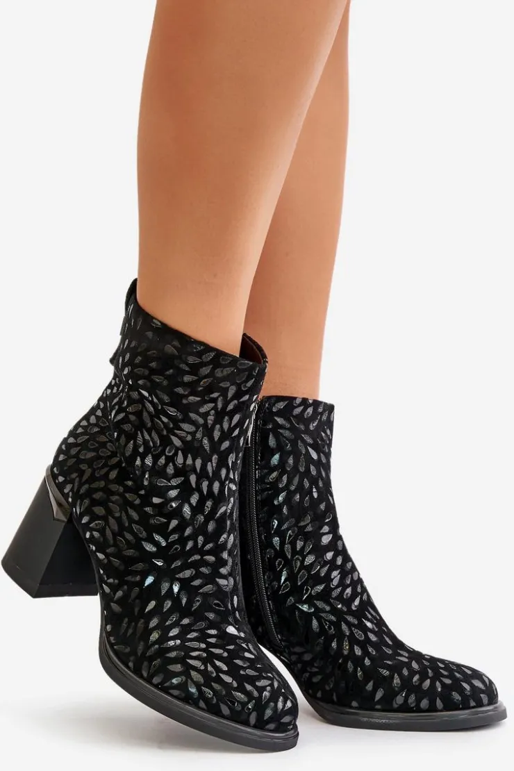 Eleganckie botki damskie wykonane naturalnego zamszu. Osadzone na obcasie w formie słupka. Głównym atutem tego modelu jest liczne tłocznie na cholewce. Noski zaokrąglone. Zapinane na zamek. Środek ocieplany kocem obuwniczym, co zapewni ciepło i komfort w chłodniejsze dni. Przy wyborze rozmiaru prosimy sugerować się tabelą rozmiarów.