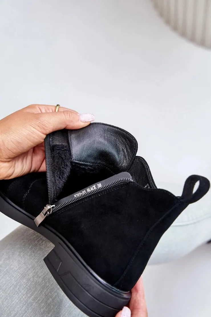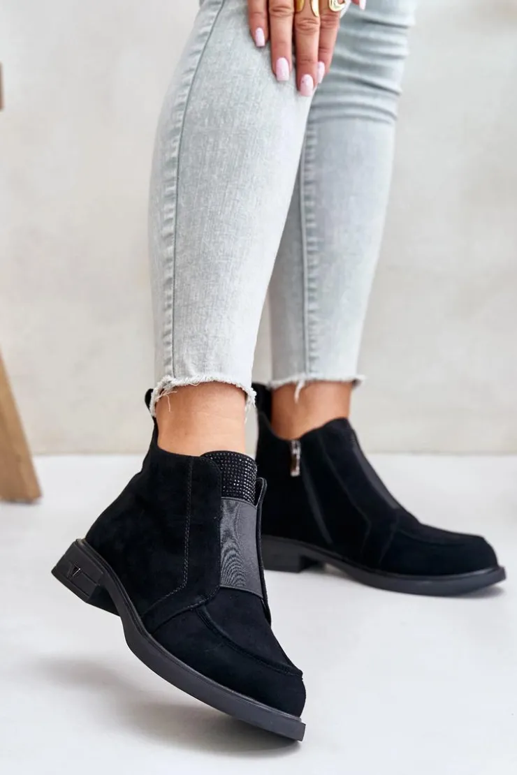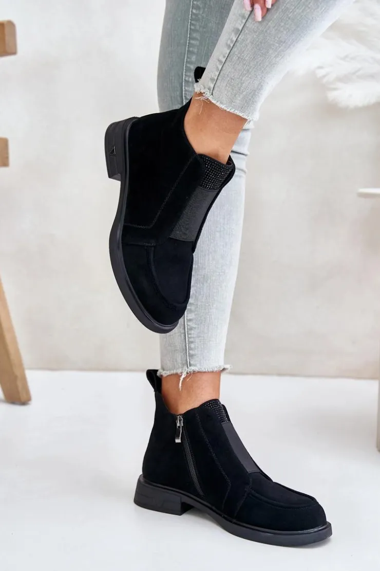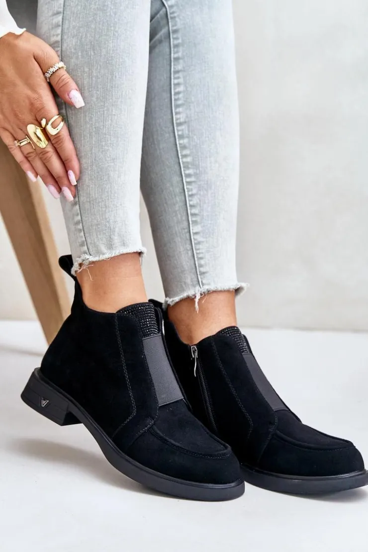 Botki damskie z niską cholewką do kostki. Wykonane z naturalnego zamszu. Osadzone na płaskim obcasie, który zapewni stabilność na każdym kroku. Noski zaokrąglone. Zapinanie na zamek ułatwia szybkie zakładanie i zdejmowanie obuwia. Model ten wyróżnia się elastyczną wstawką oraz zdobieniem na języku. Przy wyborze rozmiaru prosimy sugerować się tabelą rozmiarów.