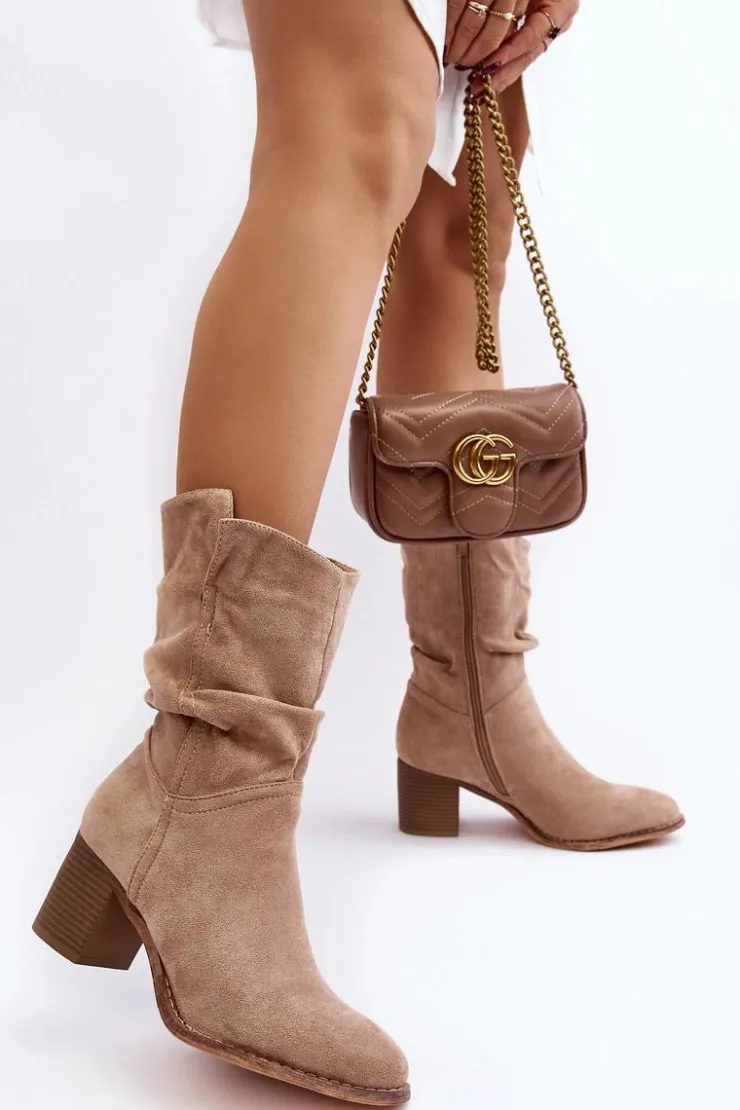 Damskie botki z marszczoną cholewką za kostkę. Wykonane z eko zamszu. Osadzone na obcasie w postaci słupka. Noski w migdał. Środek ocieplony kocem obuwniczym. Zapinane na suwak z boku. Model ten dopasujesz do wielu stylizacji. Koniecznie powinnaś je mieć! Przy wyborze rozmiaru prosimy sugerować się tabelą rozmiarów.