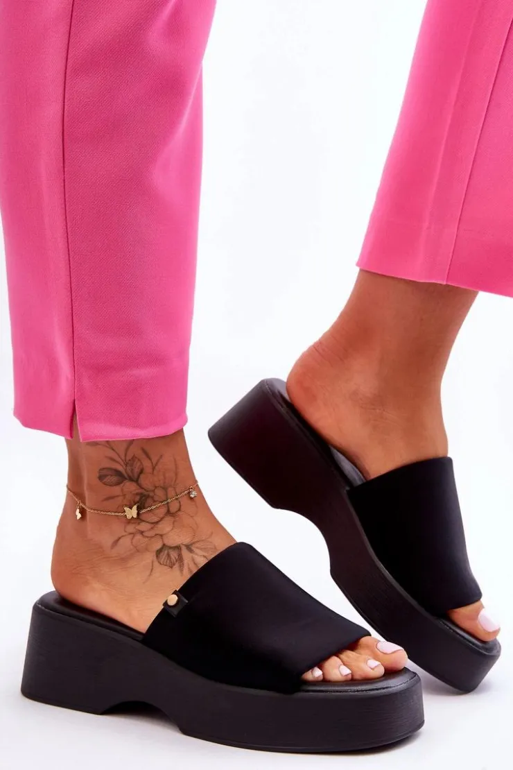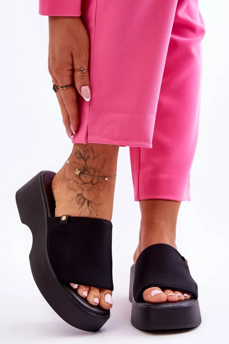 Klasyczne klapki osadzone na masywnej platformie i płaskim obcasie. Wykonane z wierzchu z materiału tekstylnego. Posiadają delikatne zdobienie. Miękka wkładka zapewni wygodne użytkowanie obuwia nawet przez cały dzień. Klasyczny fason z odkrytym, kwadratowym noskiem. Świetnie sprawdzą się do wielu stylizacji! Przy wyborze rozmiaru prosimy kierować się tabelą rozmiarów.