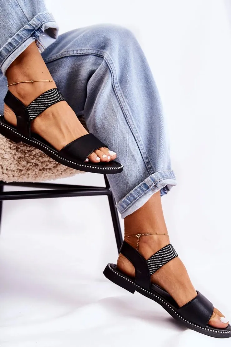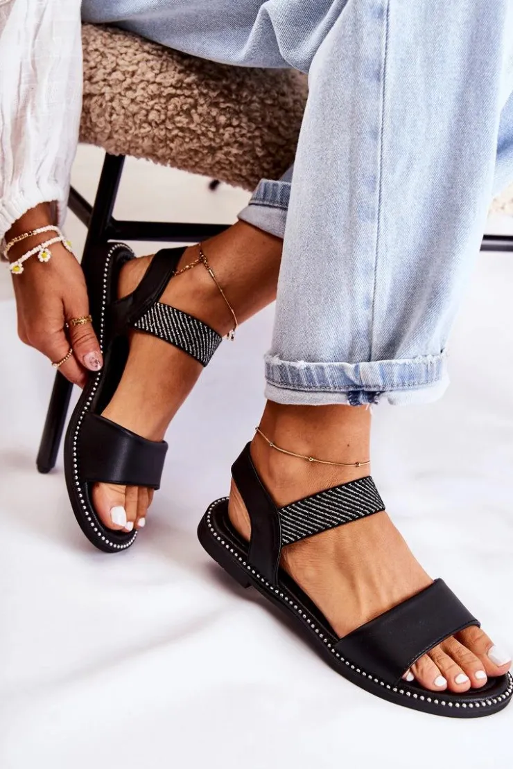 Idealne sandały na upalne dni! Klasyczny, wsuwany model. Buty wykonane z eko skóry. Dodatkowo posiadają ściągacz, dzięki któremu buty odpowiednio dopasują się do tęgości nogi. Wkładka jest miękka i wygodna w użytkowaniu. Buty osadzone na płaskim obcasie, z podeszwą antypoślizgową. Dodatkowo sandałki są przyozdobione dżetami. Nosek odkryty, zaokrąglony. Świetnie sprawdzą się podczas codziennego użytkowania. Przy wyborze rozmiaru prosimy kierować się tabelą rozmiarów.