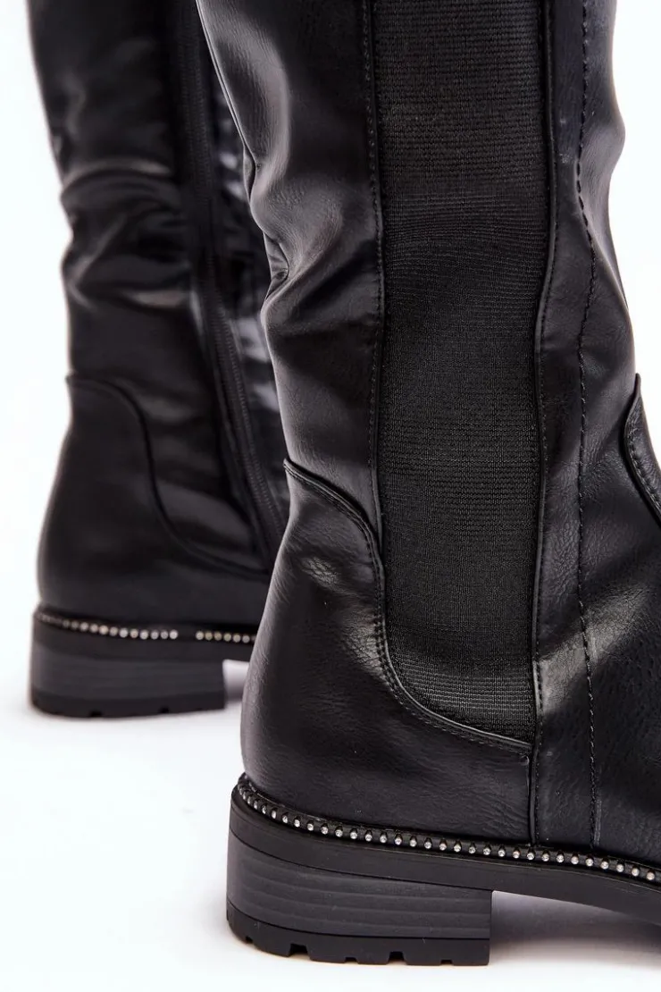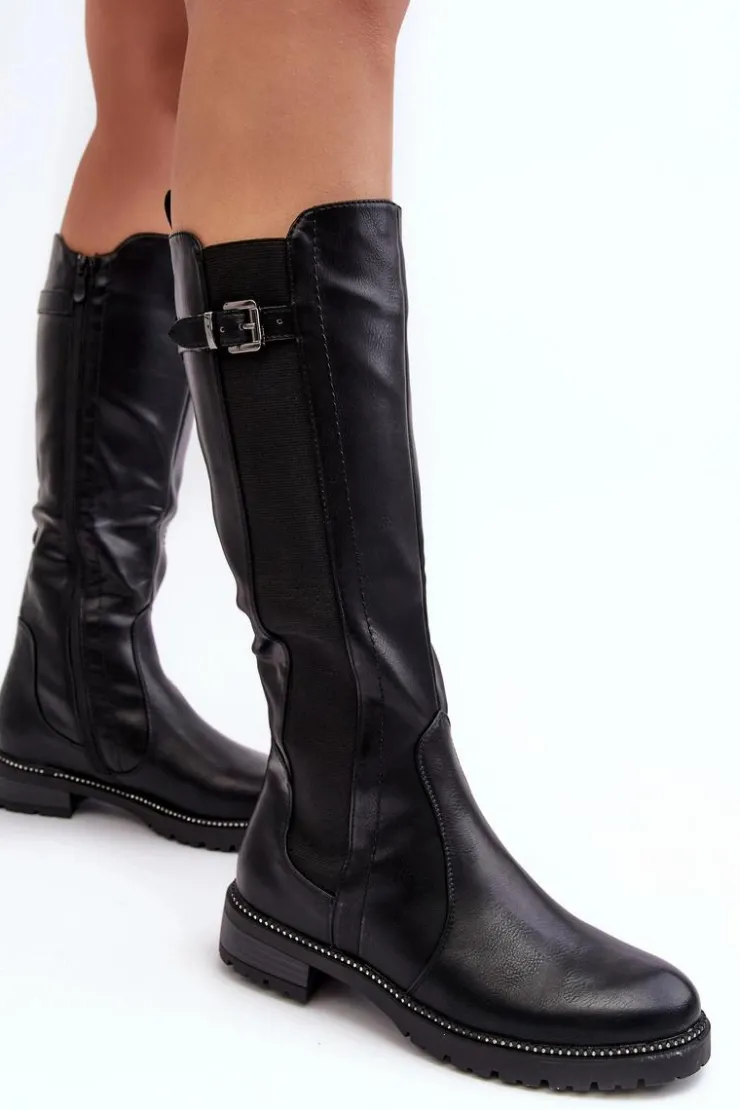 Damskie kozaki wykonane z eko skóry. Osadzone na płaskim, stabilnym obcasie. Zapinane suwakiem. Na cholewce elastyczna wstawka oraz pasek z klamrą. Noski zaokrąglone. Klasyczny fason sprawdzi się do wielu stylizacji! Środek ocieplony kocem obuwniczym. Przy wyborze rozmiaru prosimy kierować tabelą rozmiarów.