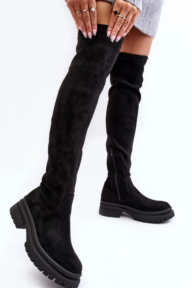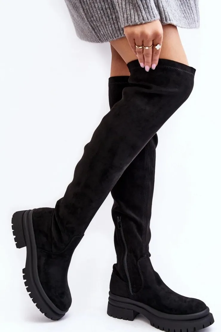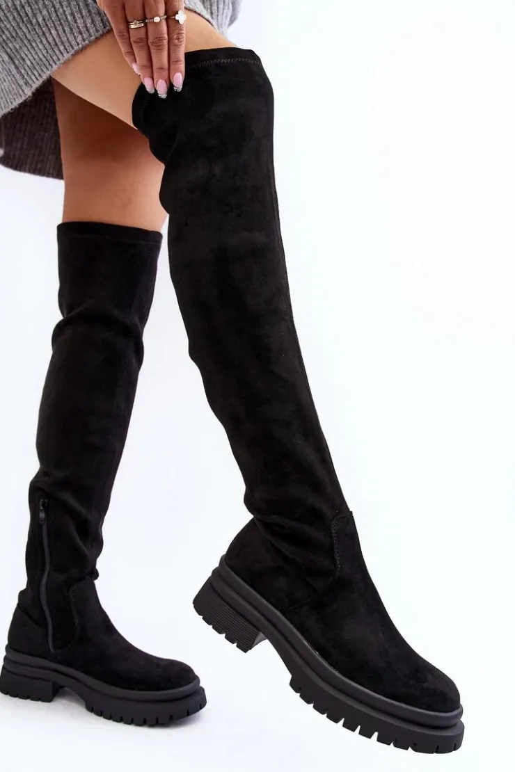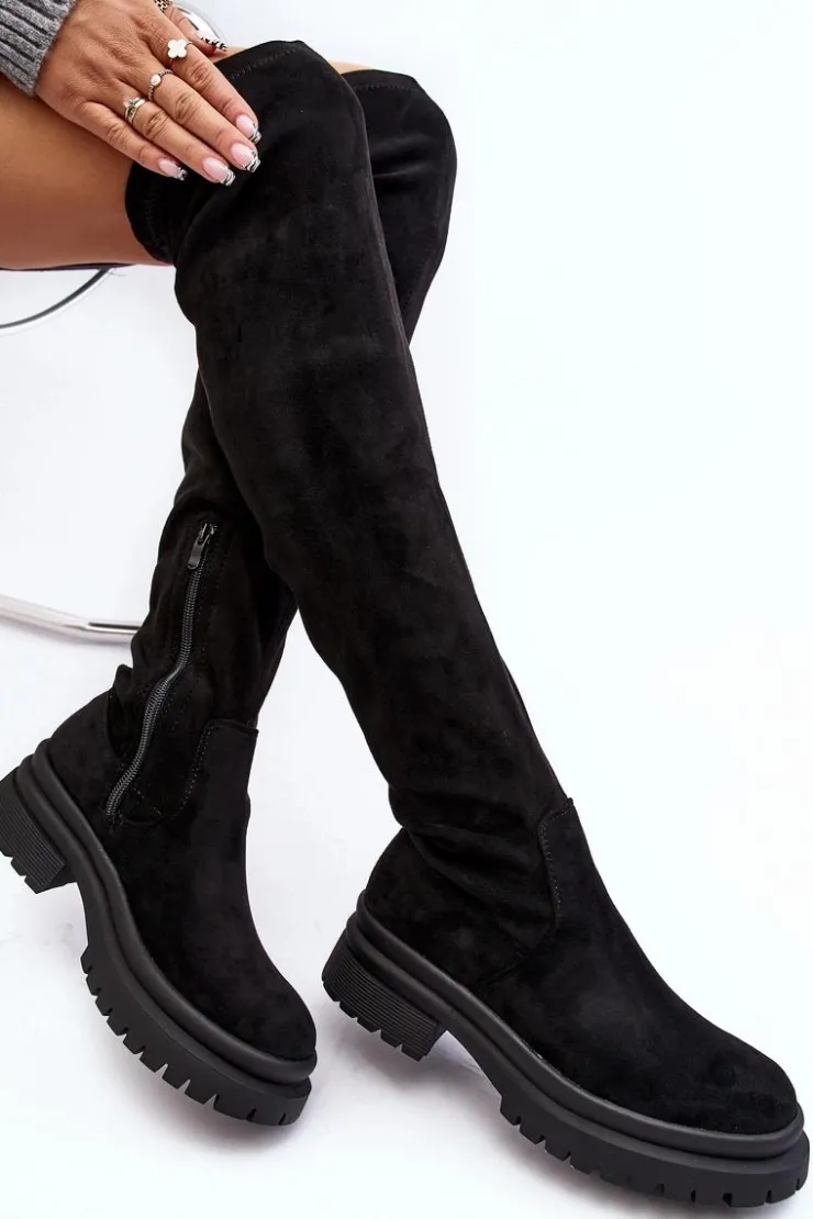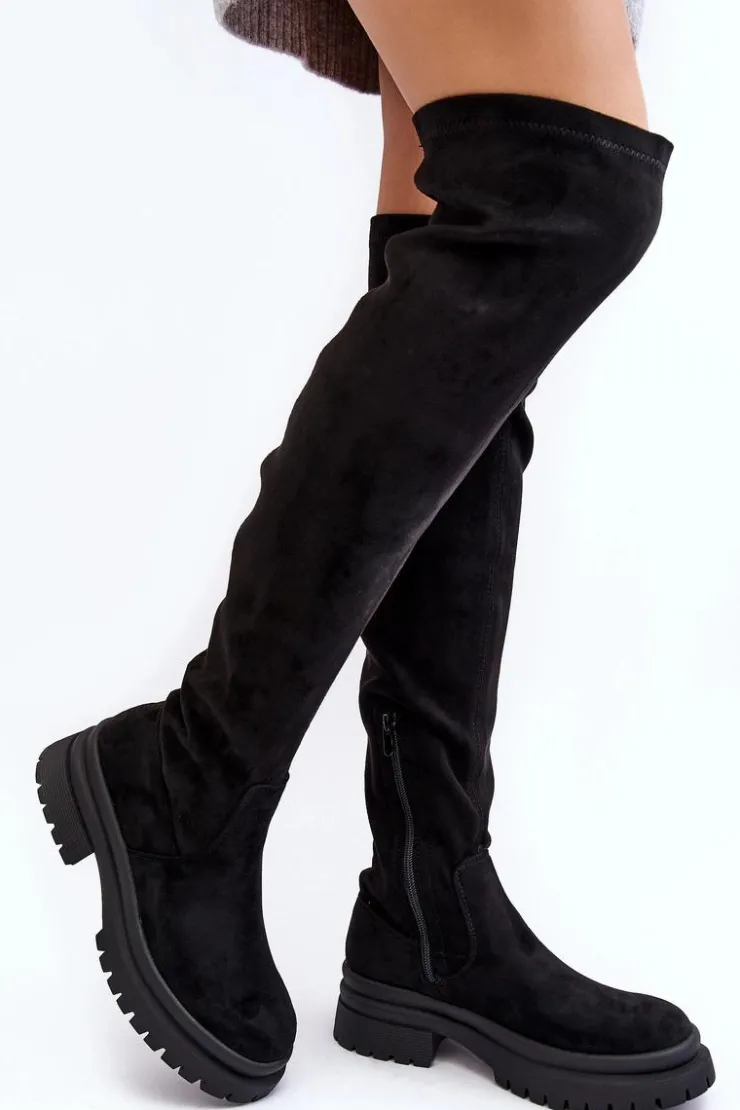 Damskie kozaki z cholewką za kolano. Wykonane z eko zamszu. Osadzone na masywnej podeszwie i płaskim obcasie. Noski zaokrąglone. Usztywniony zapiętek. Wkładka lekko ocieplona kocem obuwniczym. Klasyczny fason sprawdzi się do wielu jesienno-zimowych stylizacji! Przy wyborze rozmiaru prosimy kierować tabelą rozmiarów.