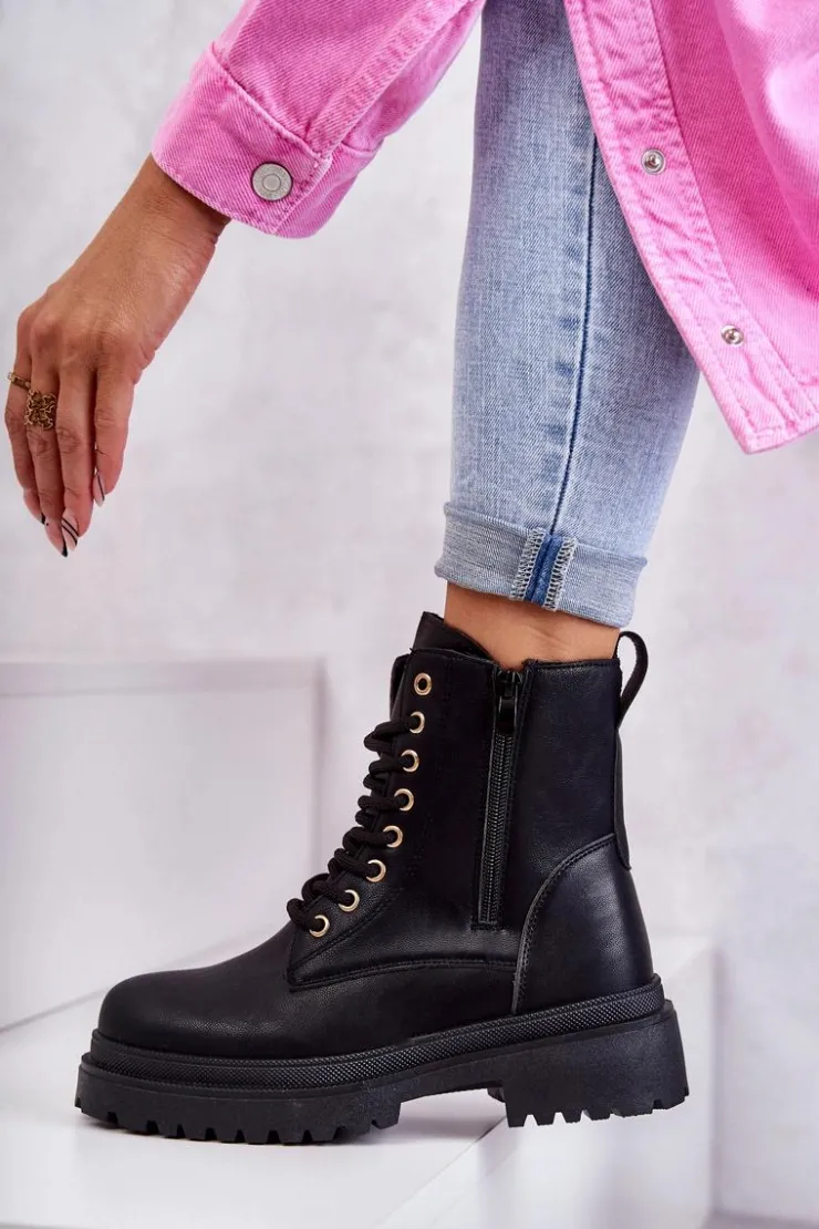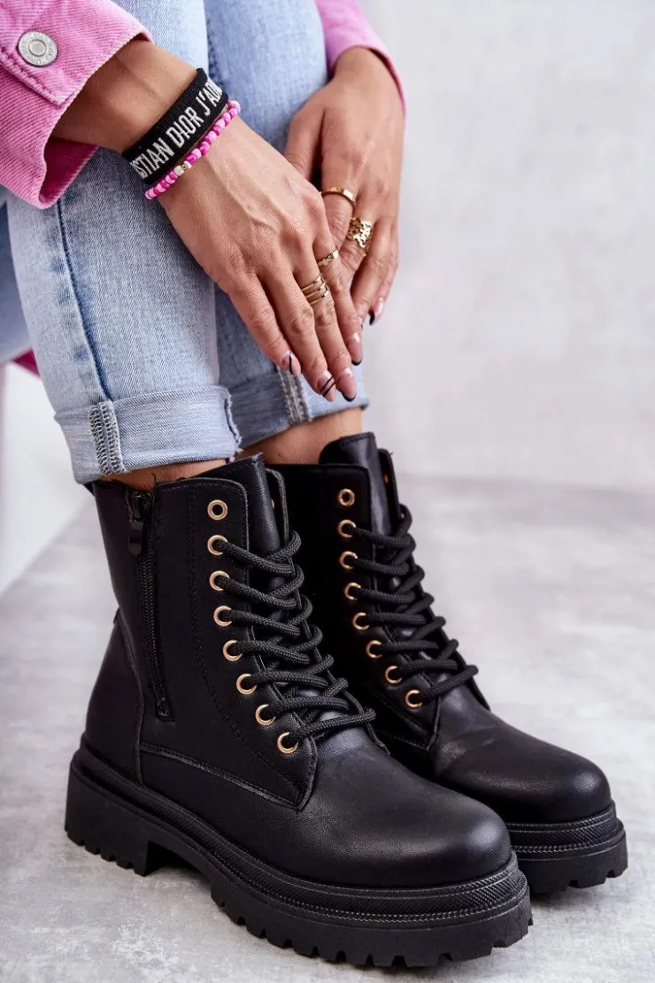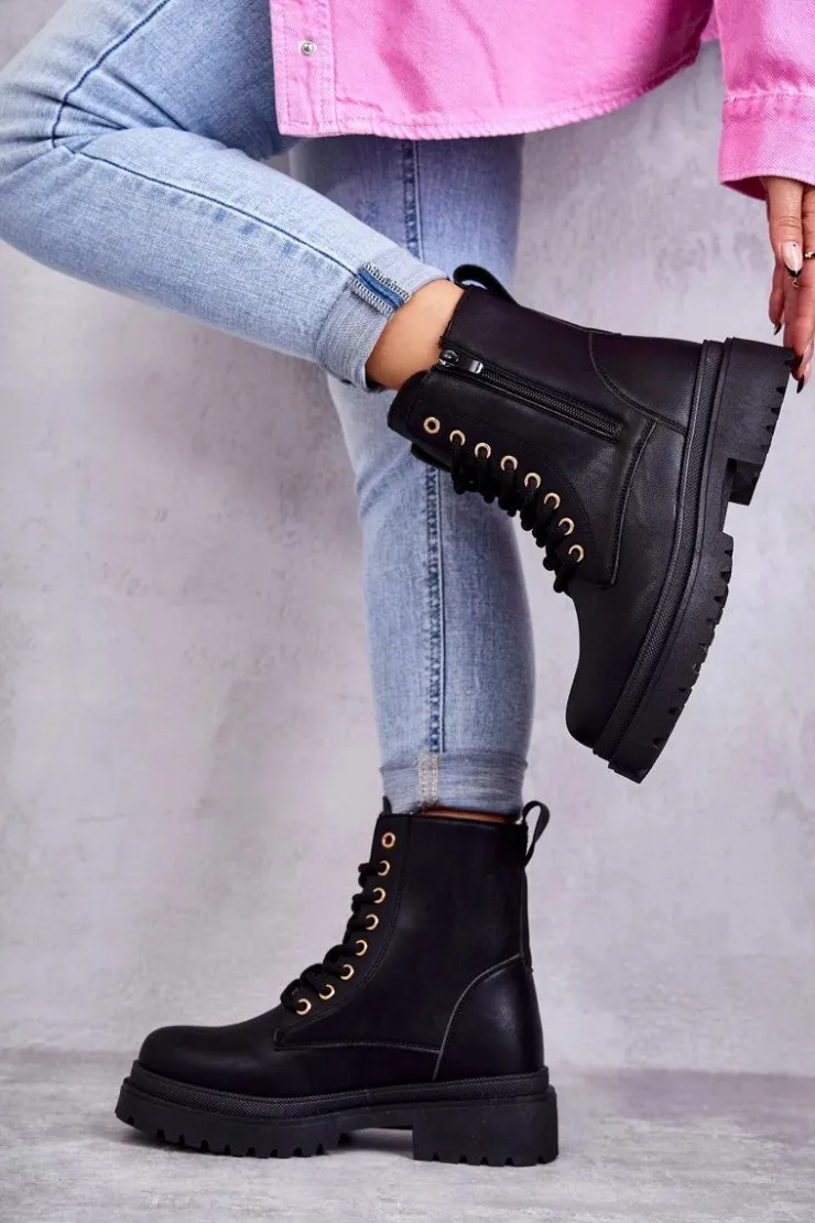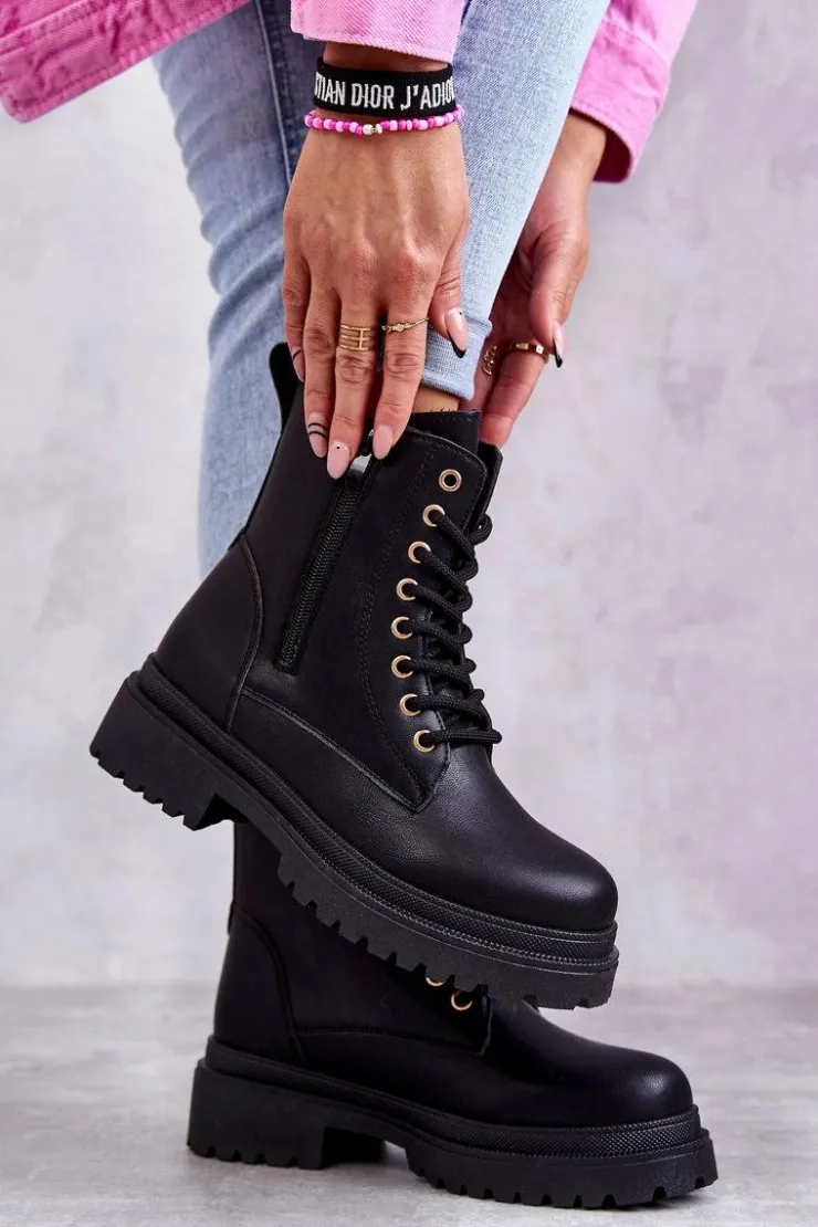 Piękne, damskie botki wykonane z eko skóry. Posiadają solidne sznurowanie z przodu oraz suwak ułatwiający zakładanie obuwia po boku cholewki. Osadzone na platformie i płaskim obcasie ze żłobieniami. Zostały ocieplone w środku kocem obuwniczym. Klasyczny fason, idealny do wielu stylizacji, który powinnaś mieć w swojej szafie! Przy wyborze rozmiaru prosimy sugerować się tabelą rozmiarów.