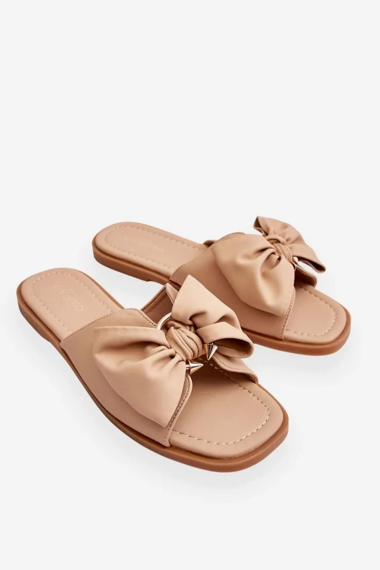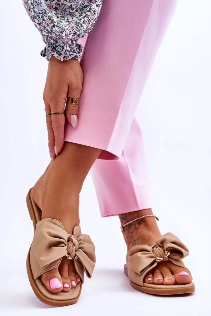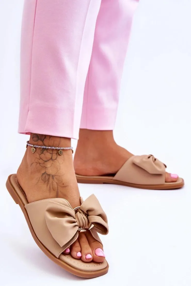 Damskie klapki o klasycznym fasonie. Wykonane z eko skóry. Modna kokarda z ozdobą na przodzie sprawia, że klapki wyglądają niesamowicie! Miękka wkładka jest wygodna w użytkowaniu i została także wykonana z eko skóry. Nosek odkryty, kwadratowy. Klapki zostały osadzone na płaskim obcasie. Modne i komfortowe w użytkowaniu — po prostu musisz je mieć. Przy wyborze rozmiaru prosimy sugerować się tabelą rozmiarów.