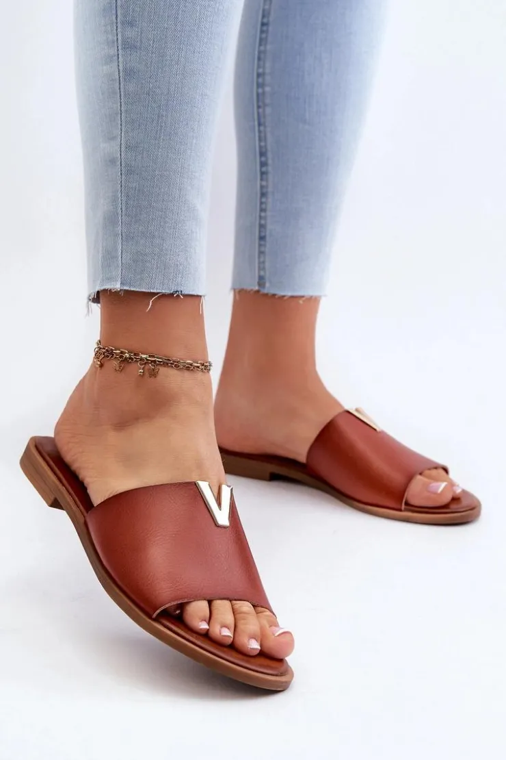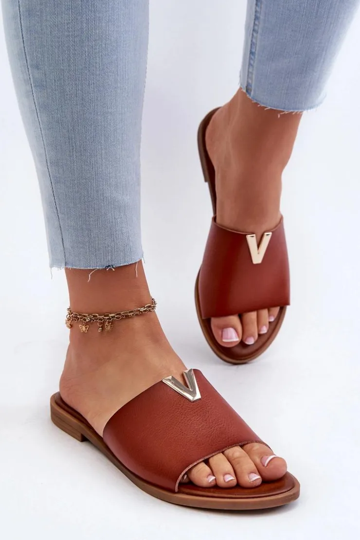Klapki damskie wykonane ze skóry ekologicznej. Złoty element doda blasku Twojej letniej stylizacji. Osadzone na płaskim obcasie. Model ten będzie idealnym wyborem na wiele okazji! Przy wyborze rozmiaru prosimy sugerować się tabelą rozmiarów.