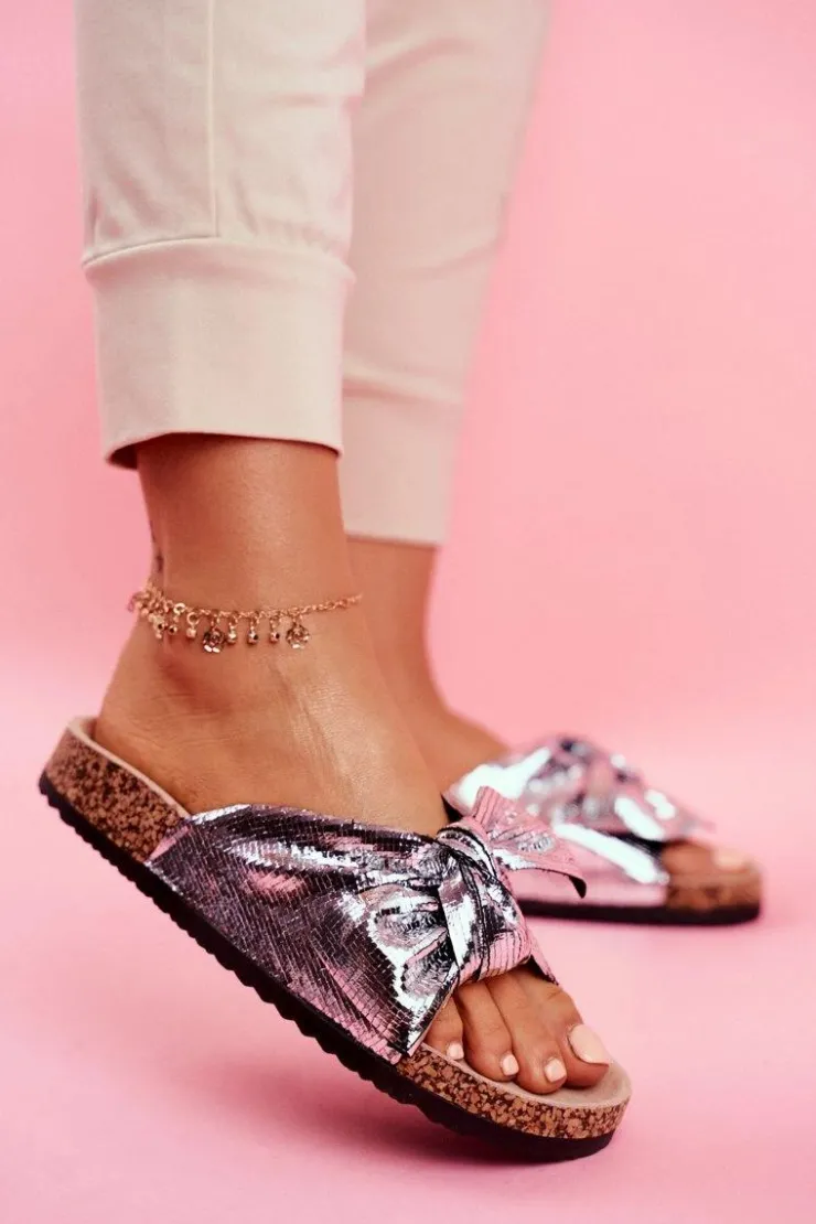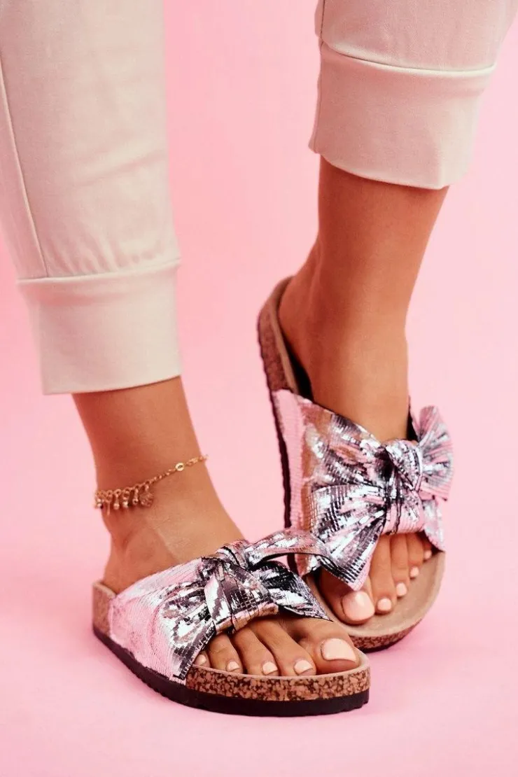 Damskie Evento Klapki Damskie z Dużą Kokardą Srebrne Lovely Time