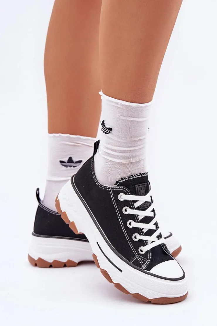 Trampki damskie wykonane z materiału tekstylnego. Osadzone na masywnej platformie, która unosi sylwetkę, a także nadaje każdej stylizacji niepowtarzalny charakter. Ten model jest niezbędny dla każdej kobiety pragnącej połączyć wygodę z modnym wizerunkiem. Przy wyborze rozmiaru prosimy sugerować się tabelą rozmiarów.