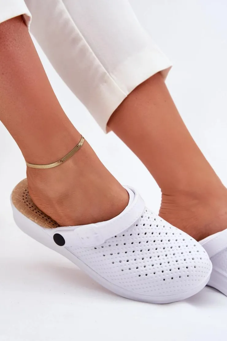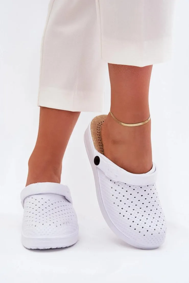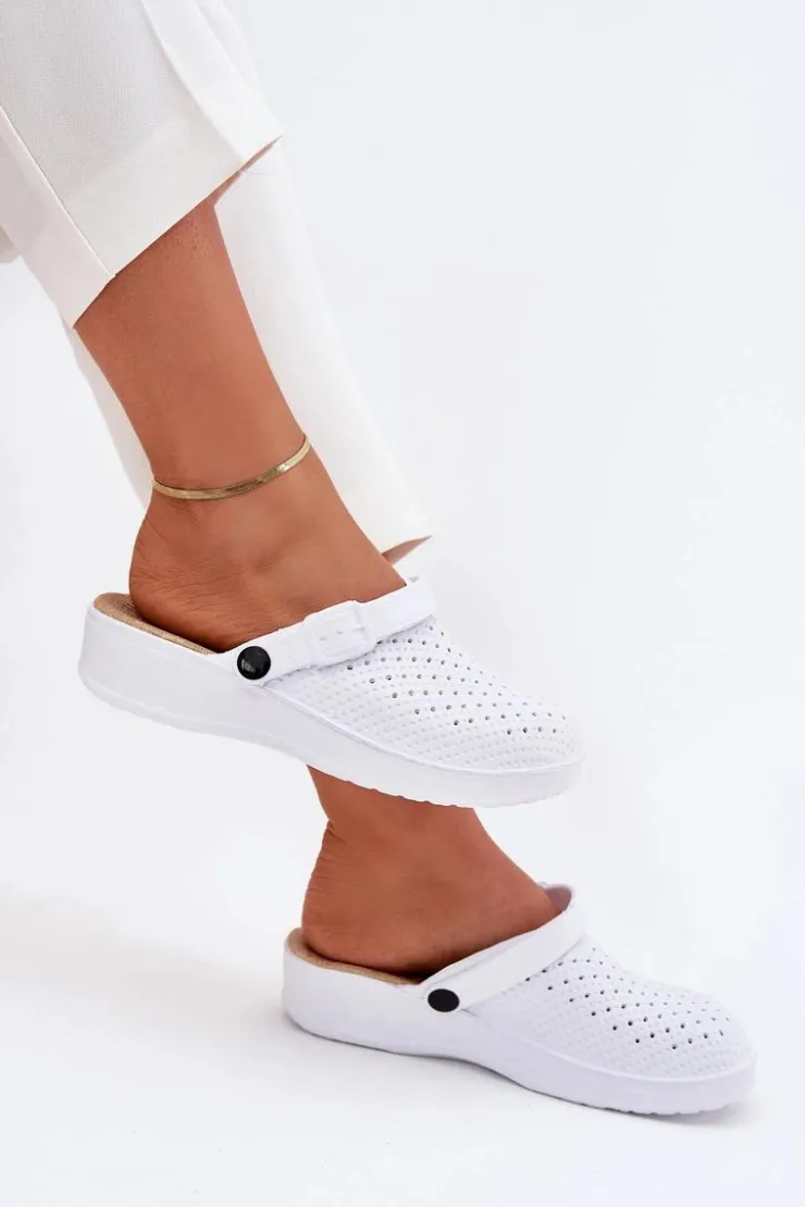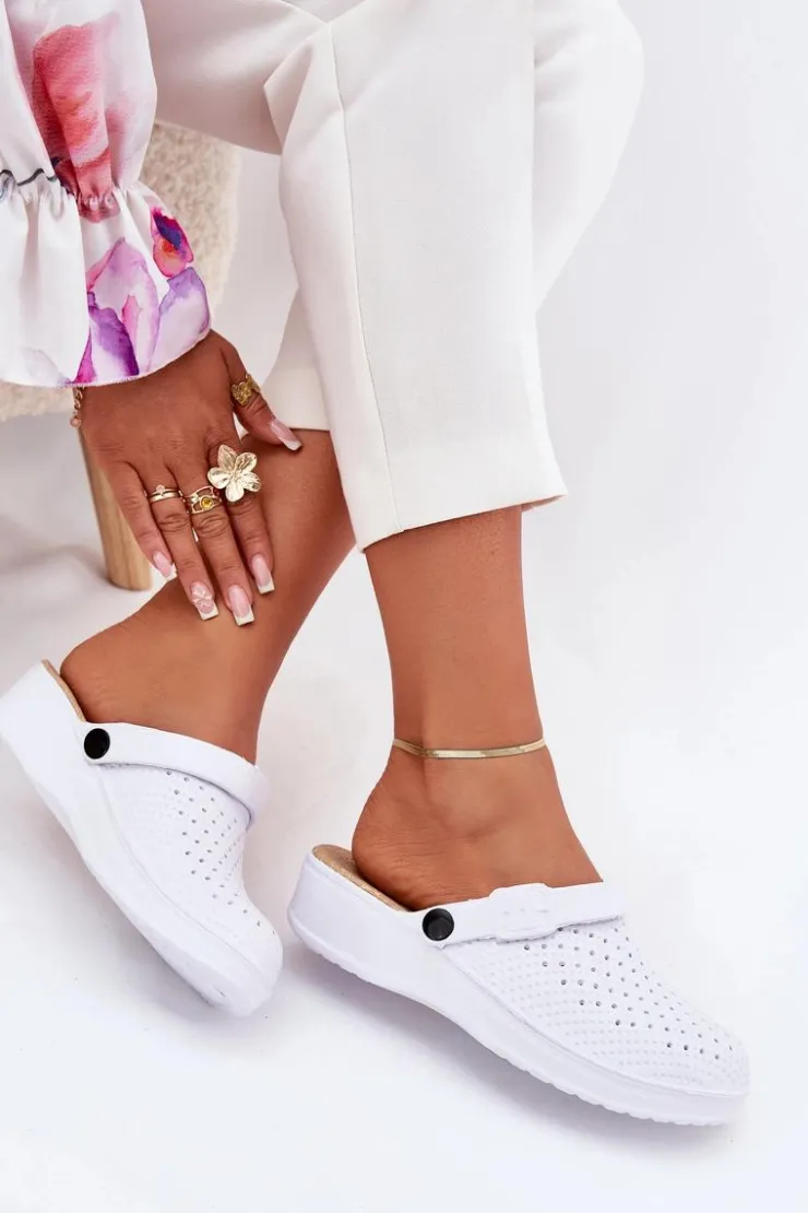 Klapki damskie z piankowego tworzywa, osadzone na delikatnym koturnie. Model ten wyróżnia ruchomy pasek, który można nosić zarówno na pięcie, jak i z przodu, co daje możliwość dostosowania butów do własnych preferencji. Zakryte noski. Lekkie i wygodne, świetnie sprawdzą się na basenie, podczas wakacyjnych wyjazdów, lub dni spędzonych w ogrodzie. Przy wyborze rozmiaru prosimy kierować się tabelą rozmiarów.