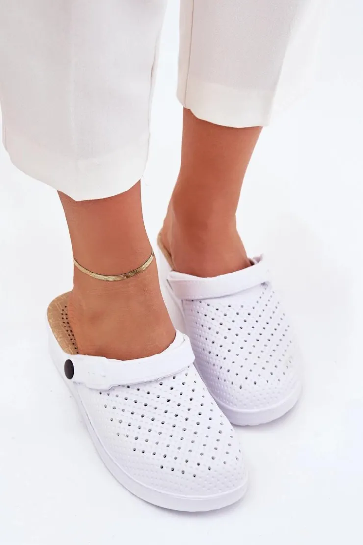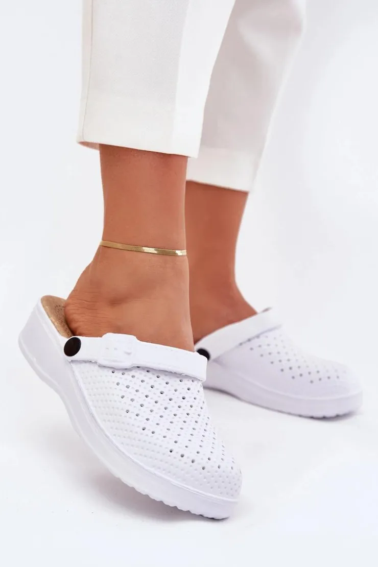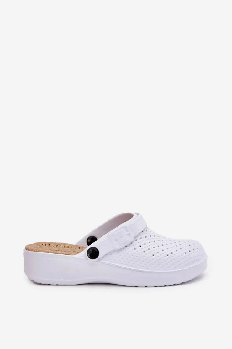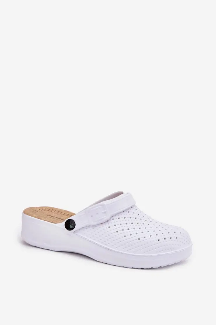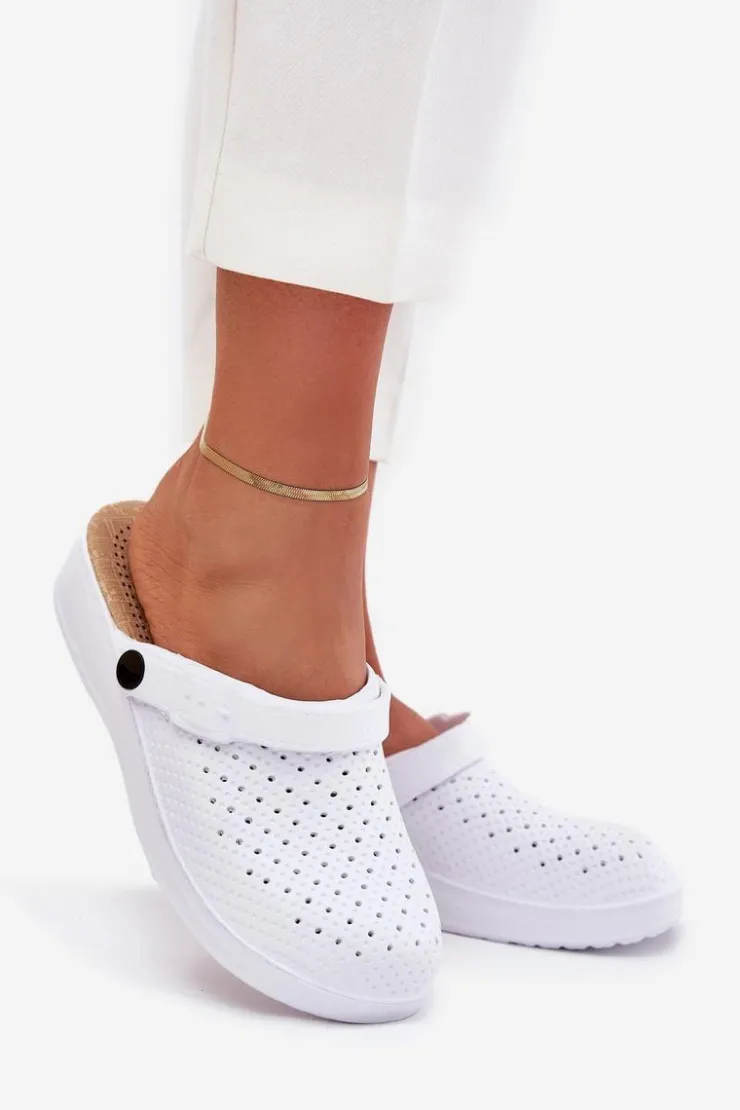 Klapki damskie z piankowego tworzywa, osadzone na delikatnym koturnie. Model ten wyróżnia ruchomy pasek, który można nosić zarówno na pięcie, jak i z przodu, co daje możliwość dostosowania butów do własnych preferencji. Zakryte noski. Lekkie i wygodne, świetnie sprawdzą się na basenie, podczas wakacyjnych wyjazdów, lub dni spędzonych w ogrodzie. Przy wyborze rozmiaru prosimy kierować się tabelą rozmiarów.