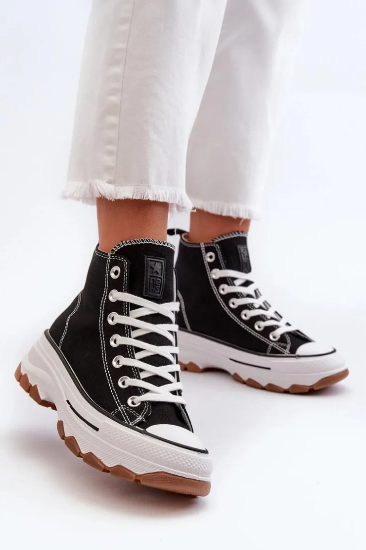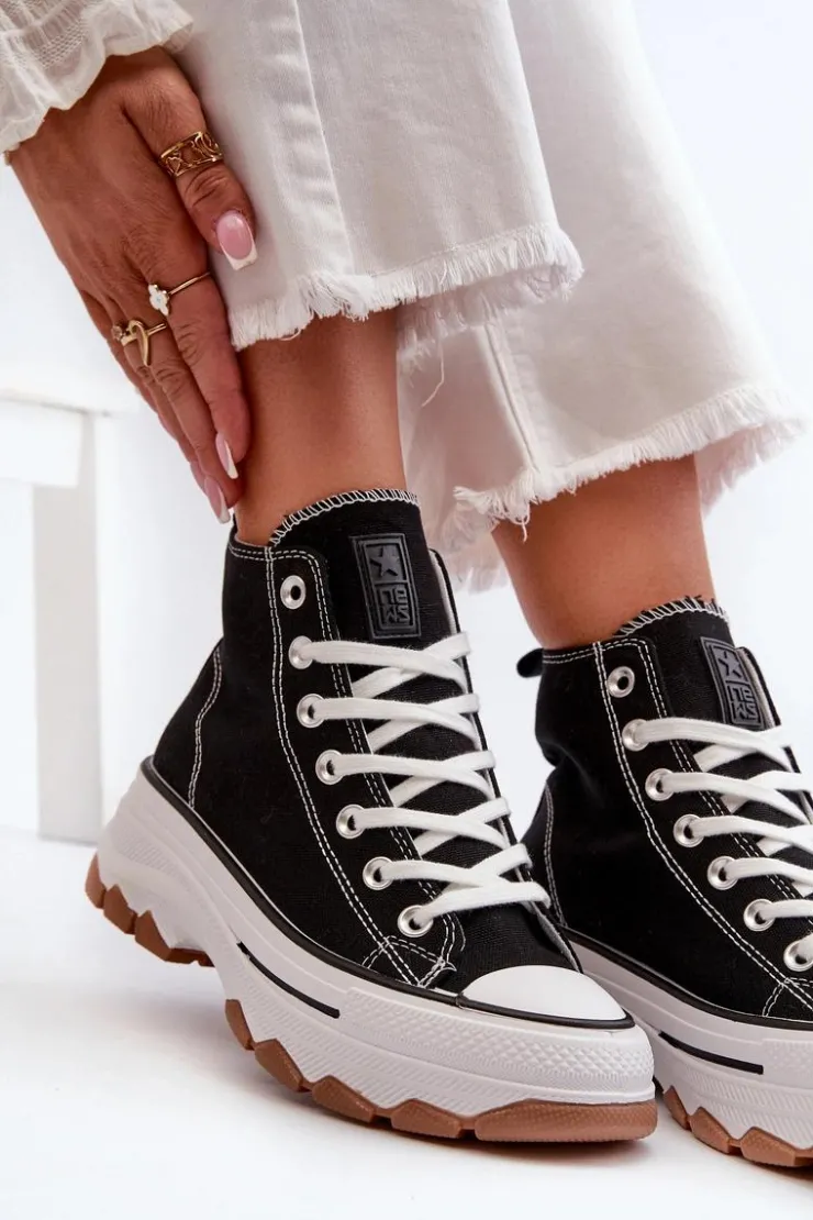 Wysokie trampki damskie na platformie to doskonały wybór dla modnych kobiet. Podwyższona podeszwa dodaje nie tylko centymetrów, ale także oryginalnego wyglądu każdej stylizacji. Wykonane z materiału tekstylnego. Model ten to must-have dla każdej kobiety, która chce połączyć komfort z modnym wyglądem. Przy wyborze rozmiaru prosimy sugerować się tabelą rozmiarów.