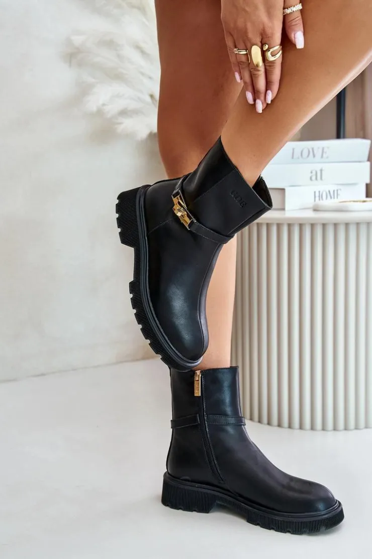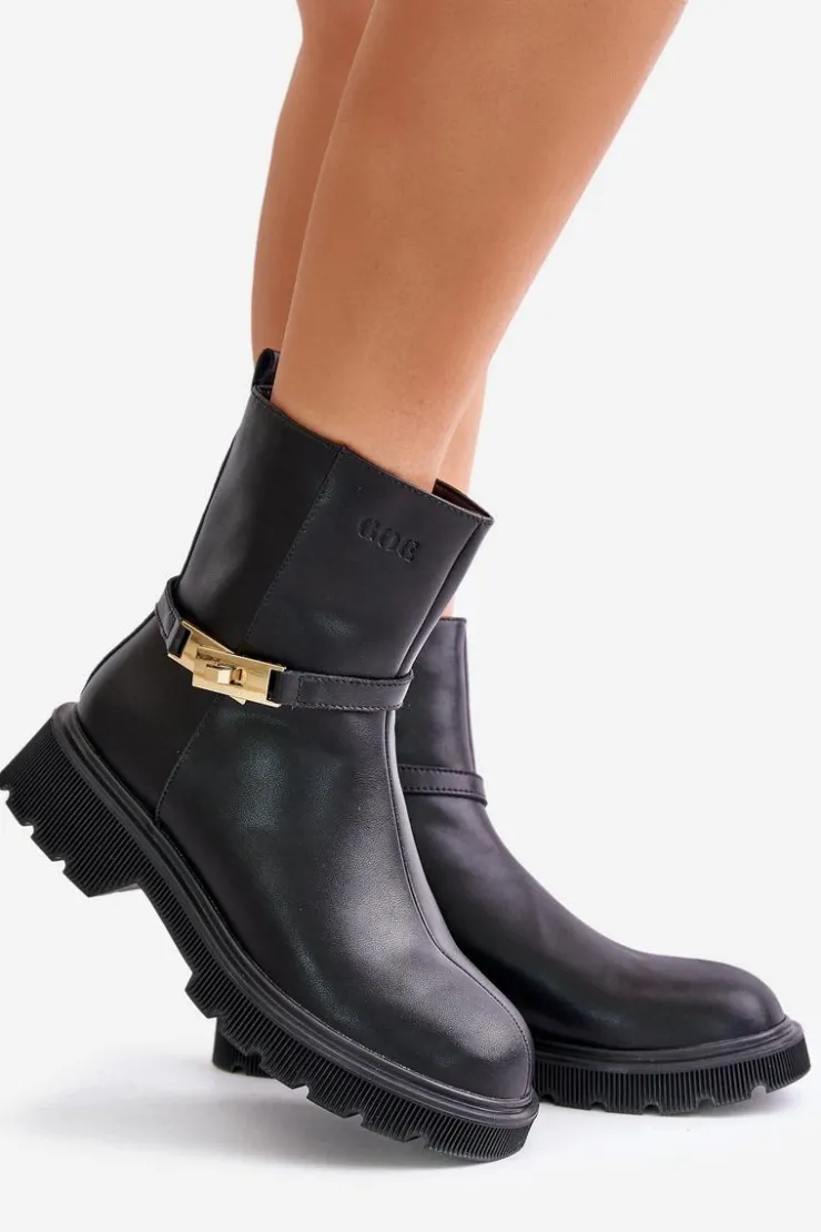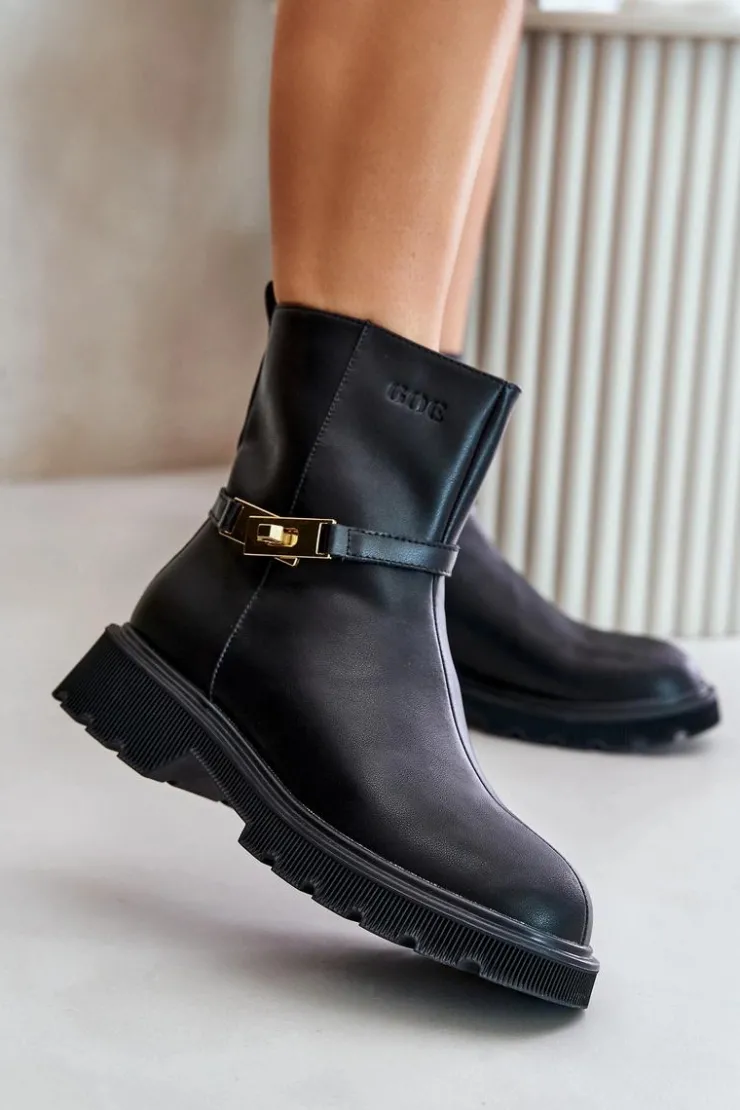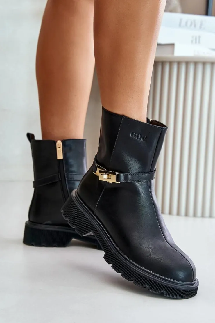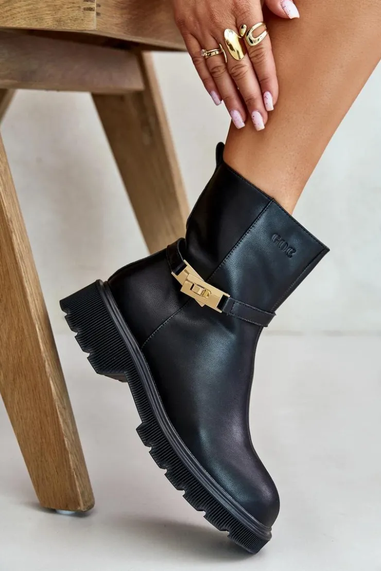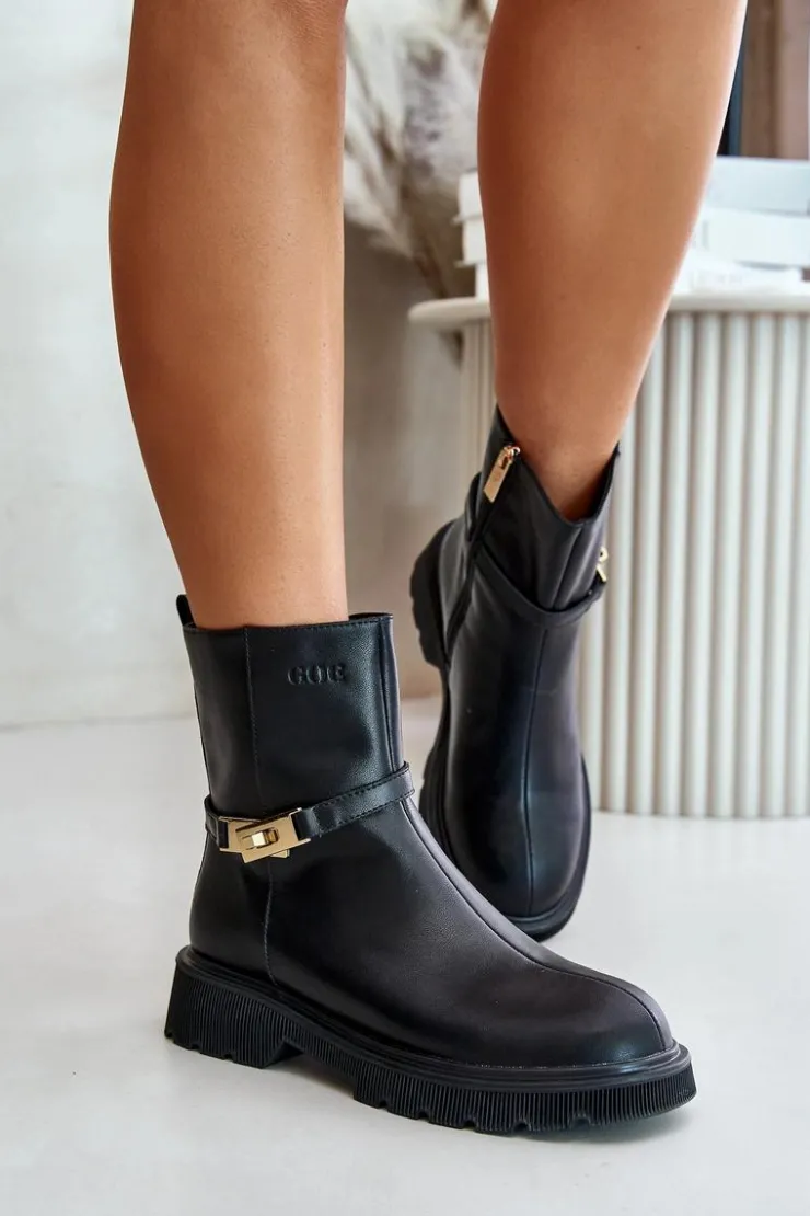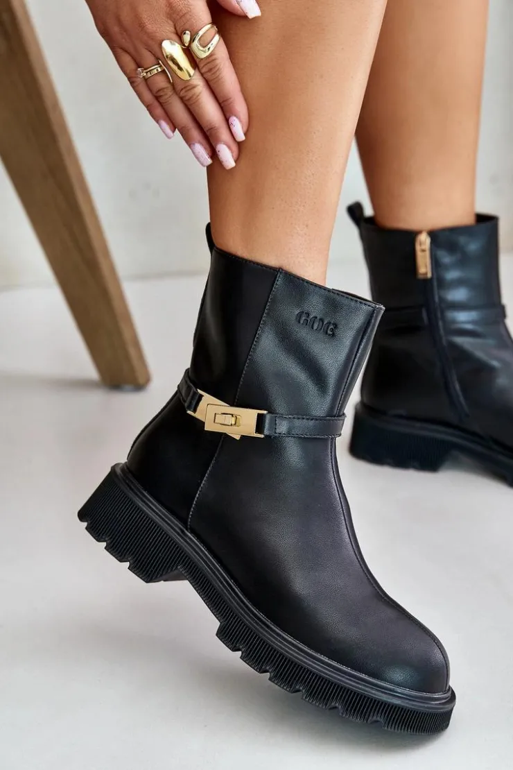 Damskie GOE Skórzane Botki Damskie Z Paskiem Ocieplane OO2N4150 Czarne
