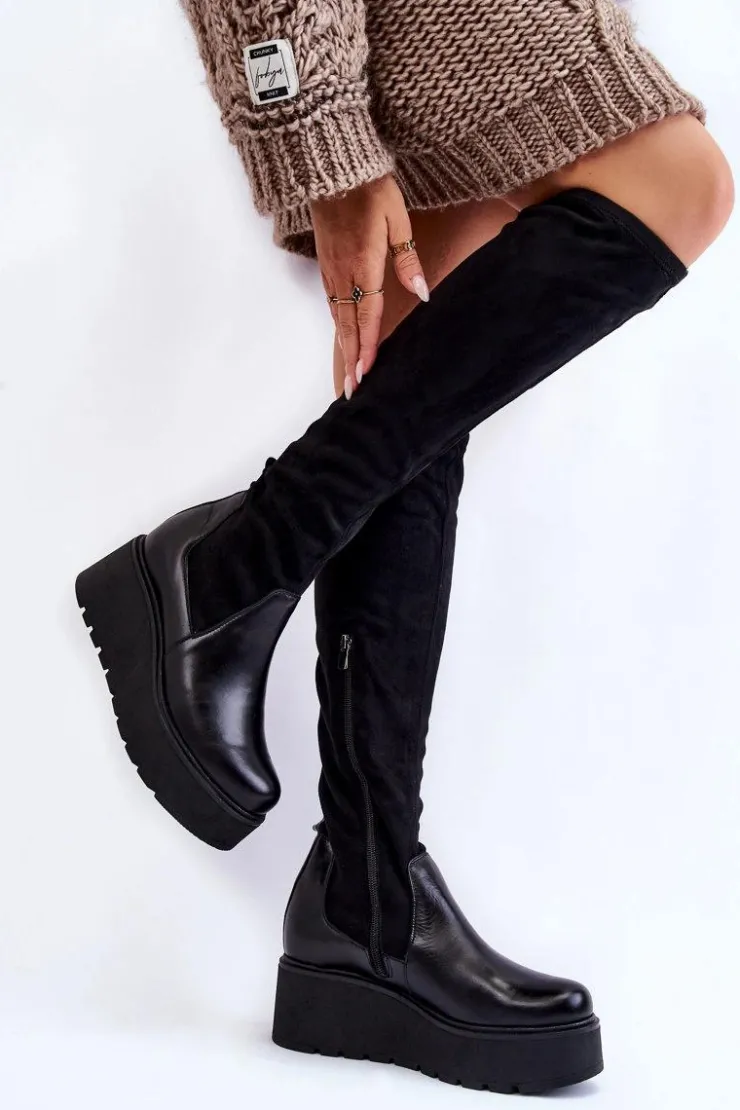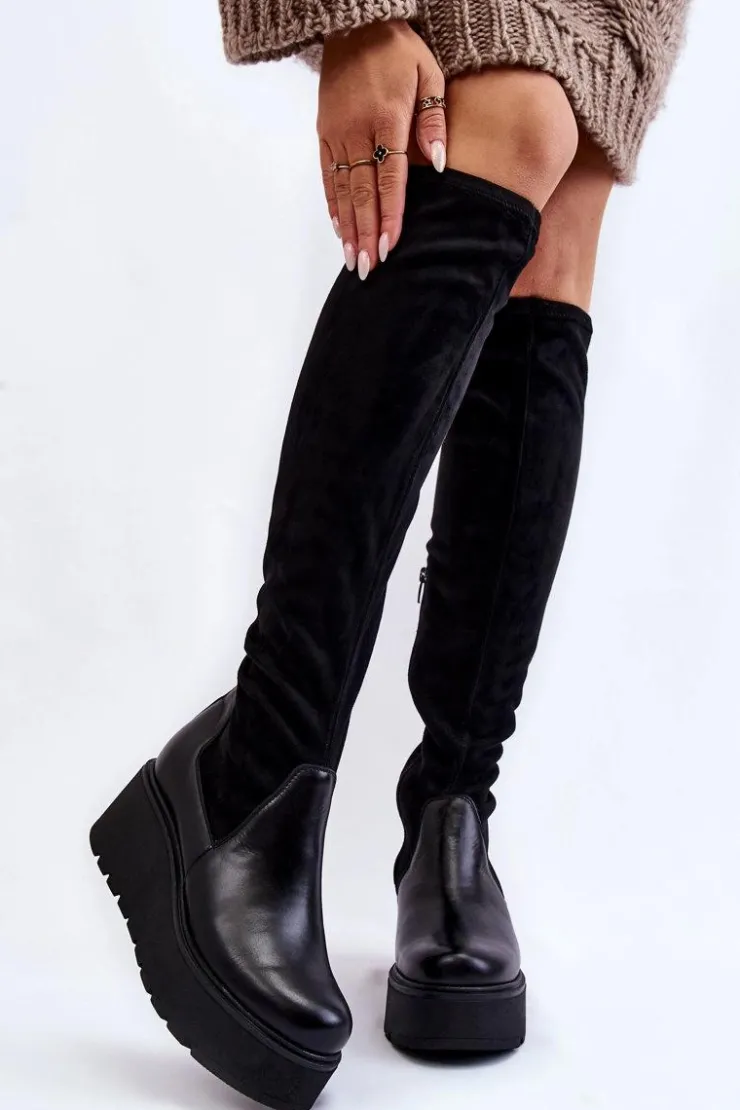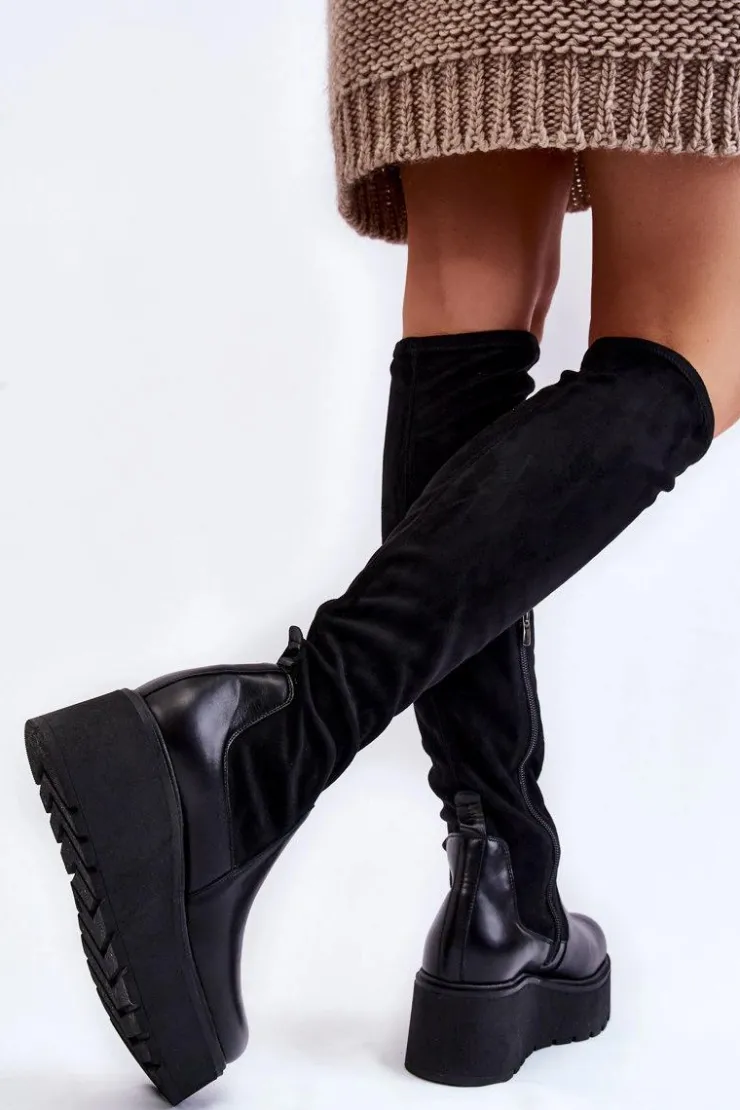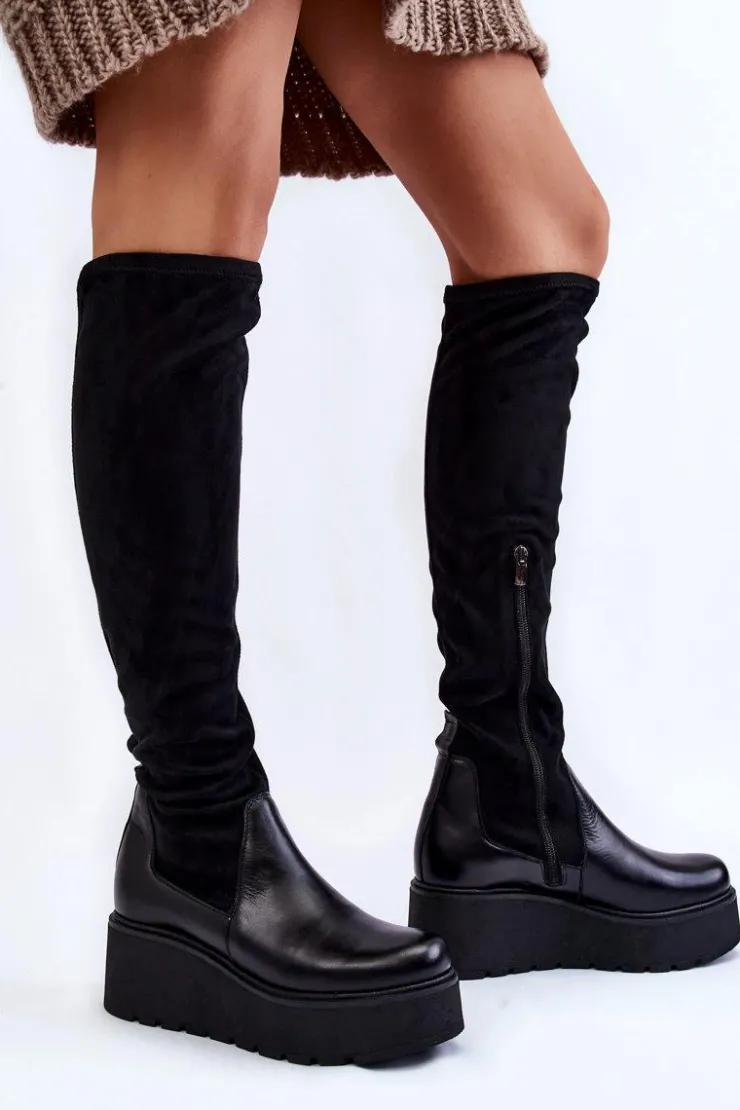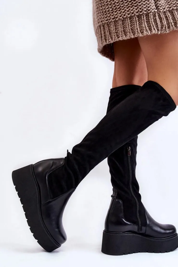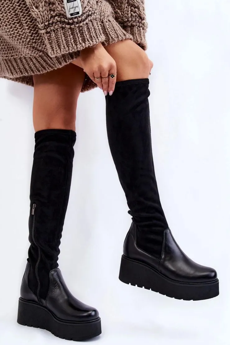 Damskie kozaki marki Laura Messi zostały wykonane z połączenia naturalnej skóry oraz materiału tekstylnego. Model ten posiada skórzaną wkładkę oraz usztywniany zapiętek. Kozaki są wsuwane, z dodatkowym suwakiem z boku cholewki. Osadzone na koturnie oraz masywnej platformie. Podeszwa wykonana z gumowego tworzywa jest antypoślizgowa. Przy wyborze rozmiaru prosimy sugerować się tabelą rozmiarów.