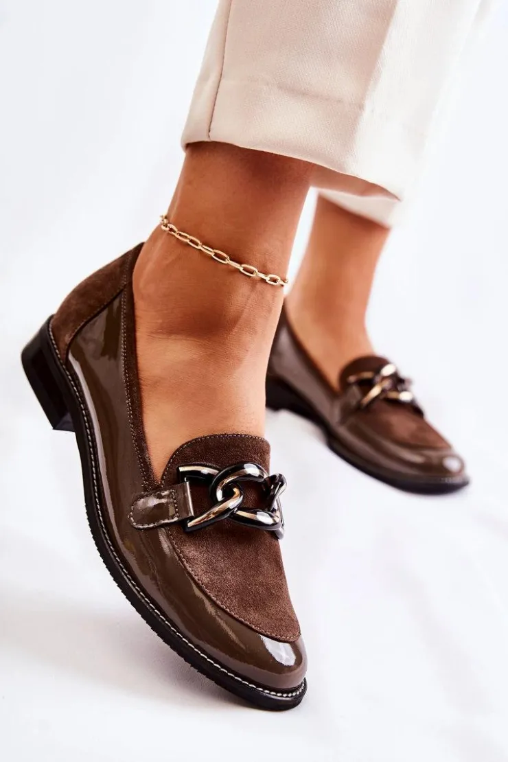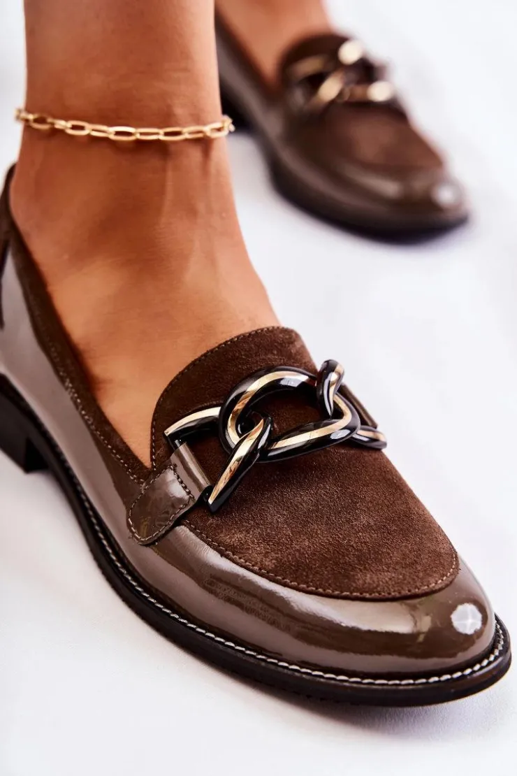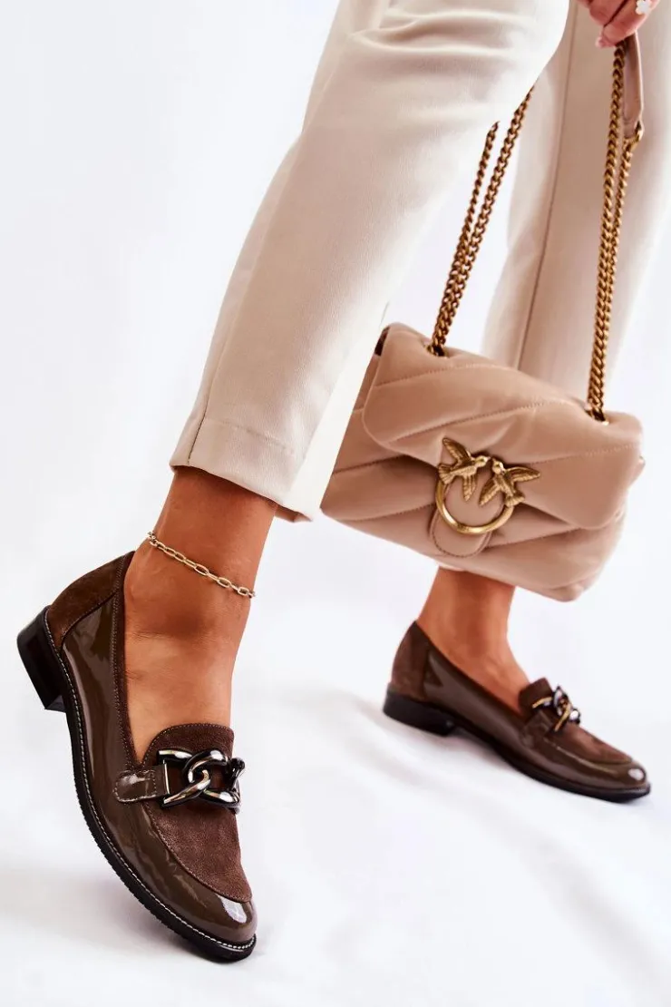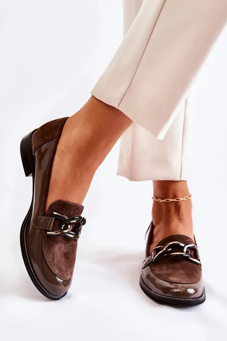 Eleganckie mokasyny od marki Laura Messi zostały wykonane z połączenia naturalnej skóry i naturalnego zamszu. Skórzana wkładka zapewni wysoki komfort użytkowania. Osadzone na płaskim obcasie z przeszywaną podeszwą. Buty te posiadają modny łańcuch na przodzie. Nosek zaokrąglony. Mokasyny posiadają usztywniany zapiętek. Koniecznie sprawdź całą naszą kolekcję mokasyn! Przy wyborze rozmiaru prosimy sugerować się tabelą rozmiarów.
