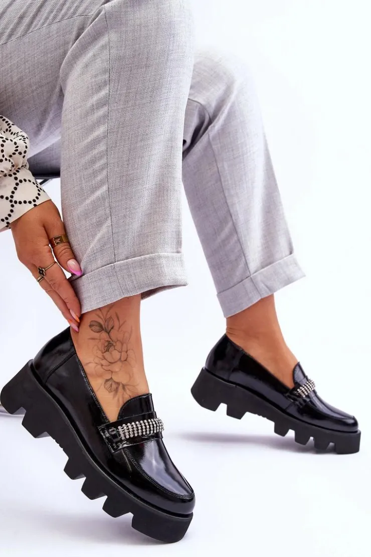 Modne, damskie mokasyny zostały osadzone na płaskim obcasie i platformie ze żłobieniami. Ozdobione z przodu łańcuszkiem z dżetami. Cholewka wraz z wkładką zostały wykonane z naturalnej skóry. Wkładka jest niezwykle miękka i zapewni wygodę podczas użytkowania. Zapiętek w tych mokasynach jest usztywniany. Idealny model na sezon wiosenno-jesienny! Przy wyborze rozmiaru prosimy sugerować się tabelą rozmiarów.