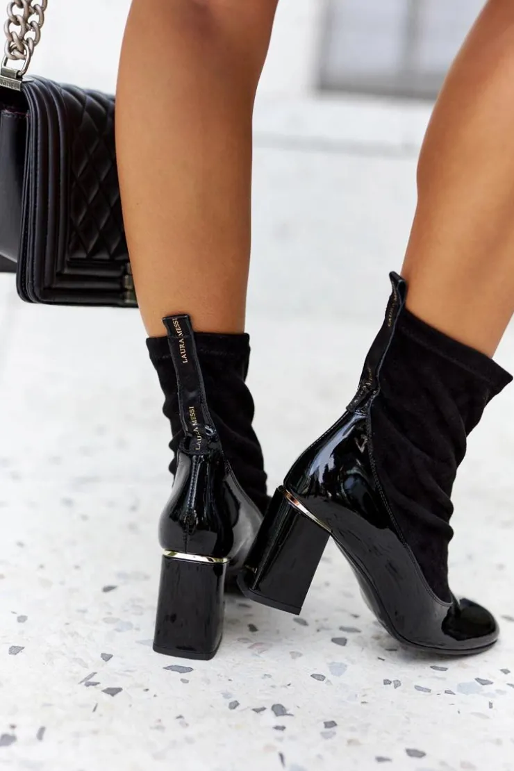 Wyjątkowe botki wykonane ze skóry naturalnej, częściowo lakierowane. Wysoka cholewka wysmukli nogi. Obcas w postaci słupka jest przyozdobiony elementem dekoracyjnym. Z tyłu cholewki widnieje napis marki Laura Messi. Nosek typu migdał. Koniecznie musisz je mieć !Przy wyborze rozmiaru prosimy sugerować się tabelą rozmiarów.