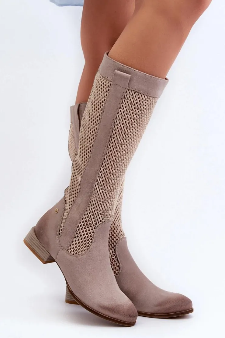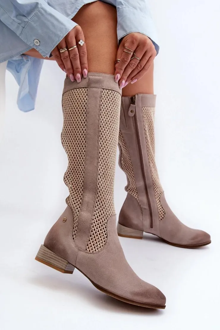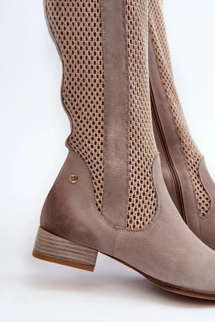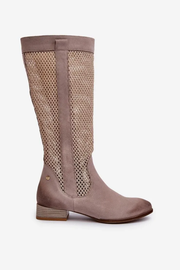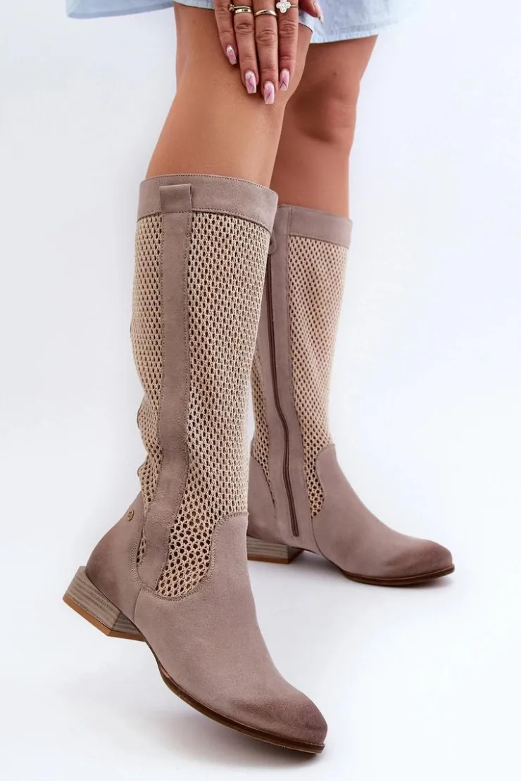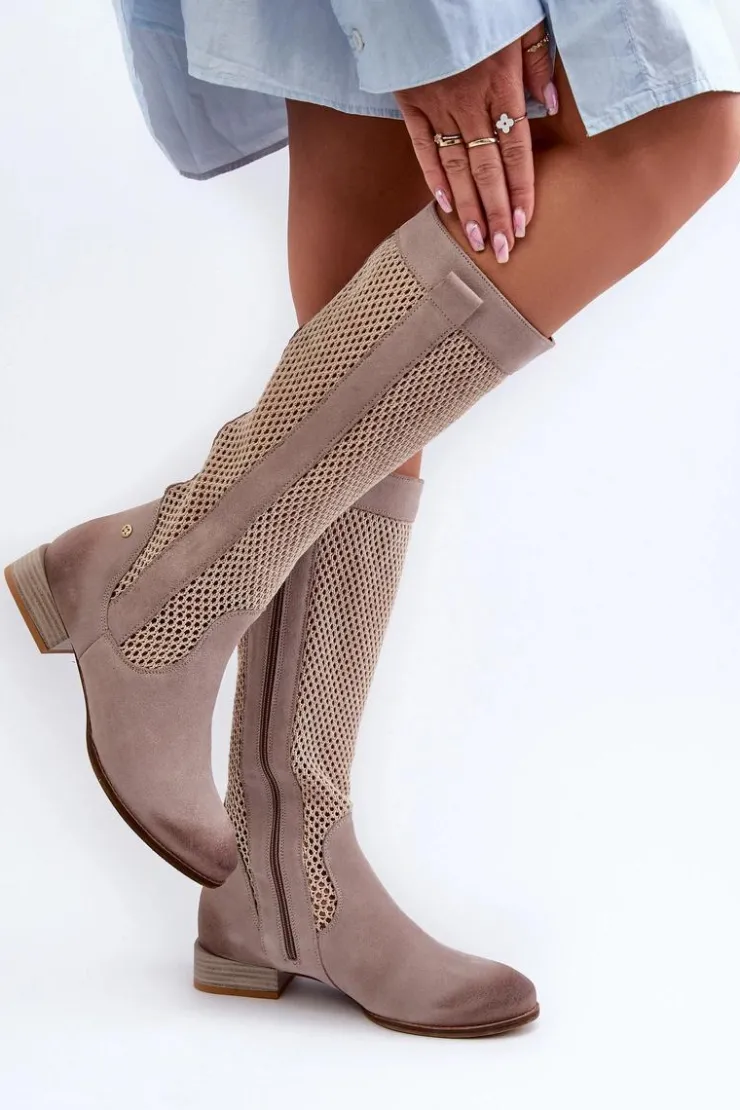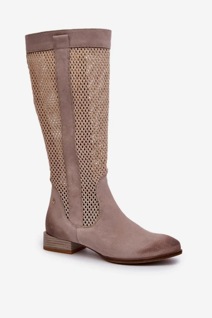 Kozaki damskie wykonane z naturalnego zamszu. Cholewka sięga przed kolano. Niski obcas gwarantuje wygodę noszenia przez cały dzień, a zamek ułatwia zakładanie i zdejmowanie. To idealne obuwie dla kobiet, które szukają połączenia stylu i komfortu. Przy wyborze rozmiaru prosimy sugerować się tabelą rozmiarów.