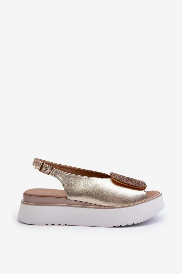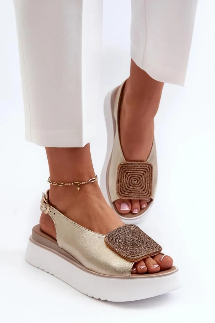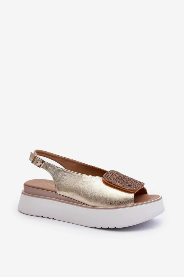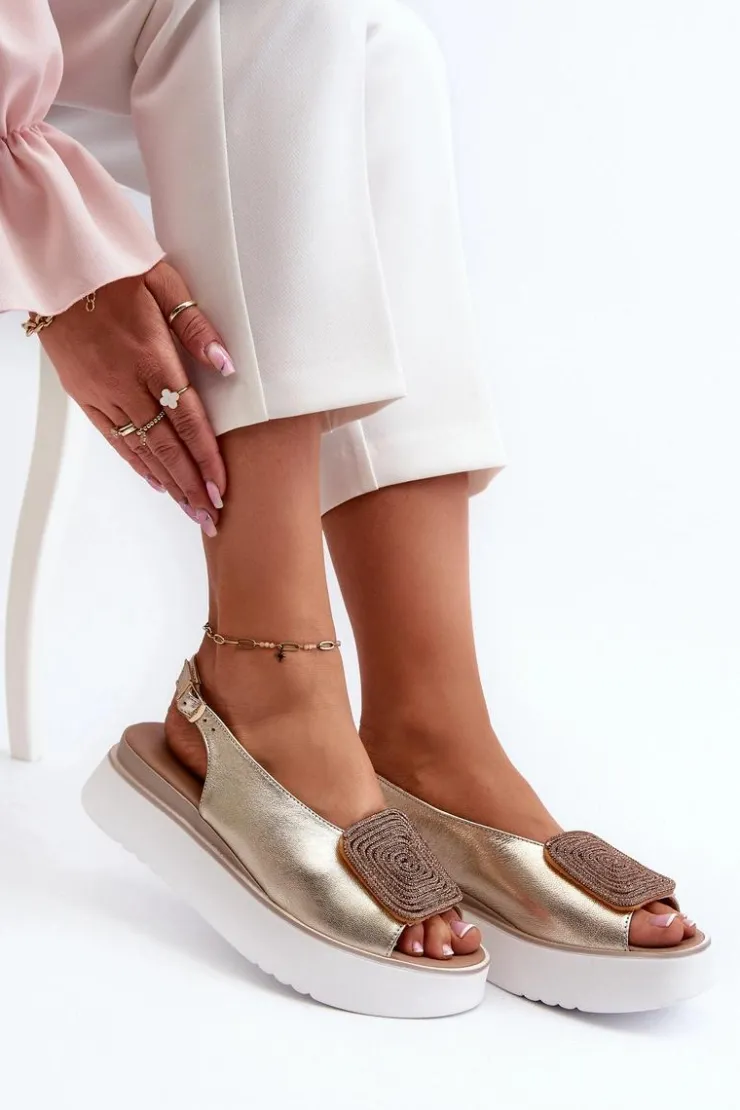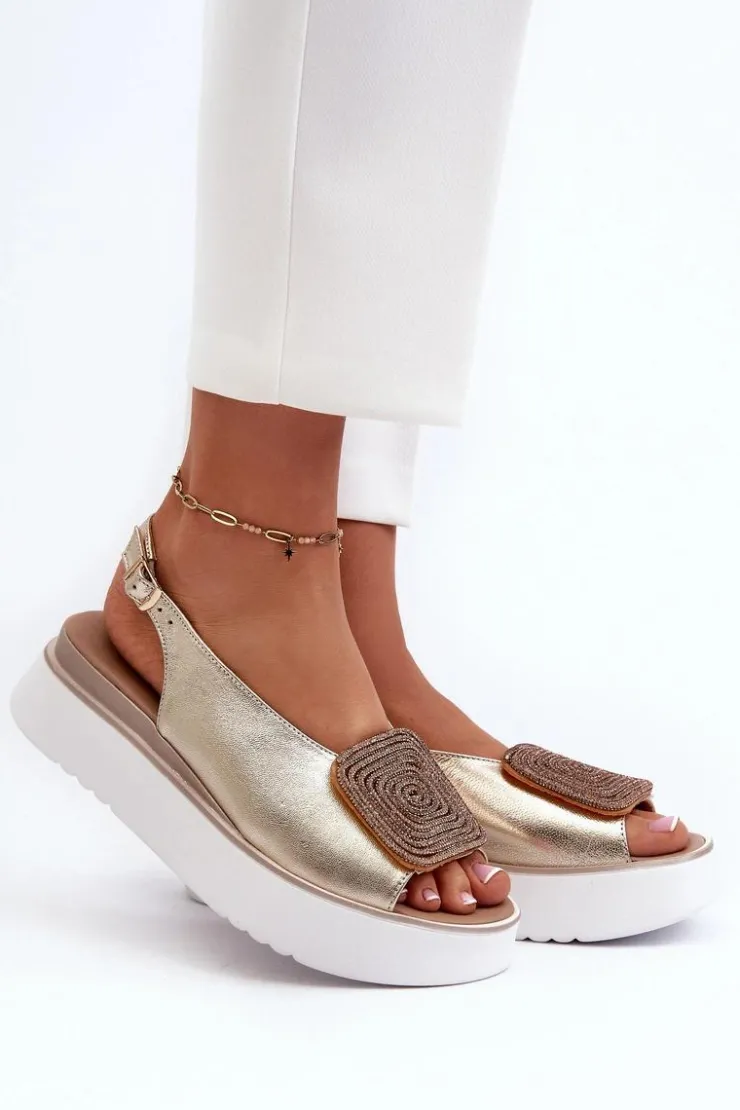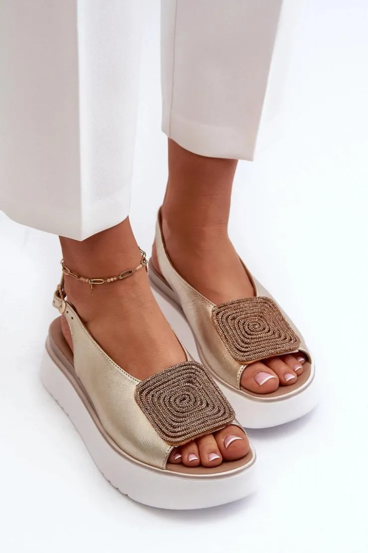 Sandały damskie z naturalnej skóry to połączenie klasyki i wygody. Osadzone na platformie, zapewniają stabilność i komfort podczas noszenia. Ozdoba z przodu dodaje blasku, podkreślając ich wyjątkowy wygląd. Zapinane na regulowany pasek ze sprzączką gwarantują idealne dopasowanie do stopy. Te sandały są nie tylko stylowe, ale także praktyczne i funkcjonalne – idealne na różne okazje. Przy wyborze rozmiaru prosimy kierować się tabelą rozmiarów.