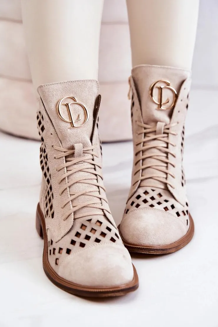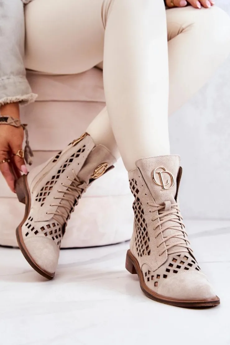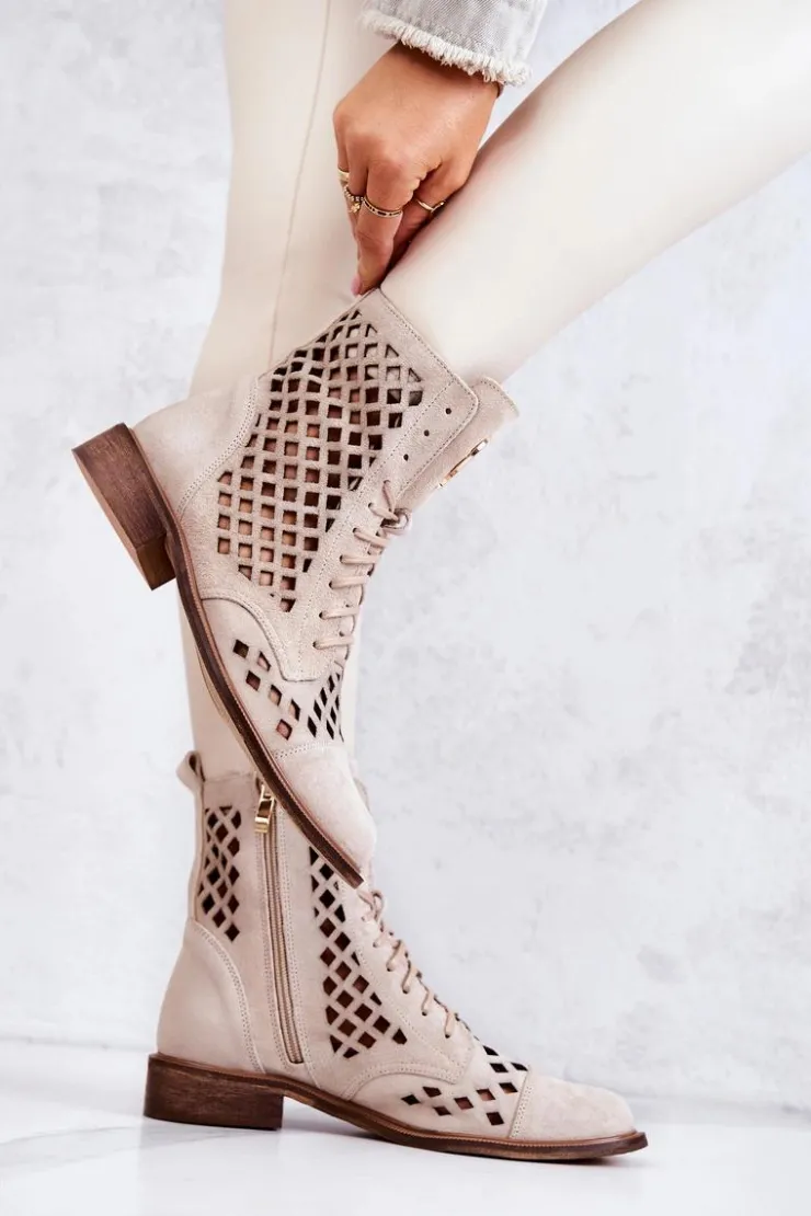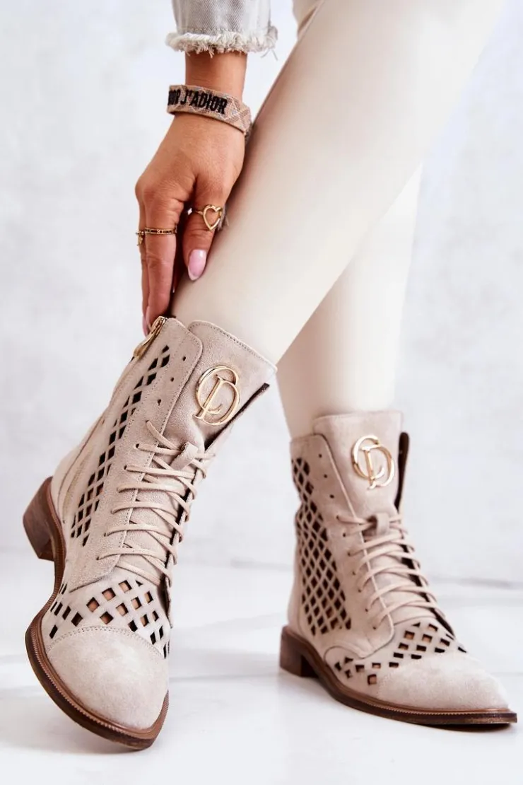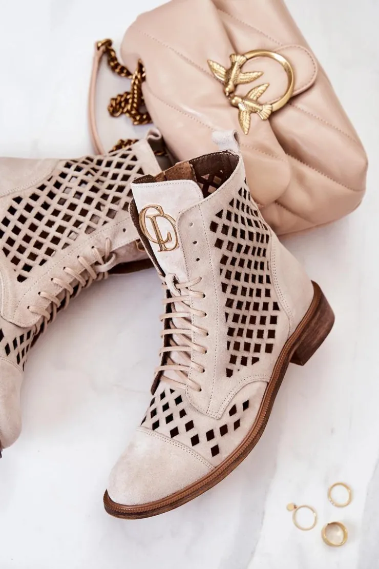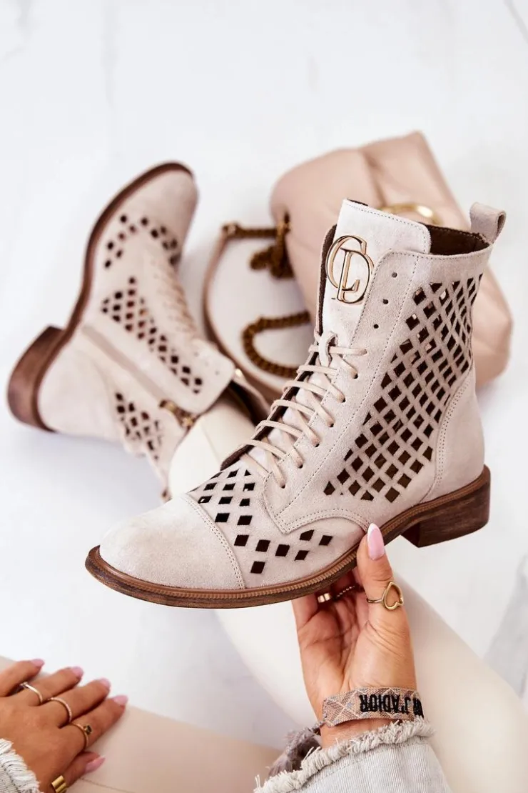 Wyjątkowe, ażurowe botki od polskiej firmy Nicole. Botki wykonane są w całości ze skóry naturalnej z dbałością o każdy detal. Skórzana wkładka oraz wygodny, płaski obcas zadbają o Twój komfort. Botki dopełnią wiele stylizacji. Zapinane na suwak oraz wiązane. Koniecznie sprawdź całą naszą kolekcję butów marki Nicole. Przy wyborze rozmiaru prosimy sugerować się tabelą rozmiarów.