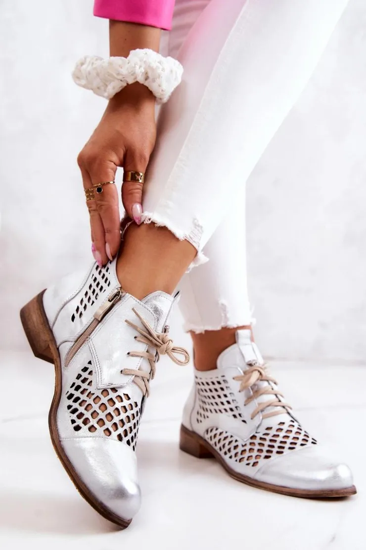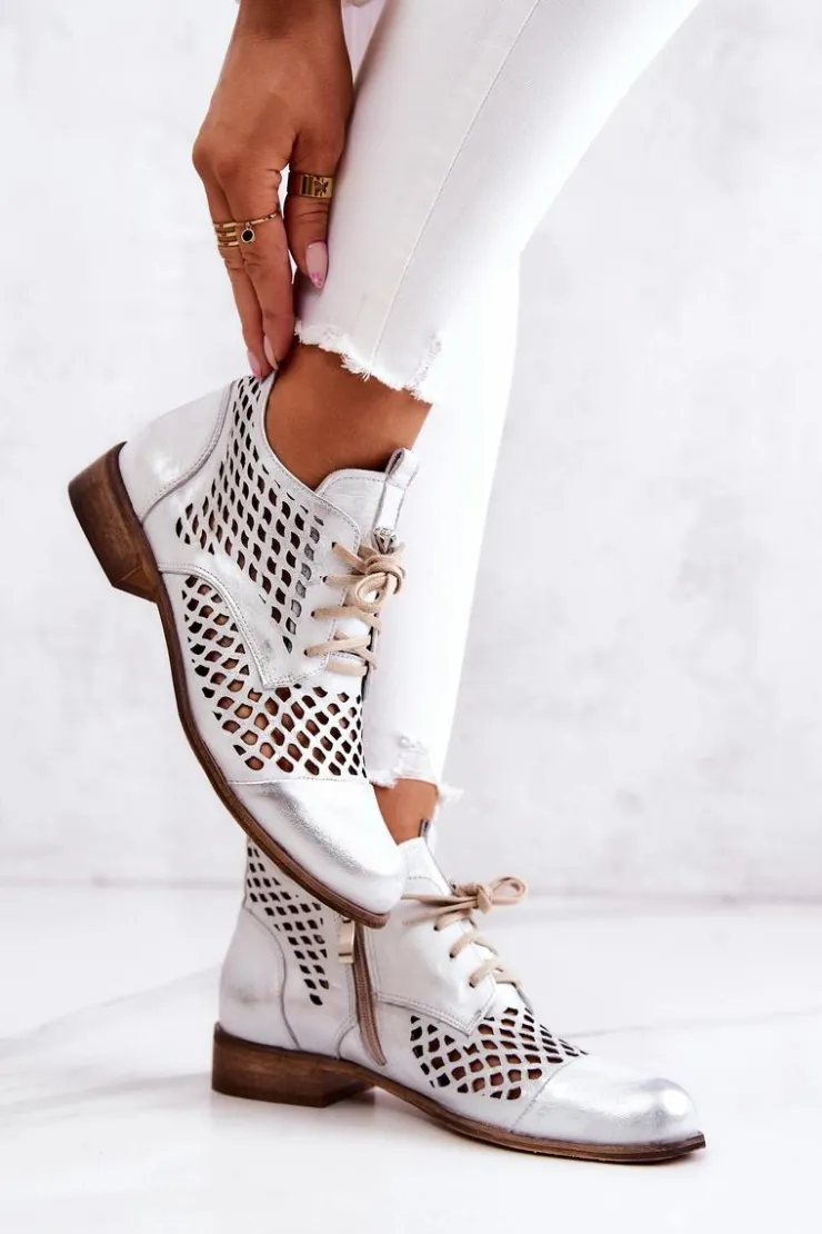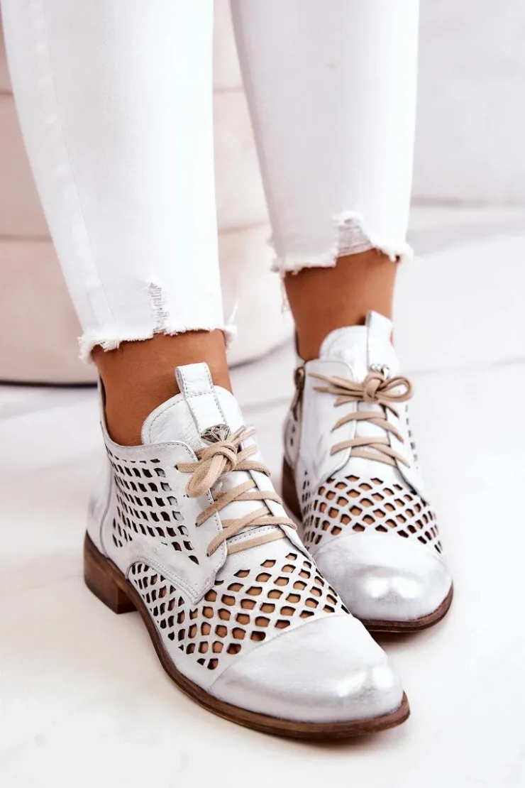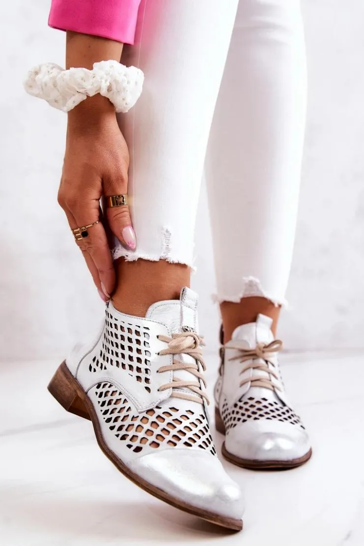 Damskie Zazoo 2704 Skórzane Ażurowe Botki Biało-Srebrne
