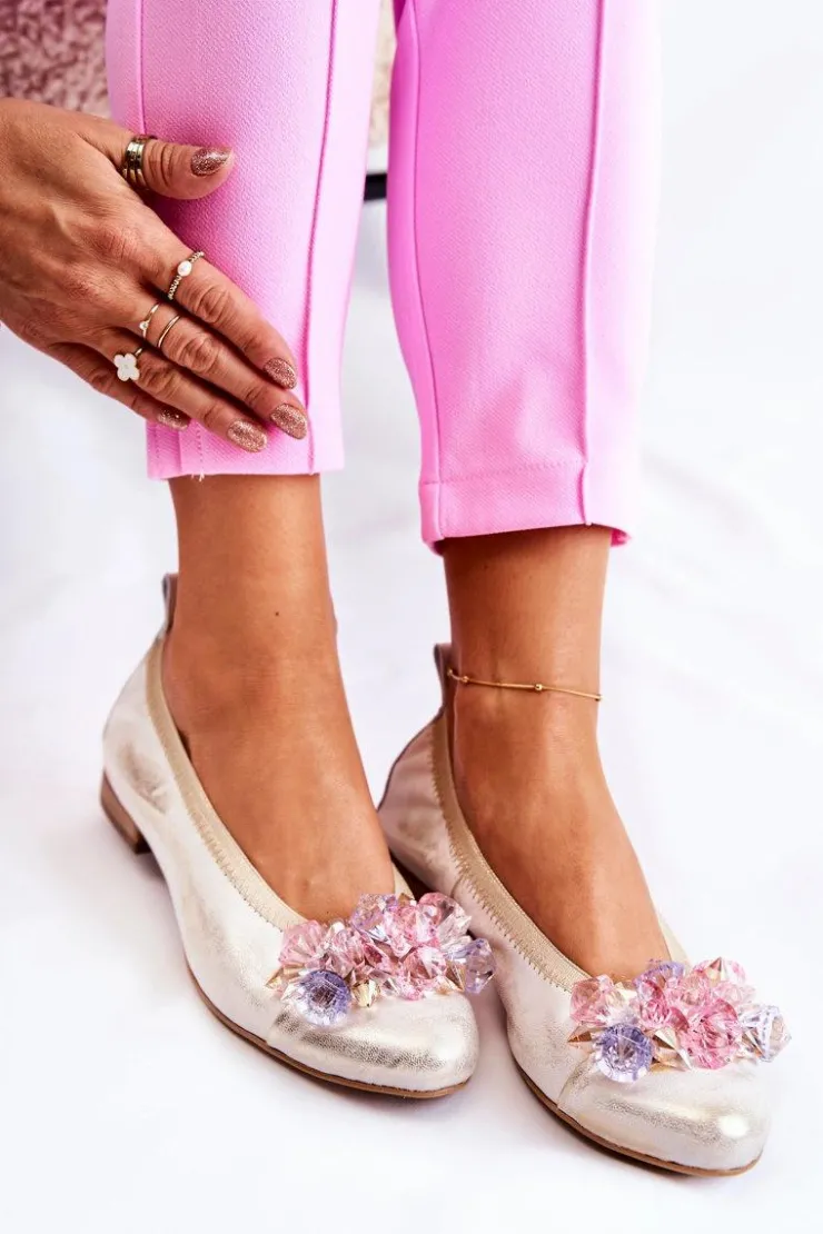 Damskie baleriny wykonane z wysokiej jakości naturalnej skóry. Posiadają delikatnie zaokrąglony nosek. Model wsuwany ze ściągaczem. Osadzone na niewysokim, płaskim obcasie. Na przodzie znajduje się ozdoba w kształcie kryształków. Wkładka wykonana z naturalnej skóry jest miękka i wygodna w użytkowaniu. Komfort gwarantowany! Koniecznie powinnaś mieć ten model w swojej garderobie! Przy wyborze rozmiaru prosimy sugerować się tabelą rozmiarów.