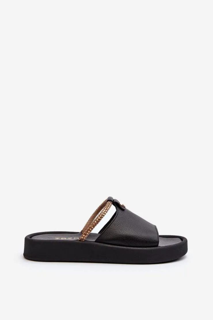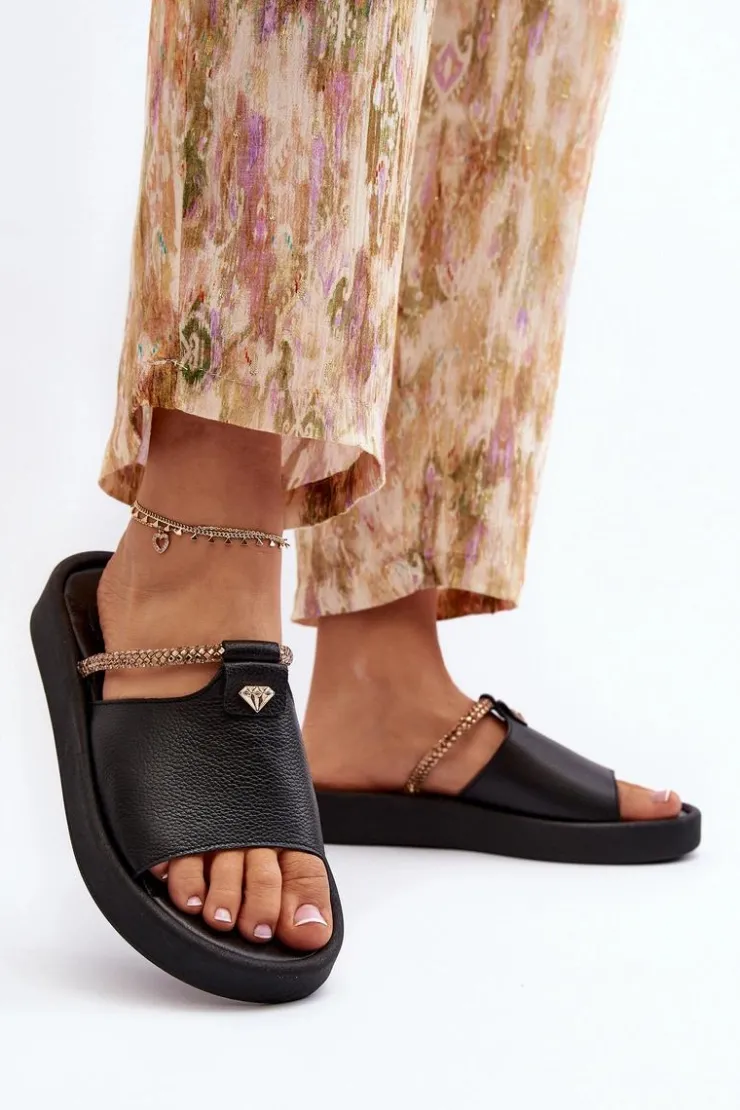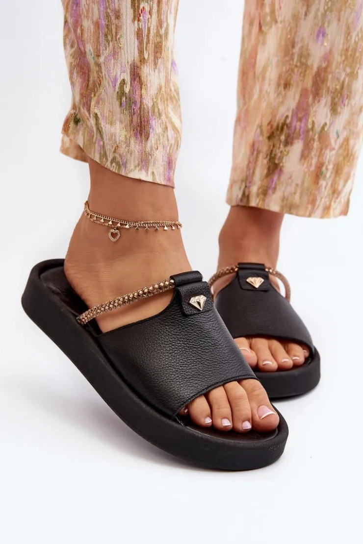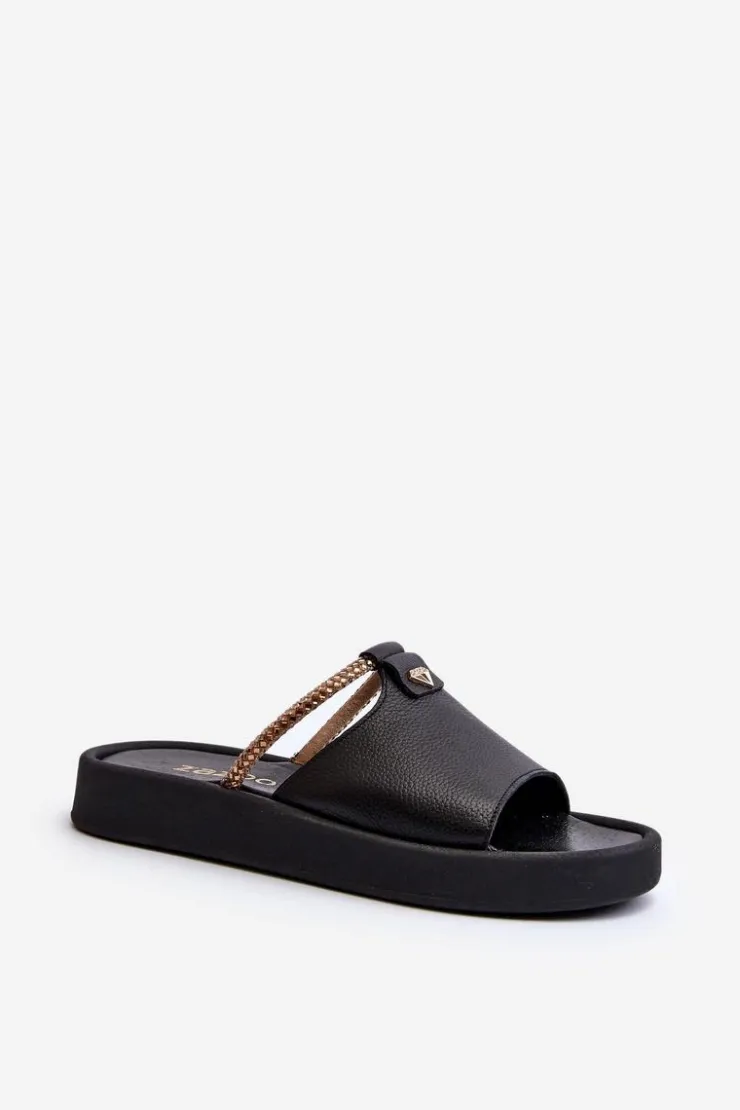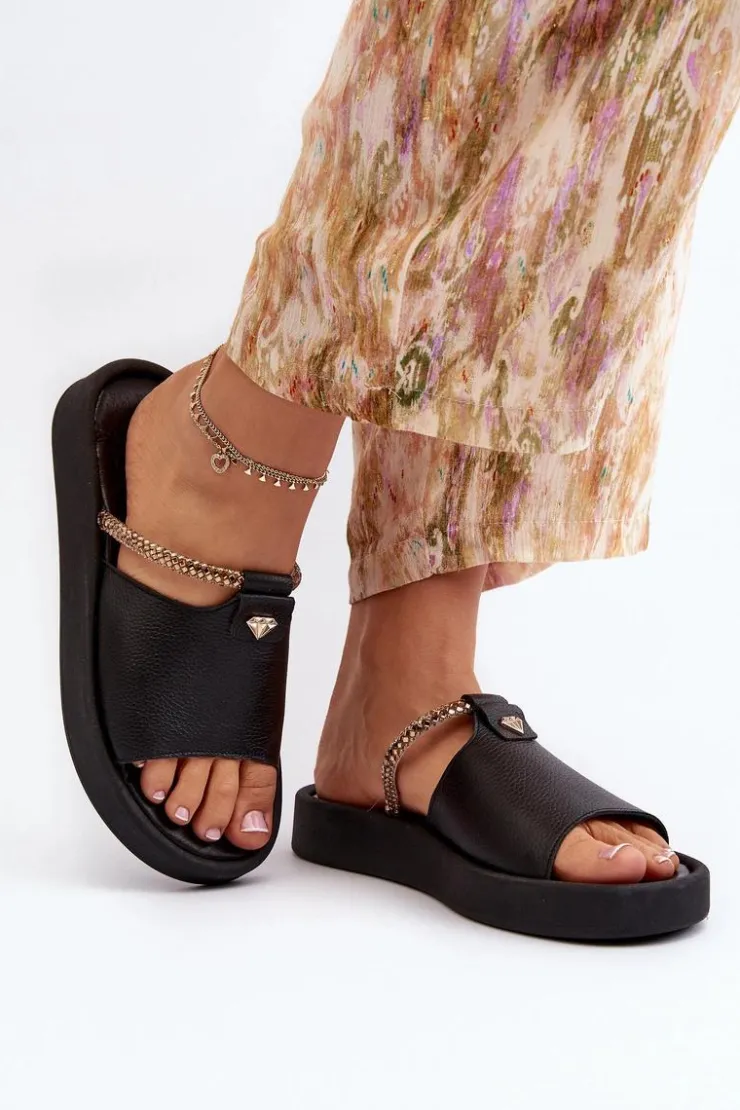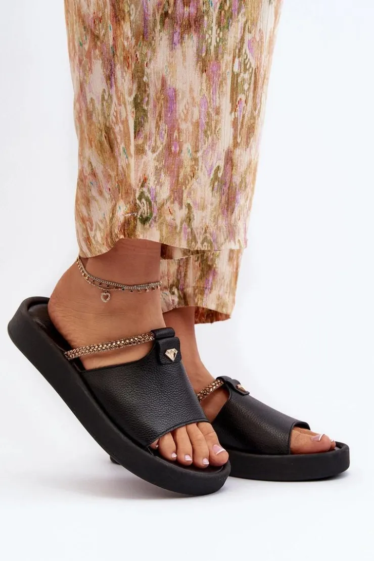 Wygodne klapki damskie wykonane ze skóry naturalnej. Osadzone na grubej podeszwie z gumowego tworzywa. Model ten posiada ozdobny paseczek z mieniącymi się dżetami. Miękka wkładka zapewni komfort nawet w upalne dni! Koniecznie sprawdź całą naszą kolekcję damskich klapek! Przy wyborze rozmiaru prosimy sugerować się tabelą rozmiarów.