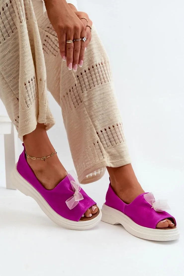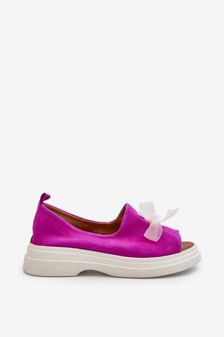 Damskie sandały wykonane z naturalnego zamszu to elegancki i komfortowy wybór na ciepłe dni. Osadzone na grubej, solidnej podeszwie, zapewniają stabilność i wygodę noszenia przez cały dzień. Miękka, skórzana wkładka dodatkowo zwiększa komfort użytkowania. Przód sandałów ozdobiony uroczą kokardką dodaje im subtelnego uroku i sprawia, że stanowią stylowy element każdej letniej stylizacji. Przy wyborze rozmiaru prosimy kierować się tabelą rozmiarów.