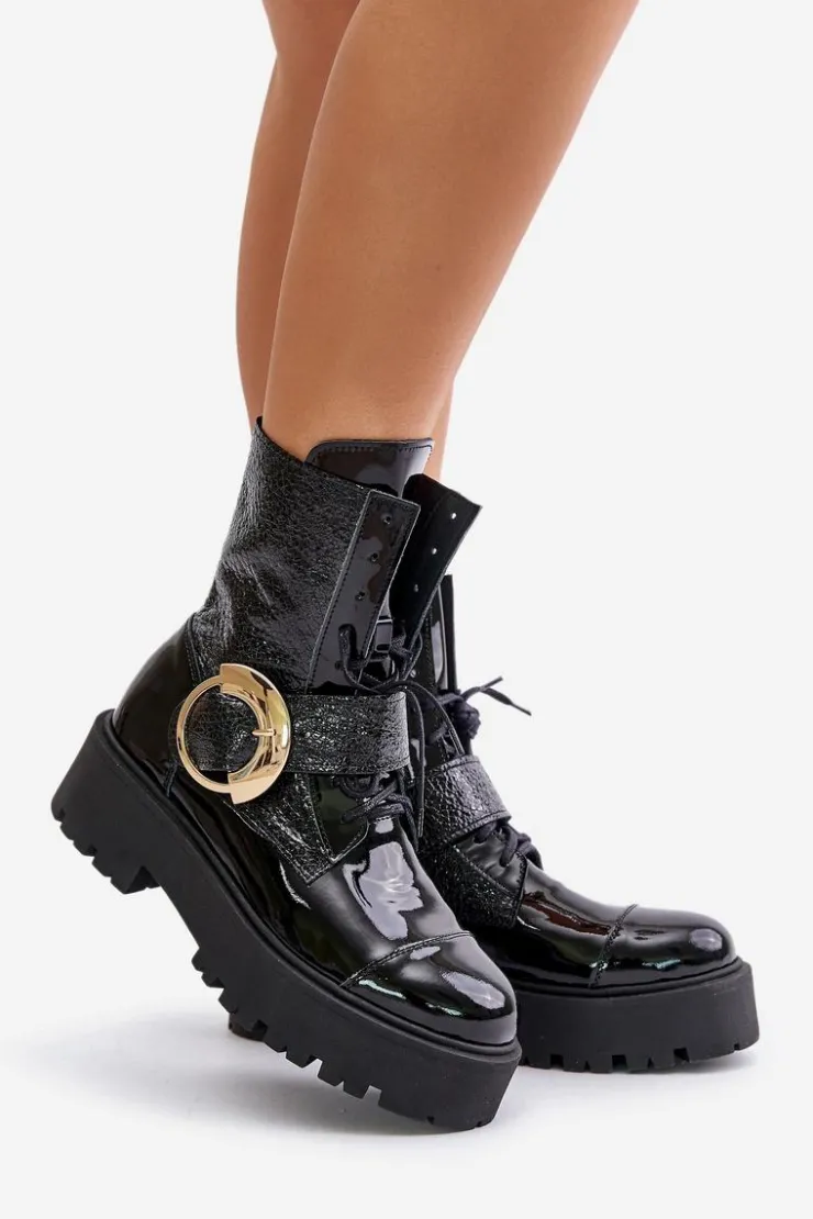 Wyjątkowe botki wykonane z naturalnej skóry. Osadzone na platformie i płaskim obcasie, zapewniają stabilność i wygodę noszenia. Model zapinany na zamek, dodatkowo posiada sznurowanie dla lepszego dopasowania. Duża klamra z paskiem na cholewce stanowi efektowny detal, który nadaje im modnego, wyrazistego charakteru. Przy wyborze rozmiaru prosimy sugerować się tabelą rozmiarów.