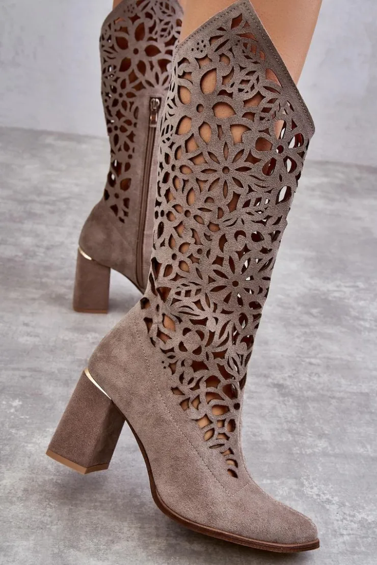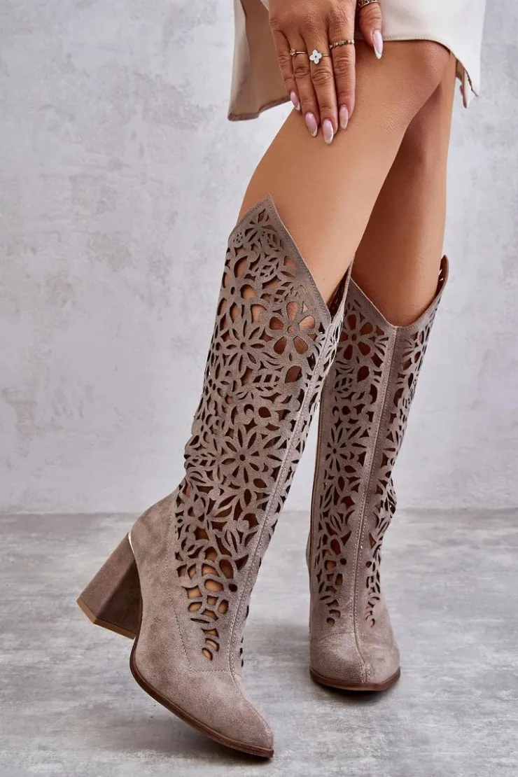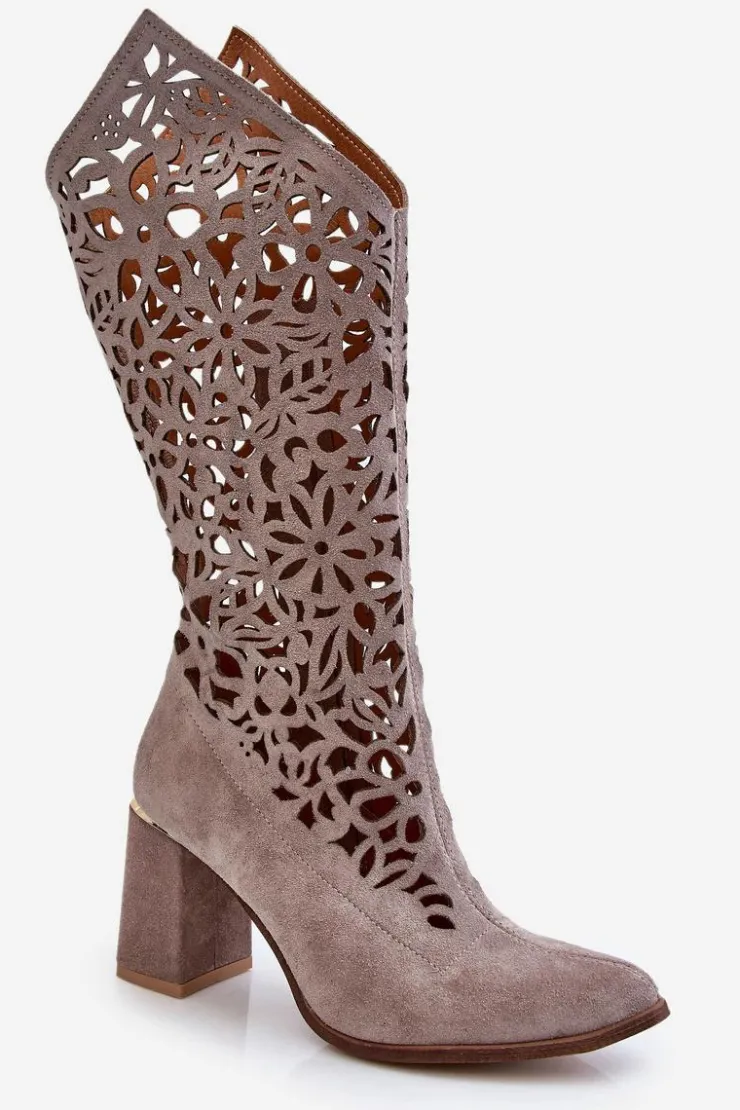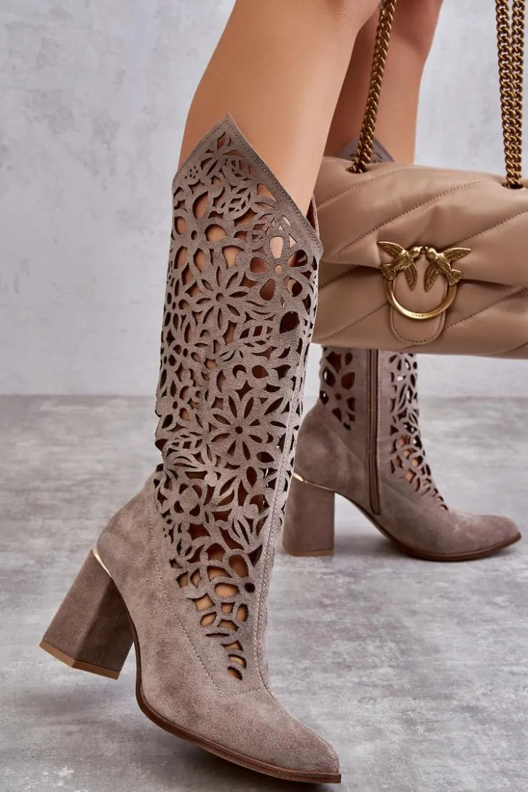 Kozaki z ażurową cholewką do kolana oraz noskiem w szpic. Zapinane na zamek błyskawiczny oraz wsuwane. Posiadają usztywniany zapiętek. Wykonane z wysokiej jakości skór naturalnych. Z tymi kozakami stworzysz wiele ciekawych stylizacji na co dzień. Miękka, skórzana wkładka oraz stabilny obcas w postaci słupka zapewnią wygodę podczas użytkowania. Przy wyborze rozmiaru prosimy sugerować się tabelą rozmiarów.