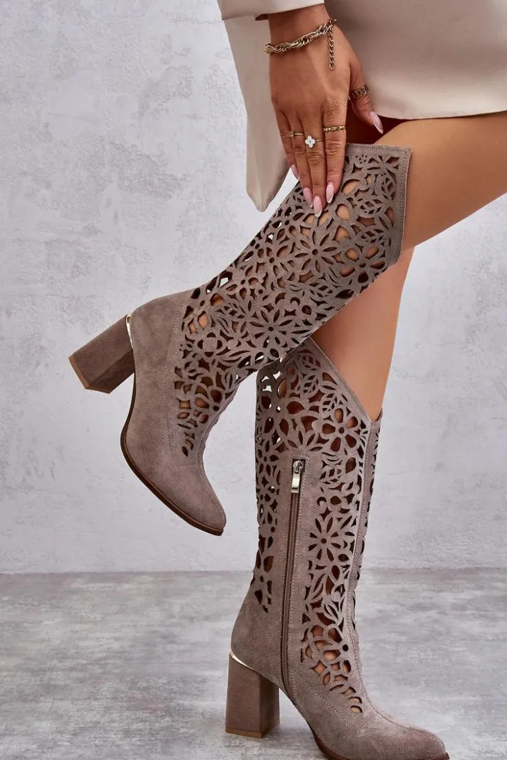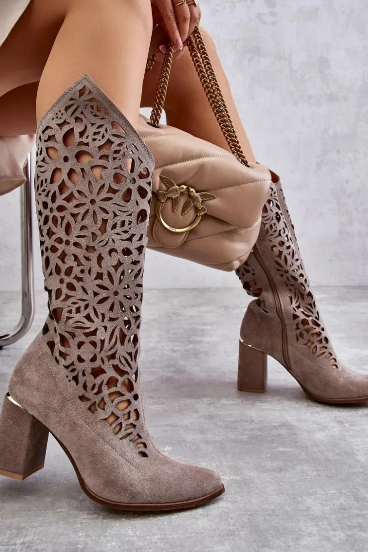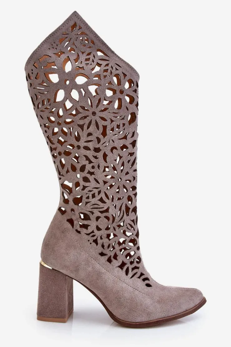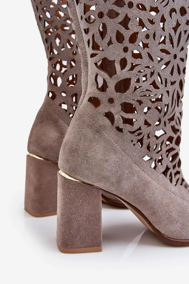 Kozaki z ażurową cholewką do kolana oraz noskiem w szpic. Zapinane na zamek błyskawiczny oraz wsuwane. Posiadają usztywniany zapiętek. Wykonane z wysokiej jakości skór naturalnych. Z tymi kozakami stworzysz wiele ciekawych stylizacji na co dzień. Miękka, skórzana wkładka oraz stabilny obcas w postaci słupka zapewnią wygodę podczas użytkowania. Przy wyborze rozmiaru prosimy sugerować się tabelą rozmiarów.