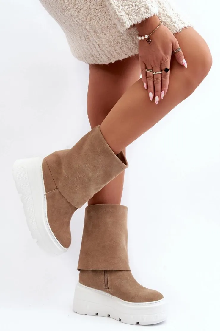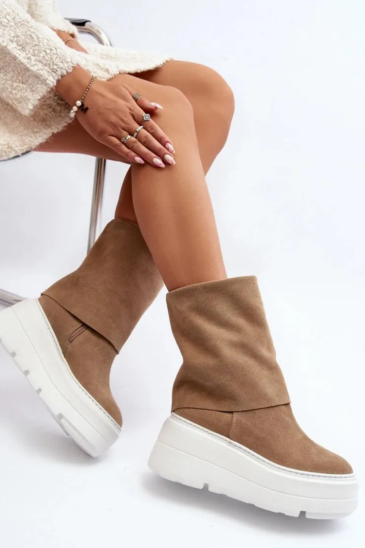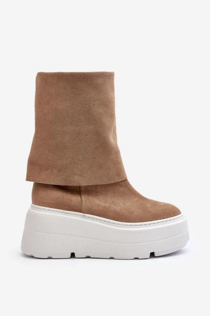 Botki damskie wykonane z naturalnego zamszu. Platforma w tym modelu jest wysoka, jednak botki są niezwykle stabilne. Posiadają zapinanie na zamek od wewnętrznej strony. Noski zaokrąglone. Stylowy fason, który z pewnością dopasujesz do niejednej wiosennej stylizacji! Przy wyborze rozmiaru prosimy sugerować się poniższą tabelą rozmiarów.