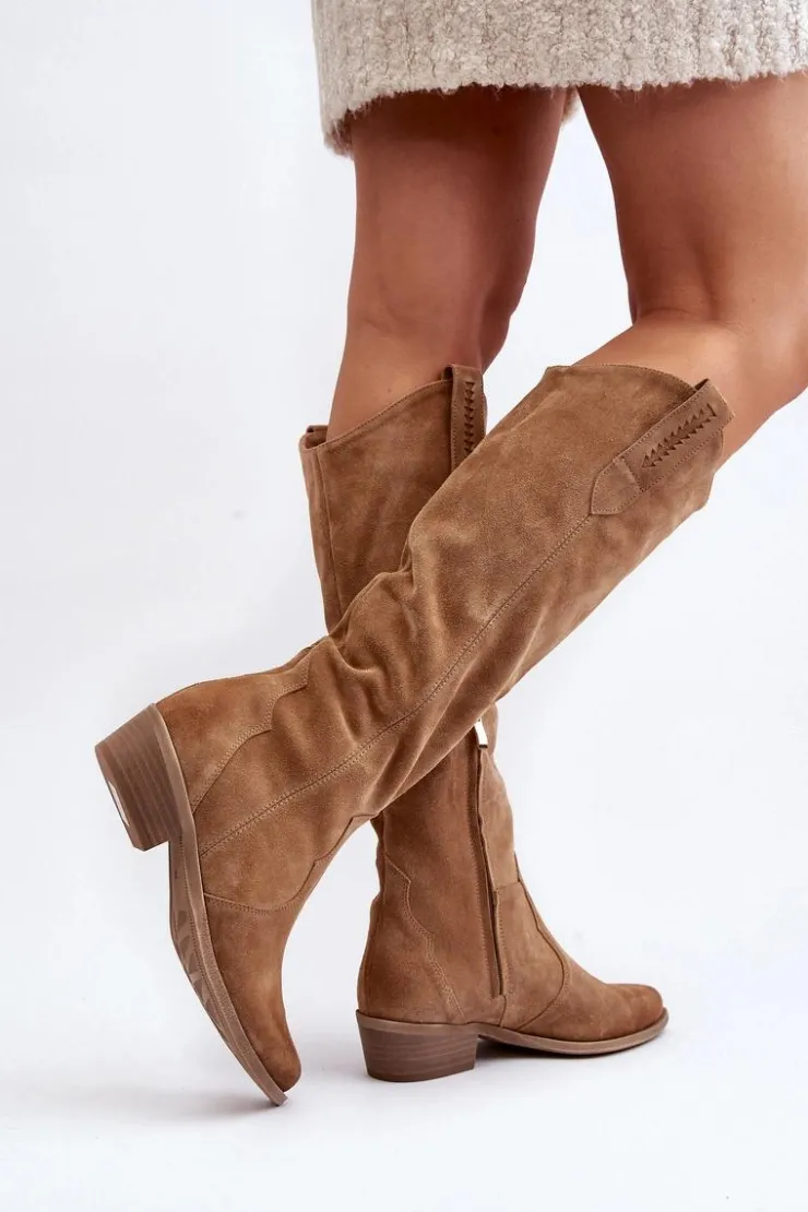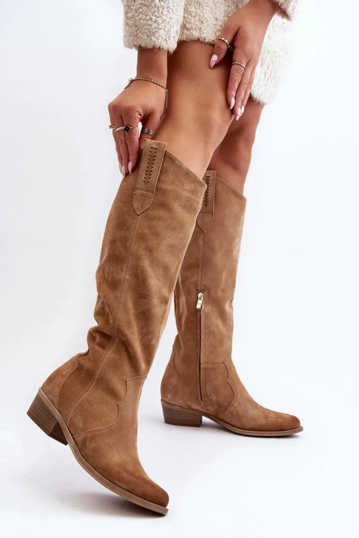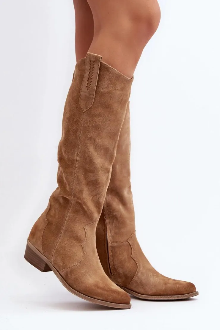 Kozaki damskie w stylu kowbojek to niezwykle modne obuwie na sezon wiosenno-jesienny. Wykonane z naturalnego zamszu. Stabilny, niski obcas sprawia, że są one wygodne i idealne do noszenia na co dzień. Model wsuwany z dodatkowym zapięciem na suwak ułatwia zakładanie butów. Cholewka sięga przed kolano. Skórzana, miękka wkładka zapewnia komfort podczas noszenia. Te kozaki świetnie skomponują się z różnymi stylizacjami. Koniecznie powinny znaleźć się w Twojej garderobie! Przy wyborze rozmiaru prosimy sugerować się tabelą rozmiarów.