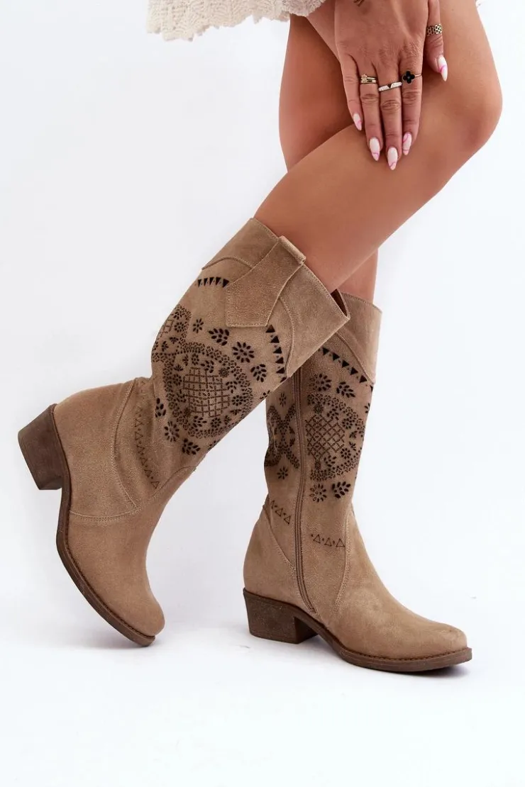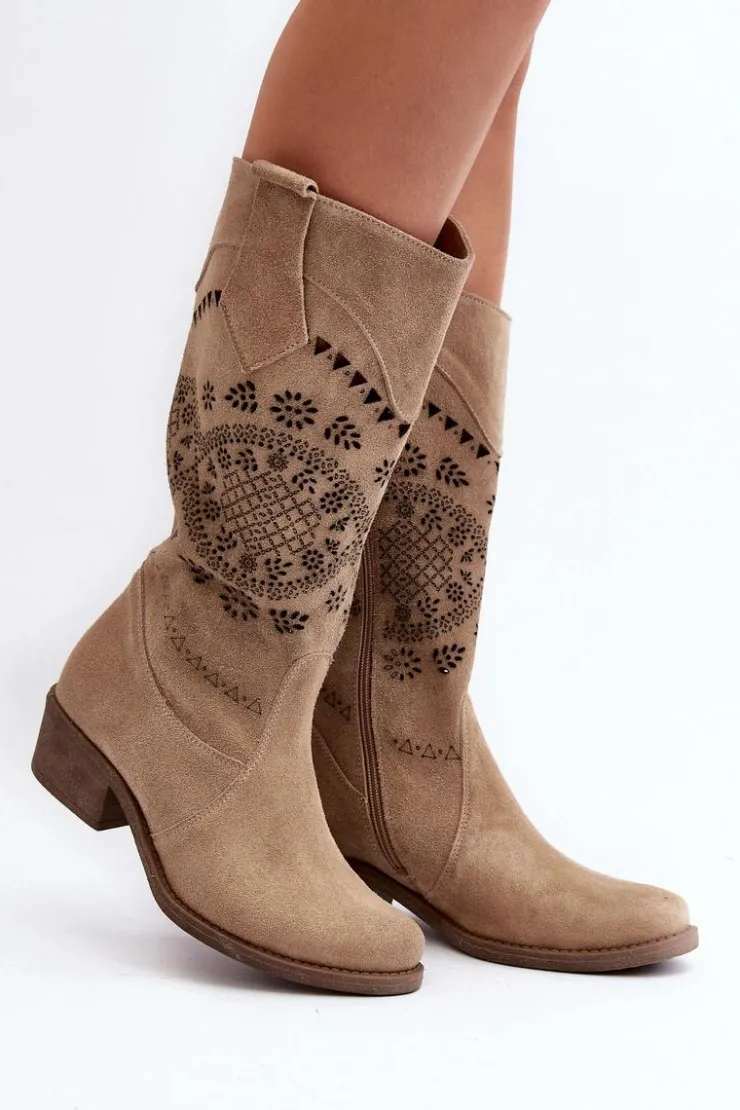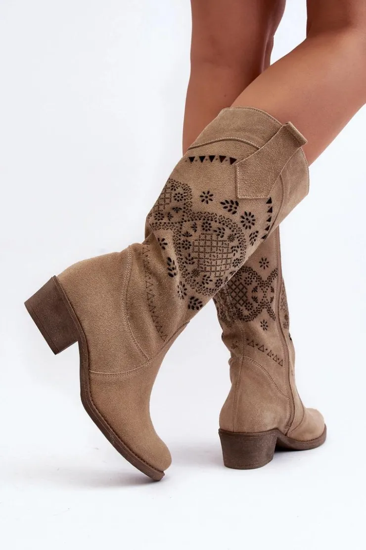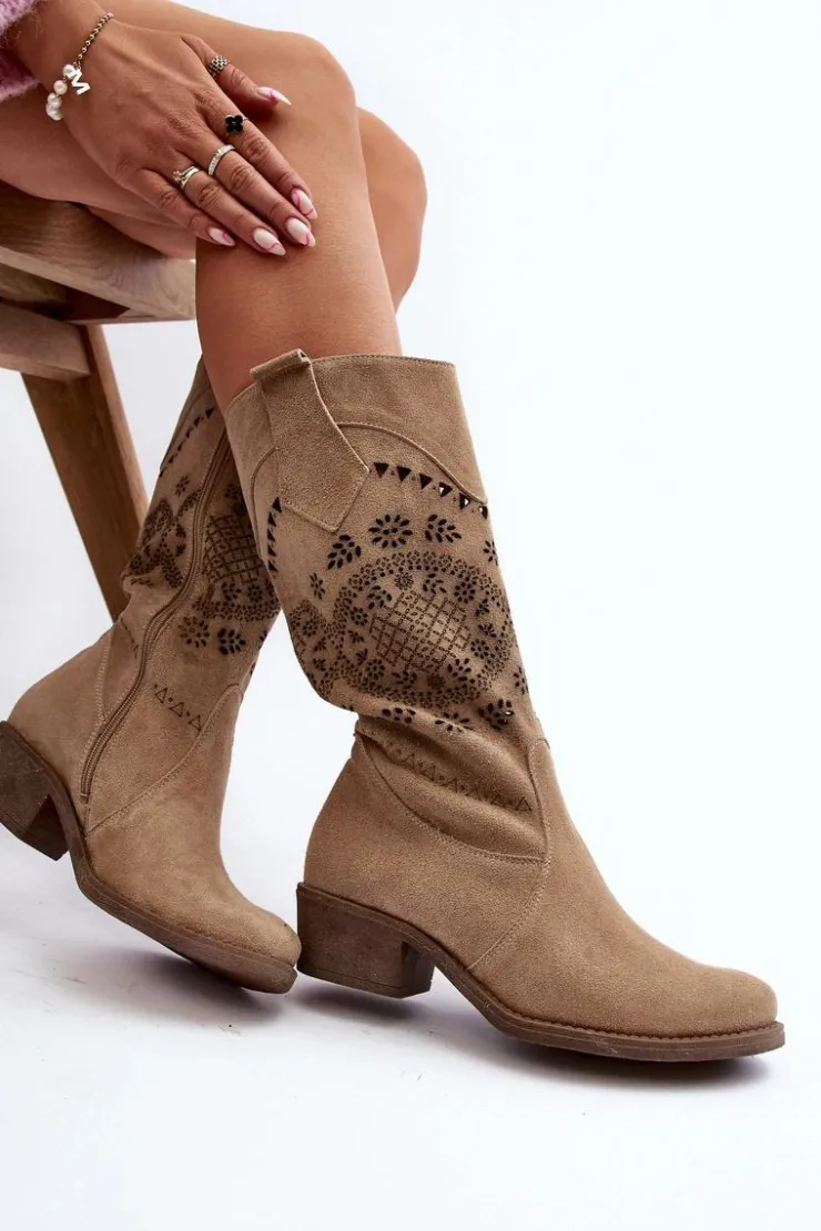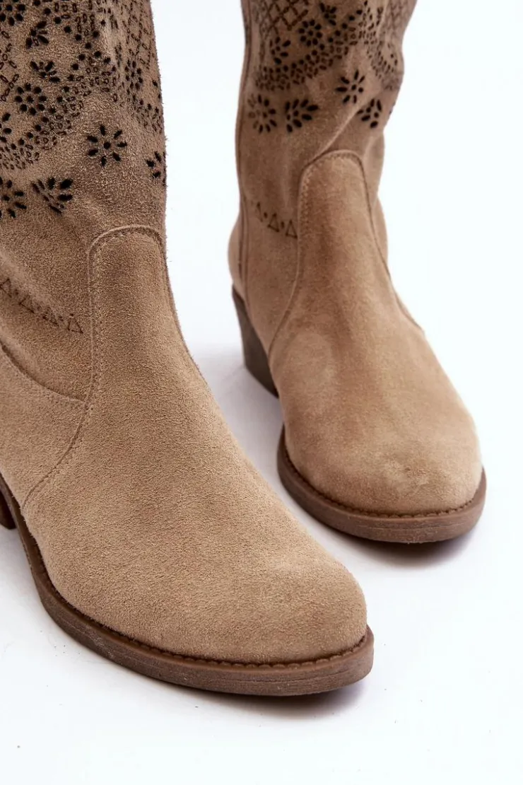 Damskie Zazoo 4043 Zamszowe Kozaki Na Niskim Obcasie Ażurowe Beżowe