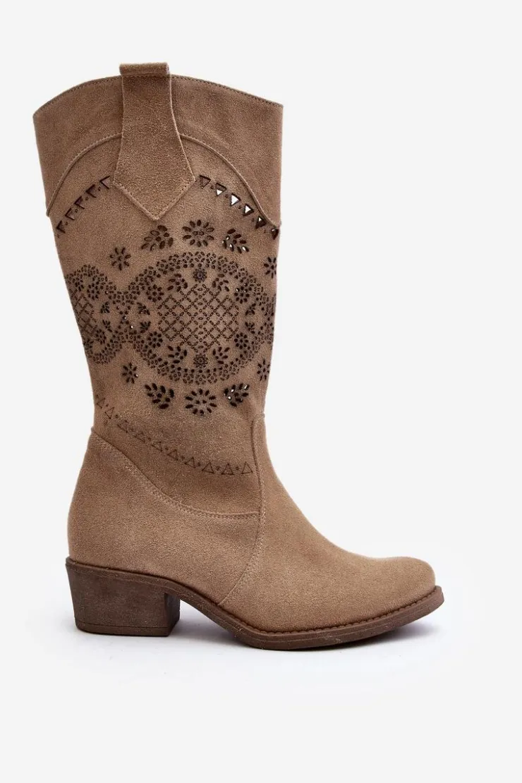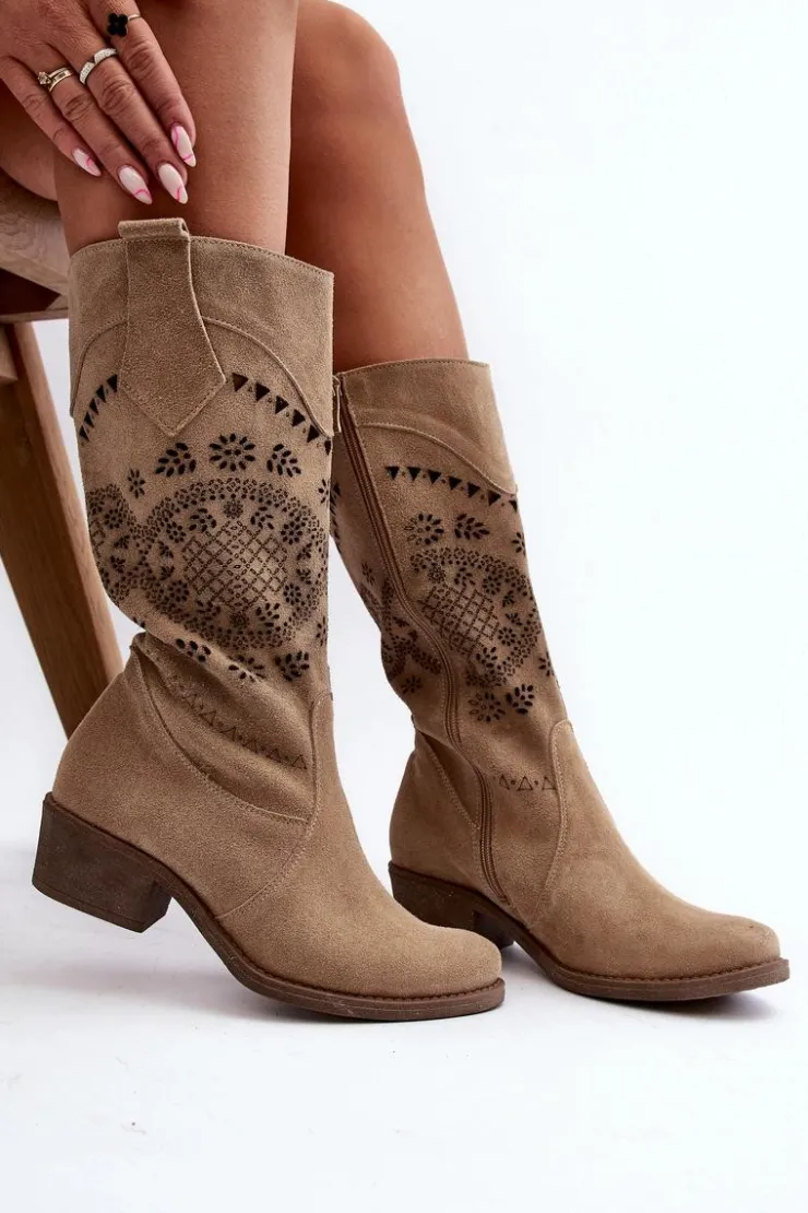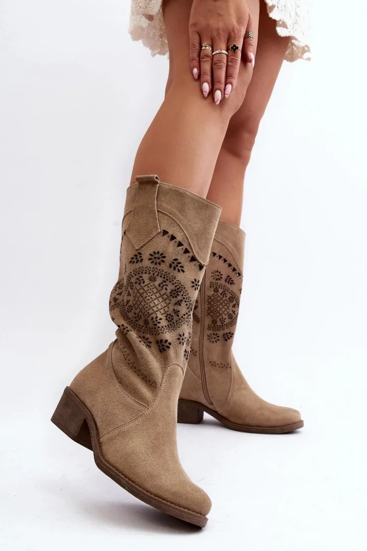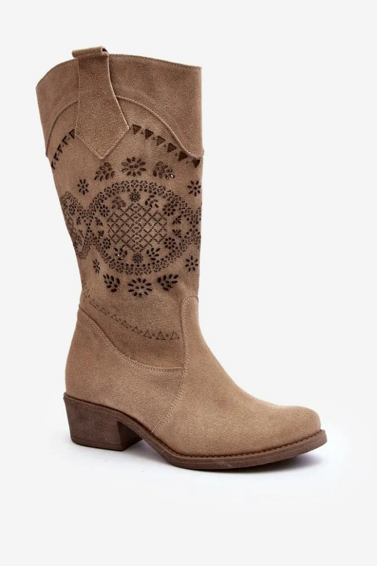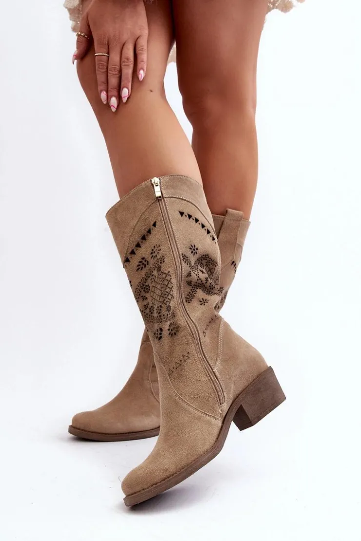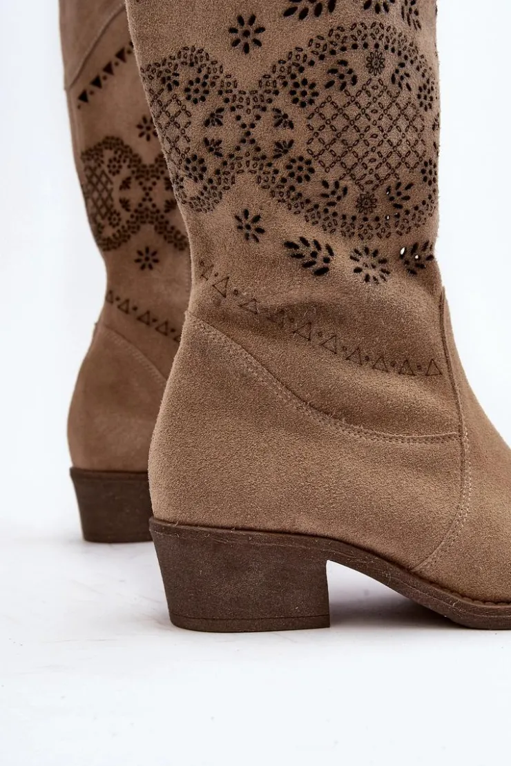 Damskie Zazoo 4043 Zamszowe Kozaki Na Niskim Obcasie Ażurowe Beżowe