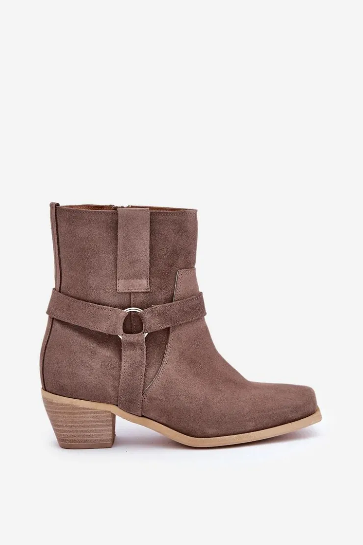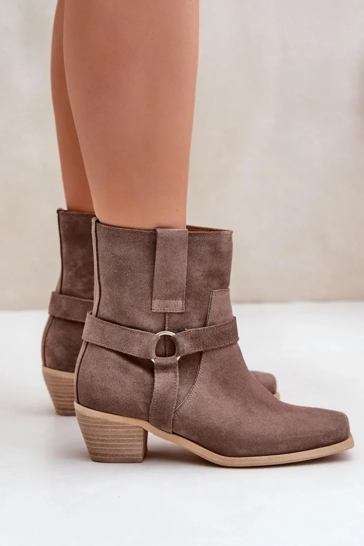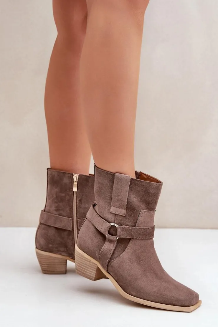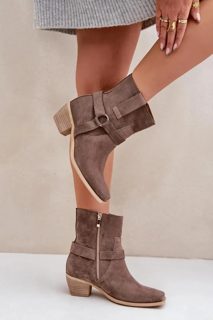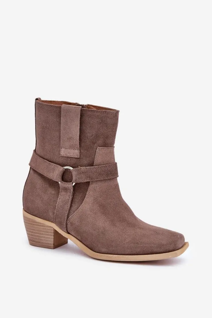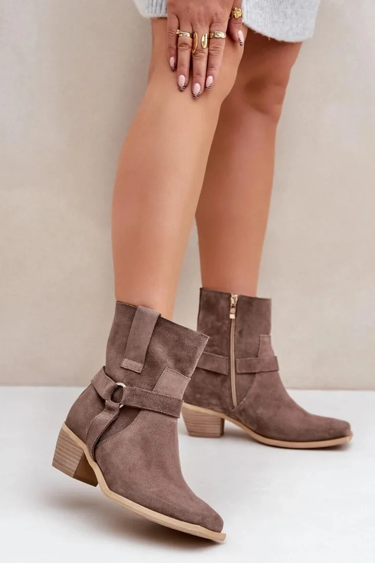 Damskie botki z naturalnego zamszu to stylowy model, idealny na chłodniejsze dni. Osadzone na stabilnym obcasie typu słupek, zapewniają wygodę i subtelnie wydłużają sylwetkę. Zapinane na zamek dla łatwego zakładania, a zaokrąglone noski z kwadratową podeszwą nadają im nowoczesnego charakteru. Cholewkę zdobią paski z ozdobnym elementem, co dodaje elegancji i przyciąga wzrok. Te wyjątkowe botki doskonale sprawdzą się zarówno w casualowych, jak i bardziej formalnych stylizacjach, łącząc wygodę z modnym designem. Przy wyborze rozmiaru prosimy sugerować się tabelą rozmiarów.