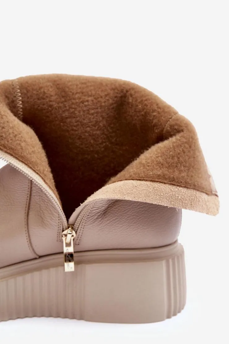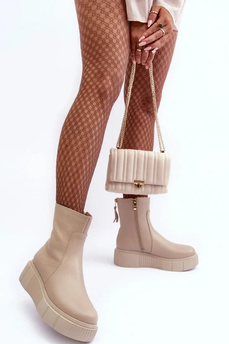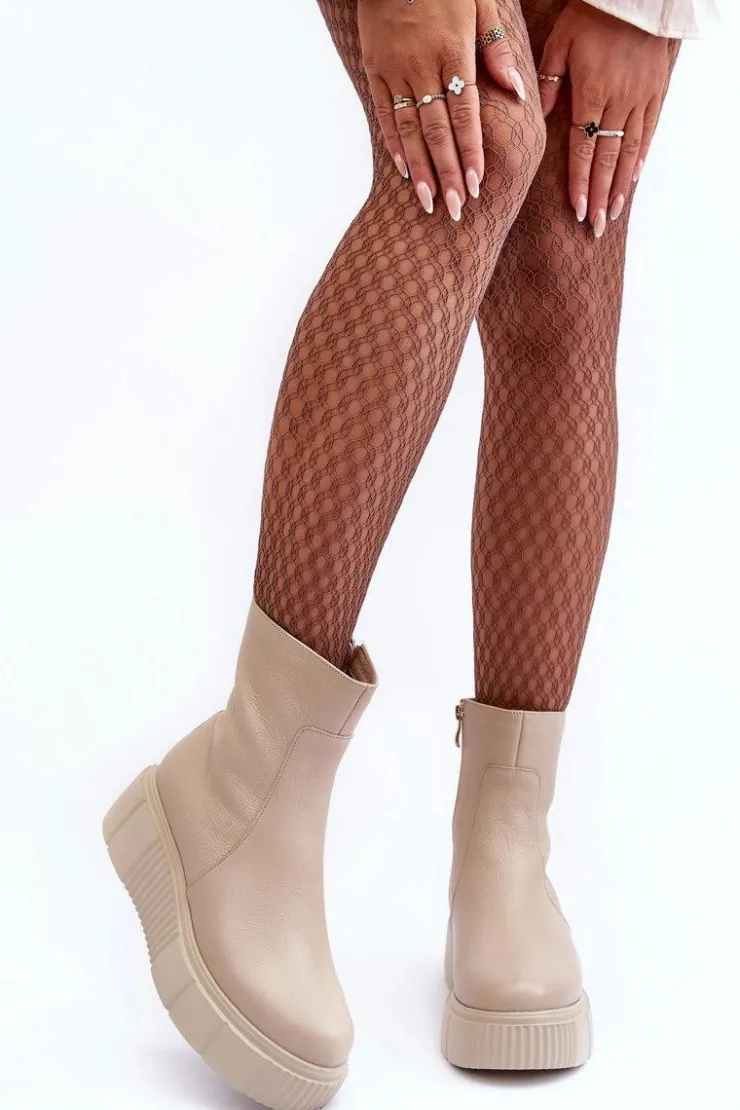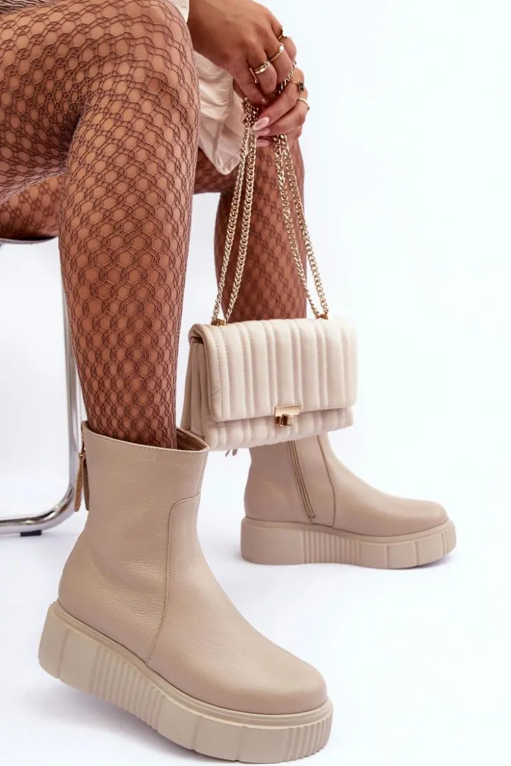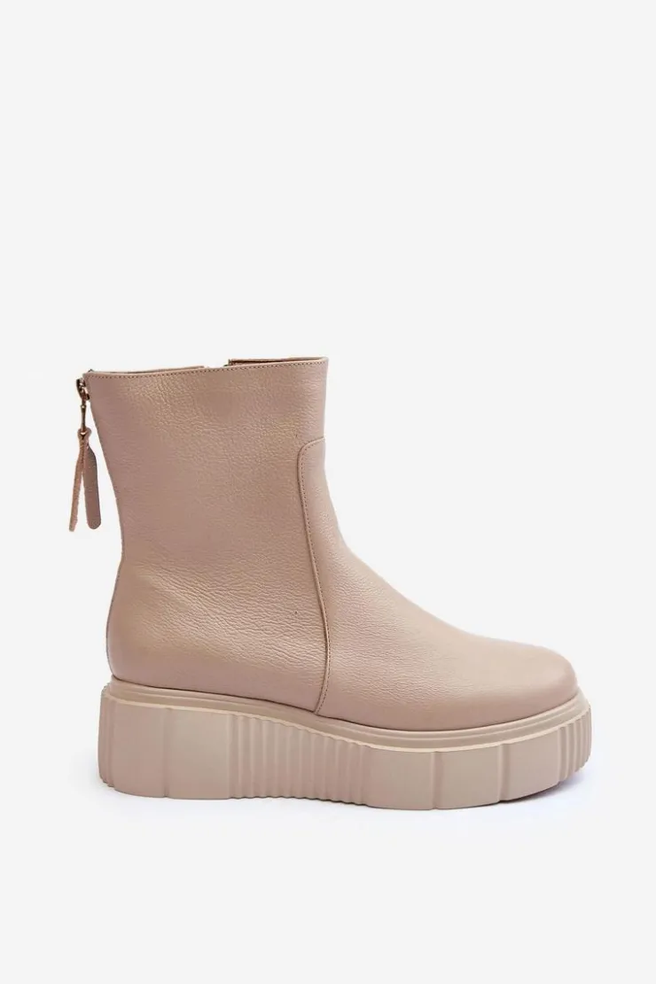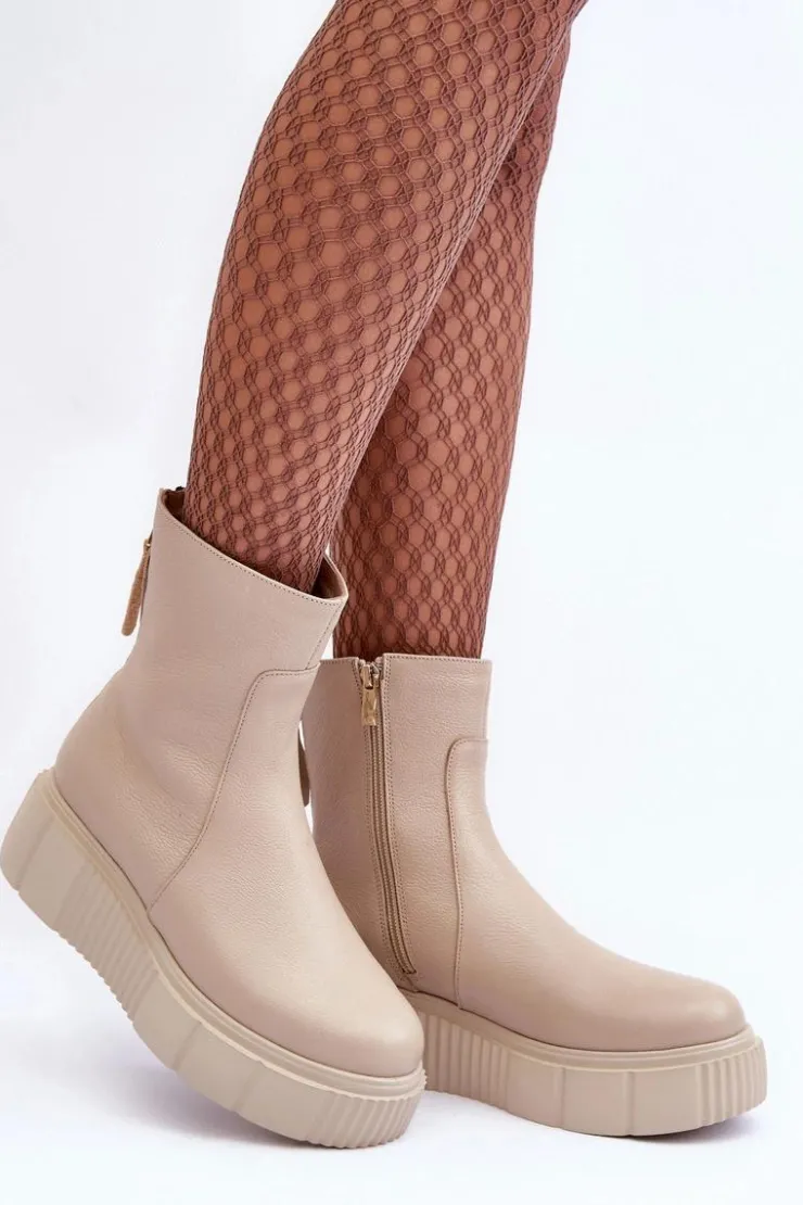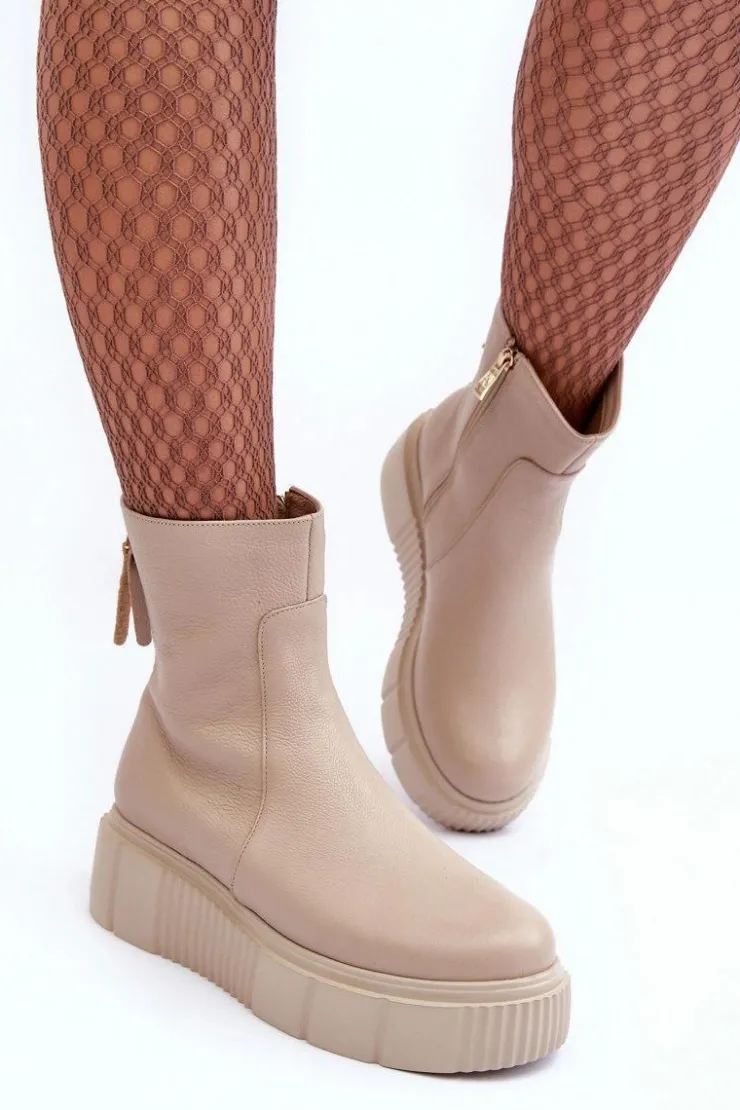 Botki damskie zostały wykonane z wysokiej jakości naturalnych skór. Osadzone na masywnej platformie z delikatnym koturnem. Zapinane z boku cholewki na suwak, natomiast suwak z tyłu jest ozdobny. Dodatkowo botki posiadają usztywniany zapiętek. Ocieplone w środku kocem obuwniczym. Model ten na pewno sprawdzi się w wielu jesiennych stylizacjach! Przy wyborze rozmiaru prosimy kierować się tabelą rozmiarów