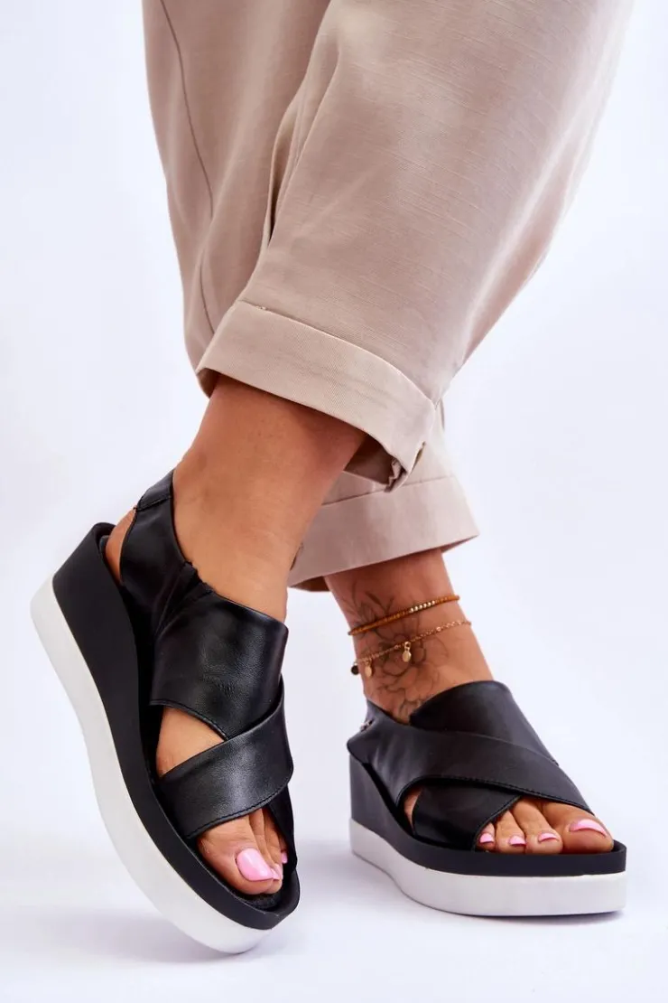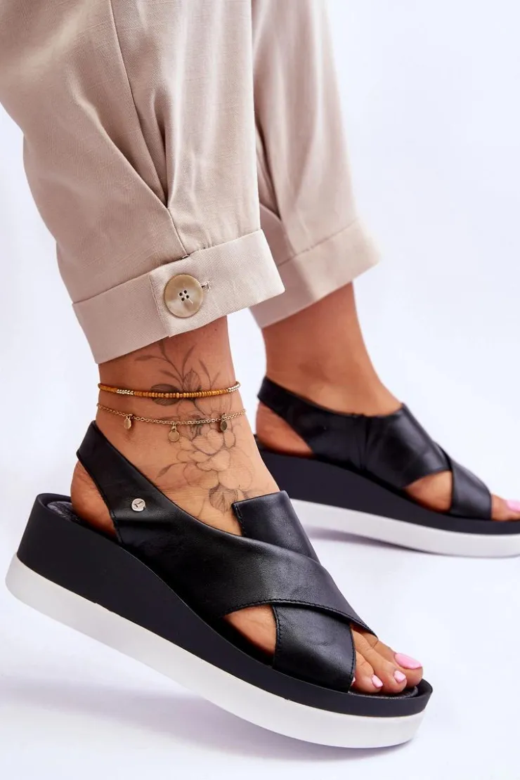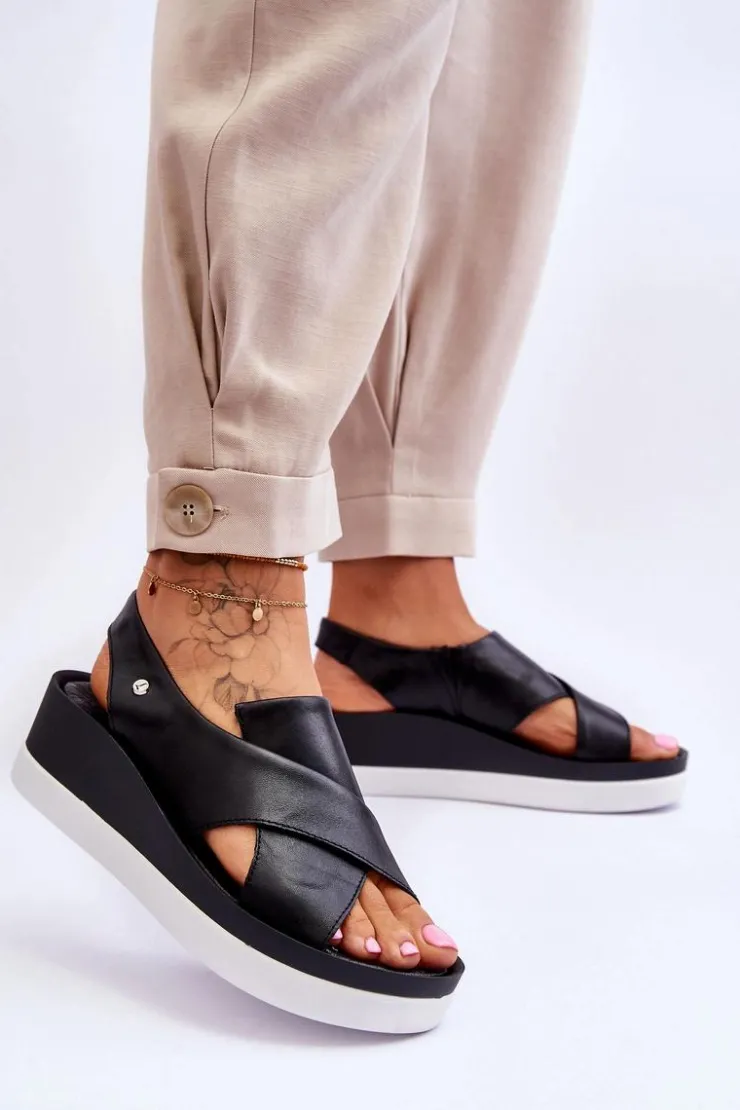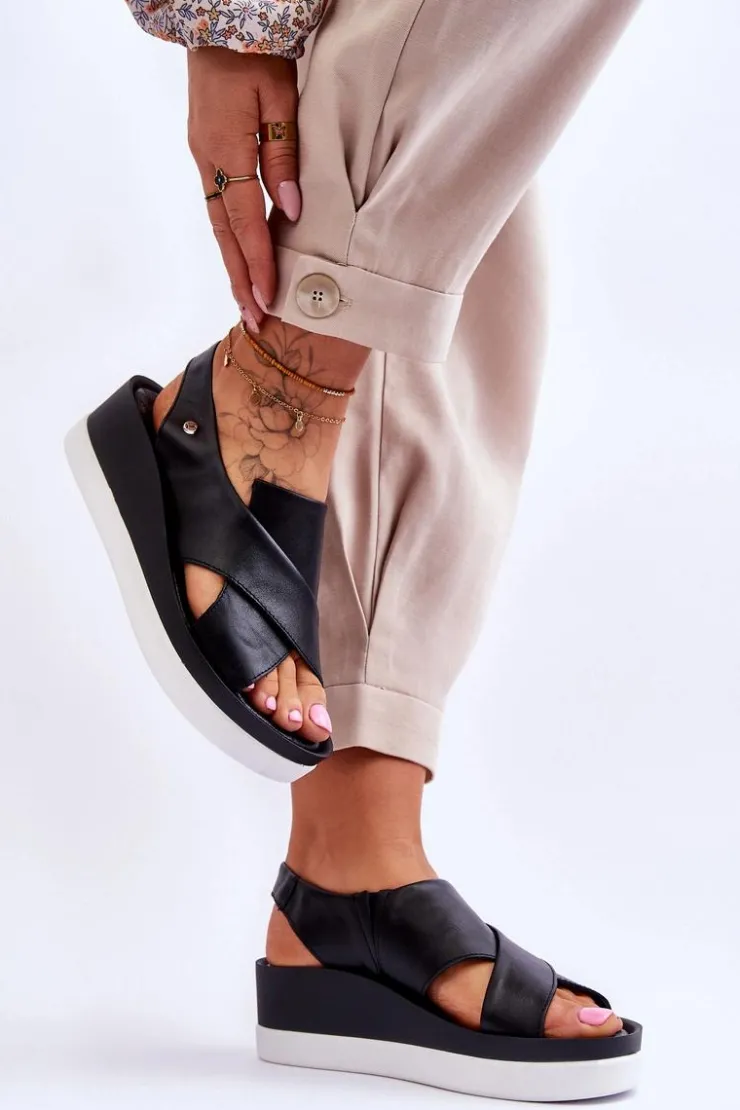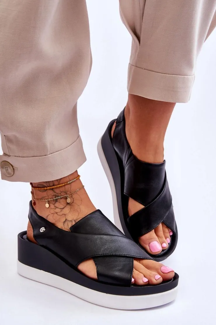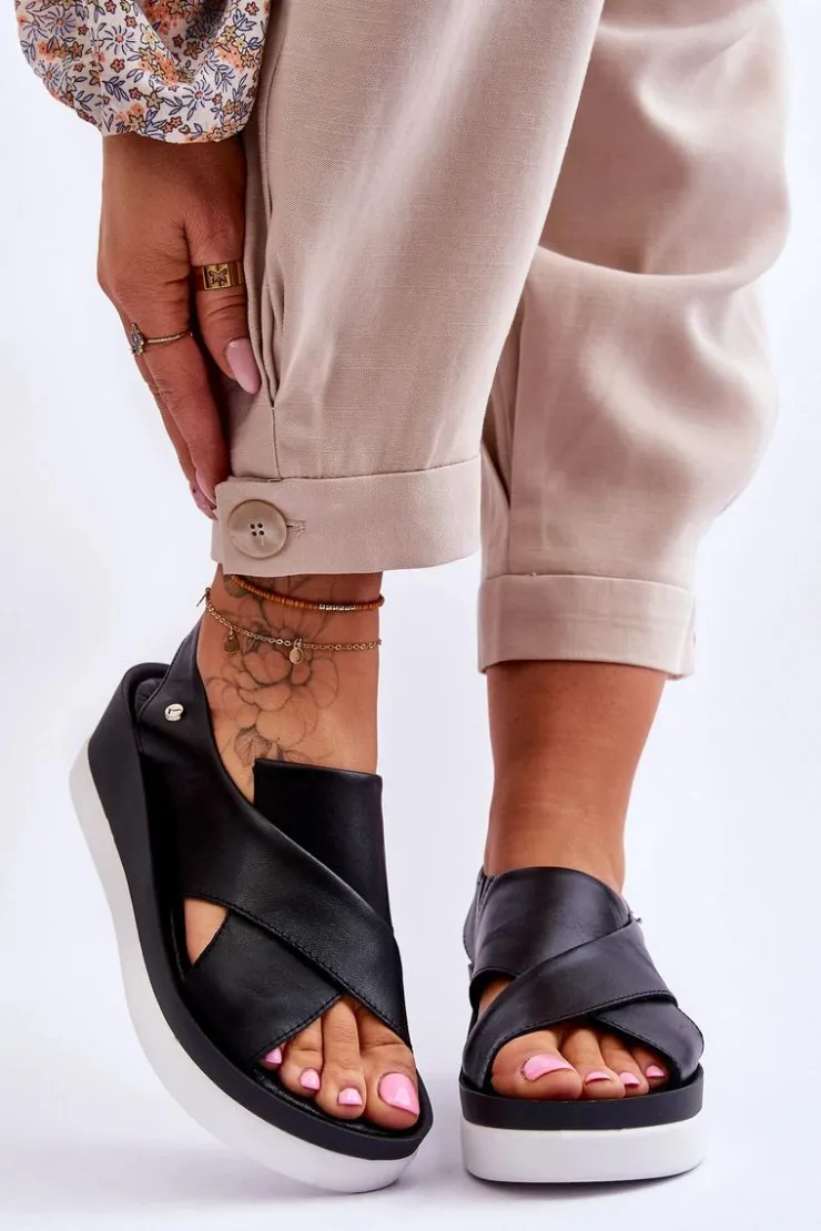 Niezwykle wygodne sandałki damskie zostały wykonane z naturalnej skóry. Model wsuwany, z dodatkowymi gumkami, które dopasują się do tęgości nogi. Model ten posiada ozdobny emblemat z boku cholewki. Sandały osadzono na platformie oraz koturnie. Ten model z pewnością przypadnie Ci do gustu! Przy wyborze rozmiaru prosimy kierować się tabelą rozmiarów.