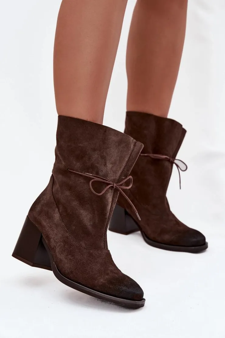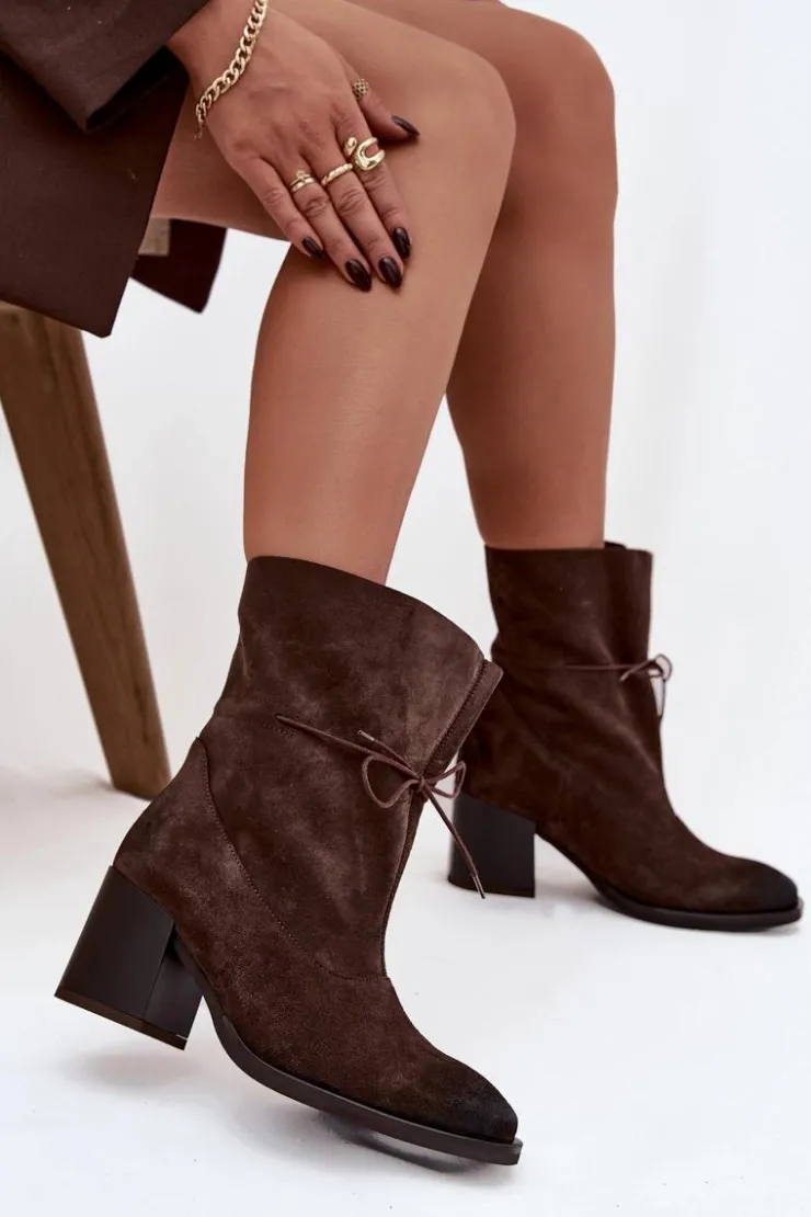 Botki damskie wykonane z naturalnego zamszu to elegancka propozycja dla kobiet ceniących styl i wygodę. Model wsuwany prezentuje się nowocześnie, a obcas w formie stabilnego słupka dodaje sylwetce lekkości i zapewnia komfort noszenia. Na cholewce znajduje się delikatny sznureczek, który pozwala dopasować botki do nogi i subtelnie podkreśla ich kobiecy charakter. To uniwersalny model, który doskonale sprawdzi się zarówno w codziennych, jak i bardziej eleganckich stylizacjach. Przy wyborze rozmiaru prosimy kierować się tabelą rozmiarów.