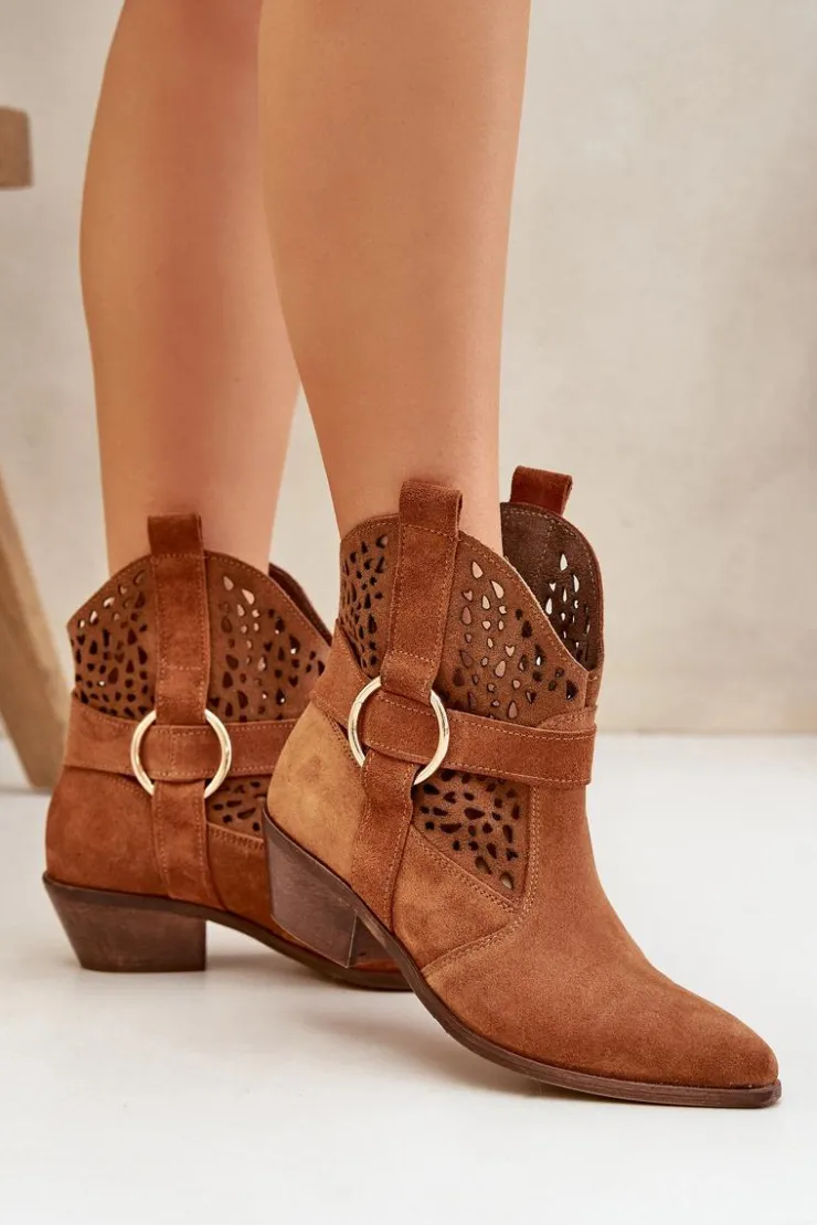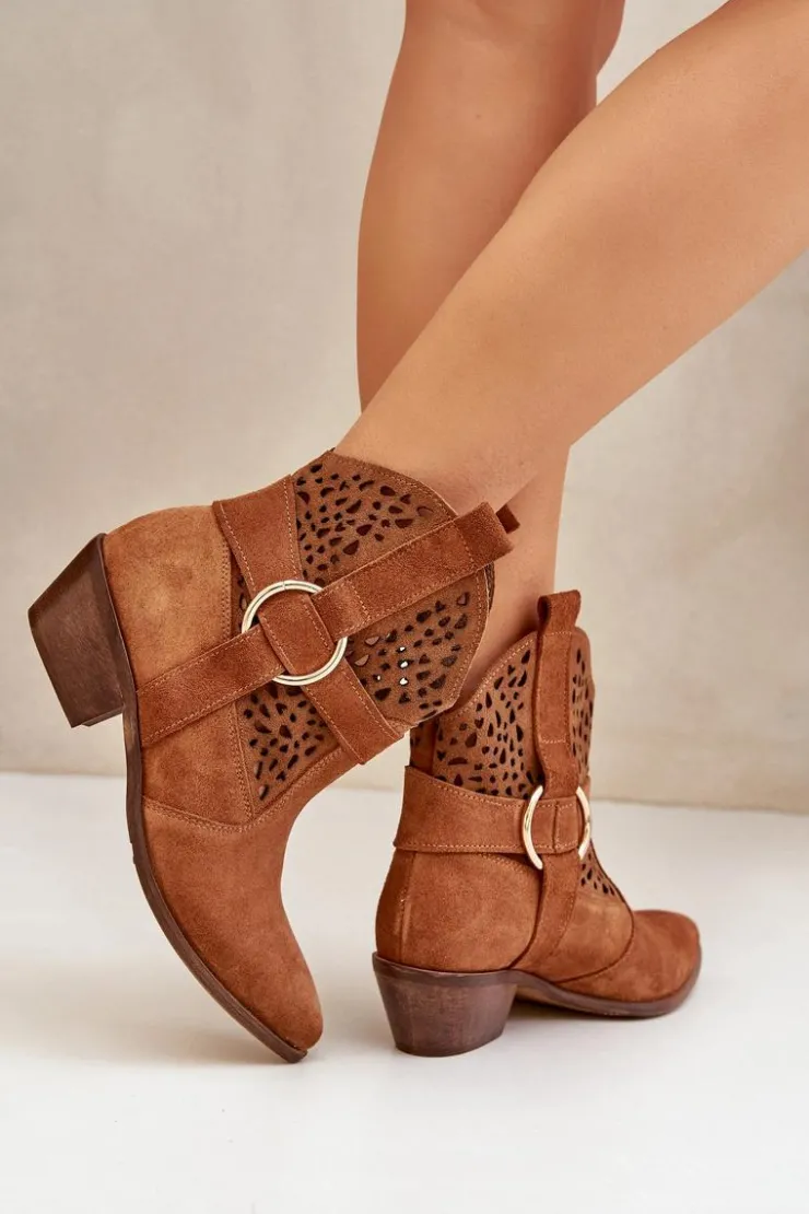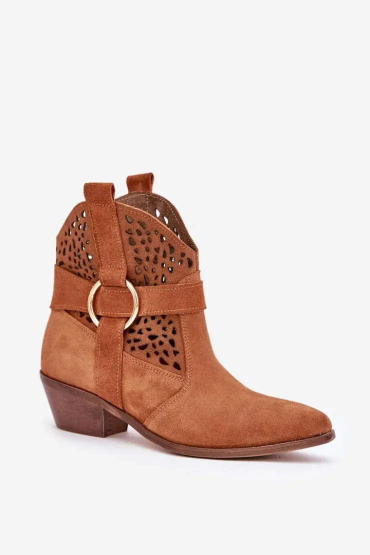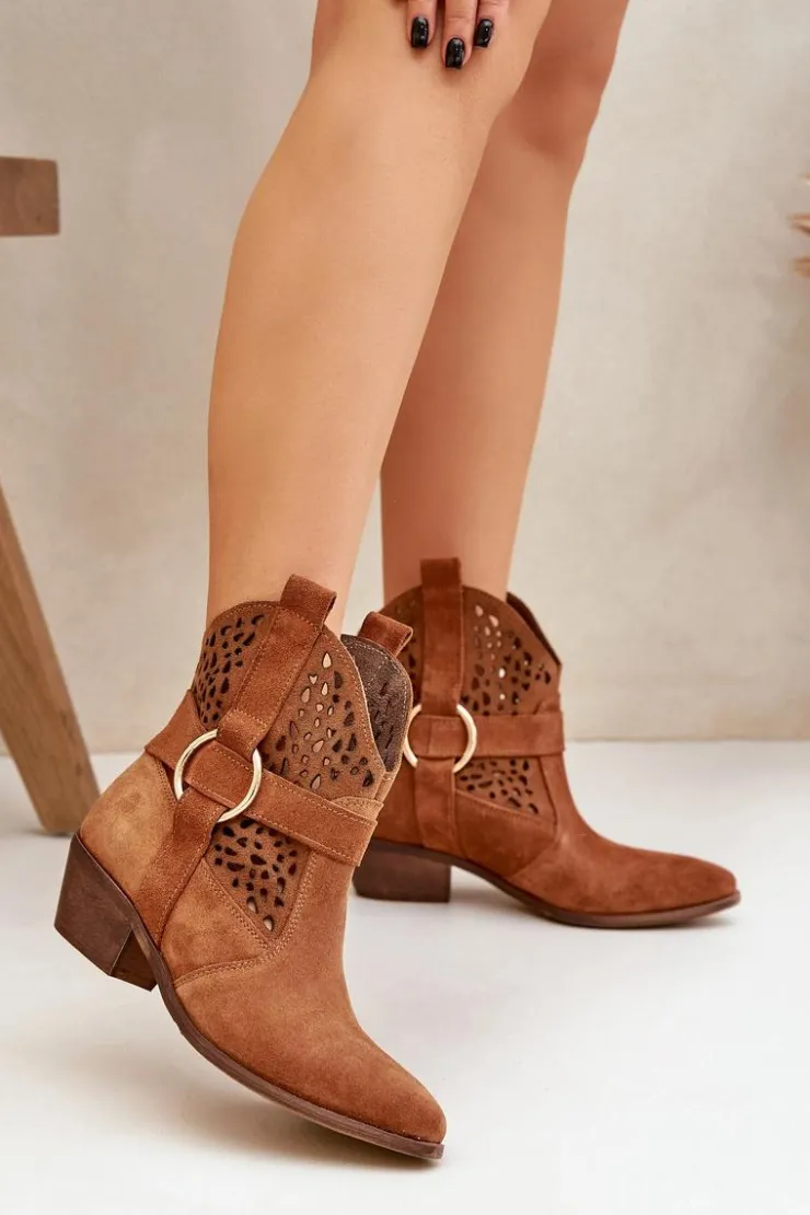 Damskie Zazoo Zamszowe Botki Kowbojki Ażurowe Na Obcasie 2994 Camel