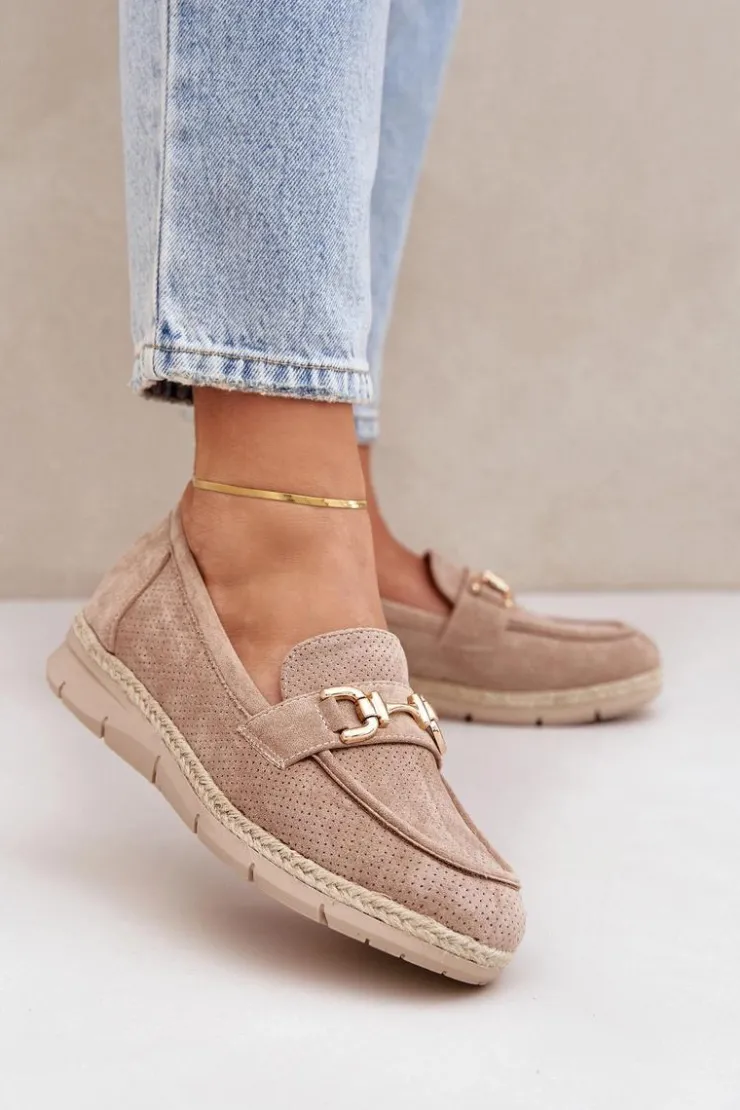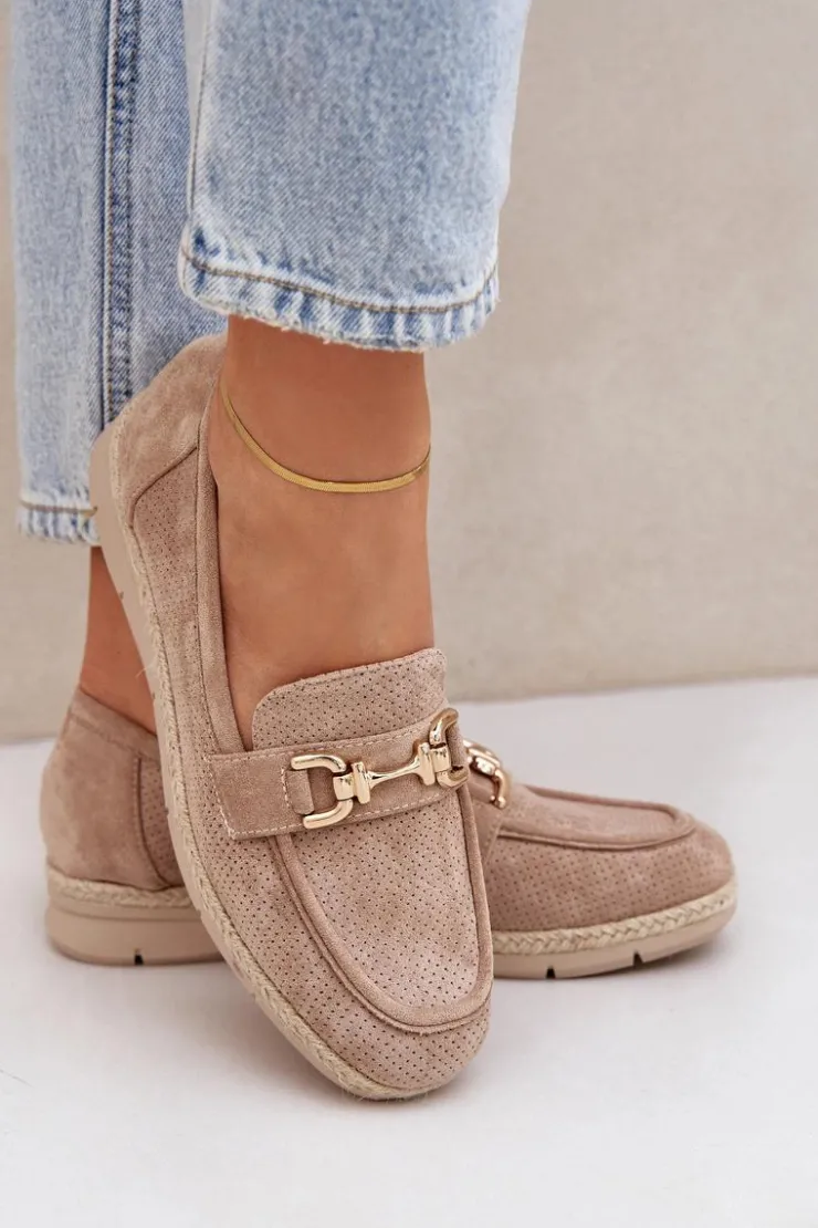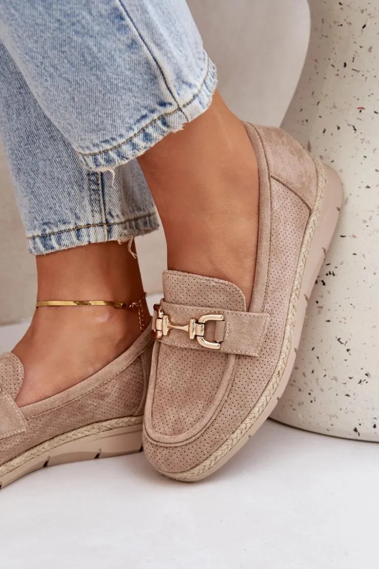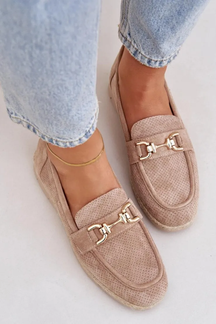 Damskie mokasyny z eko zamszu. Osadzone na delikatnej platformie z jutową plecionką. Przód ozdobiony złotym detalem, który nadaje elegancji. Noski zaokrąglone. Ten model jest nie tylko stylowy, ale również funkcjonalny dzięki ażurowej cholewce, która umożliwia stopie oddychanie. Idealne do wielu wiosennych stylizacji! Przy wyborze rozmiaru prosimy sugerować się tabelą rozmiarów.