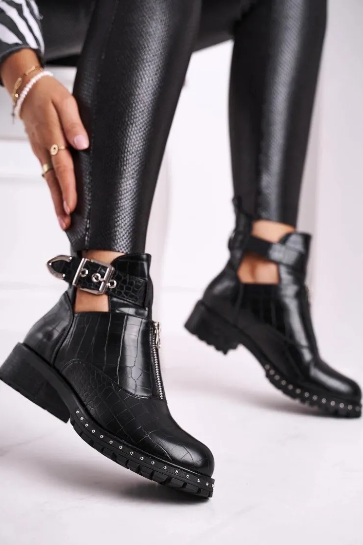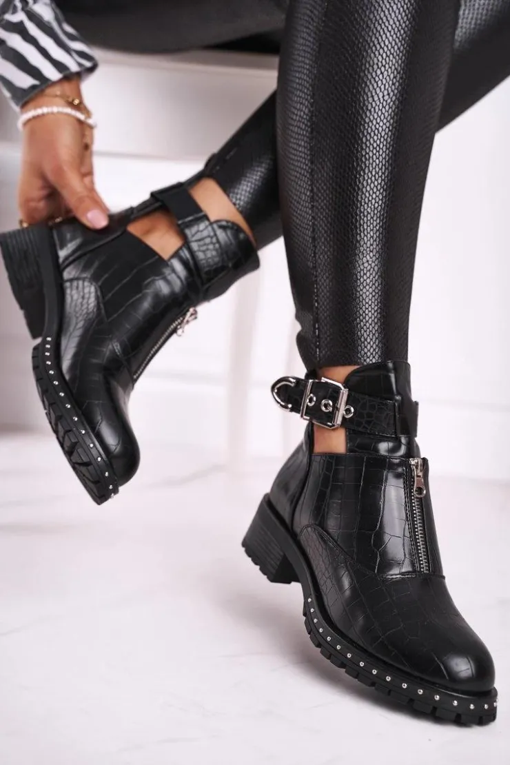 Jeśli chcesz zabłysnąć w świecie mody lub po prostu pokazać się z jak najlepszej strony, to te botki będą idealną propozycją dla Ciebie. Bardzo wyczekiwane przez wiele kobiet! Wyglądają bardzo efektownie, zastosowanie regulowanej klamry na boku oraz suwaka na przedniej części cholewki to strzał w 10! Wierzch wykonany ze skóry ekologicznej z imitacją skóry krokodyla. Posiadają unikalny design – są częściowo wykrojone na wysokości kostki, przez co wyglądają niesamowicie. Rockowy styl na wyciągnięcie ręki! Nie czekaj dłużej i kup teraz, póki jeszcze są dostępne! Przy wyborze rozmiaru prosimy sugerować się tabelą rozmiarów.