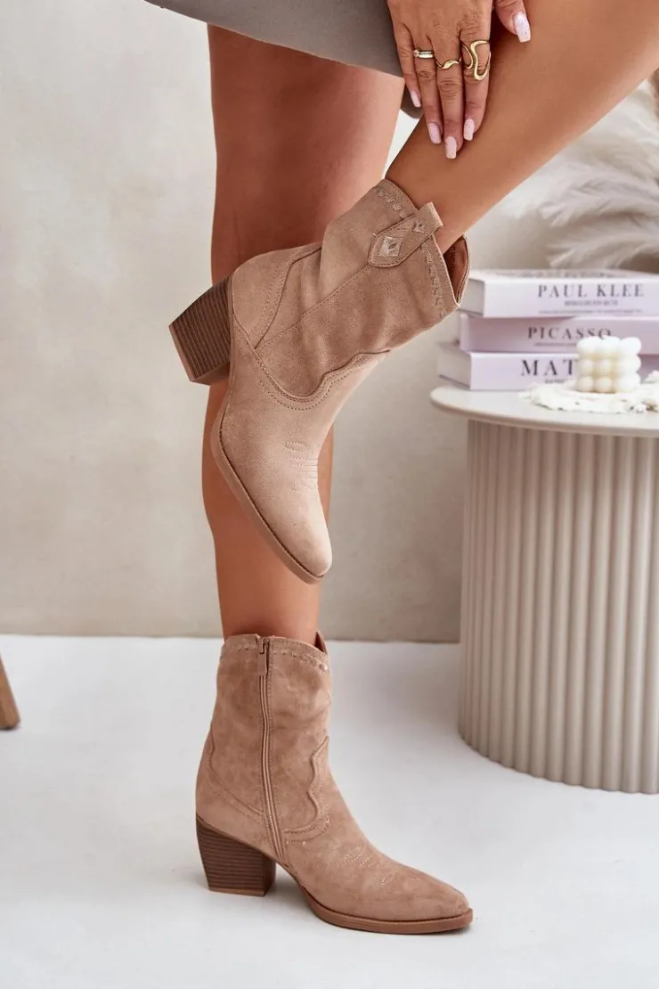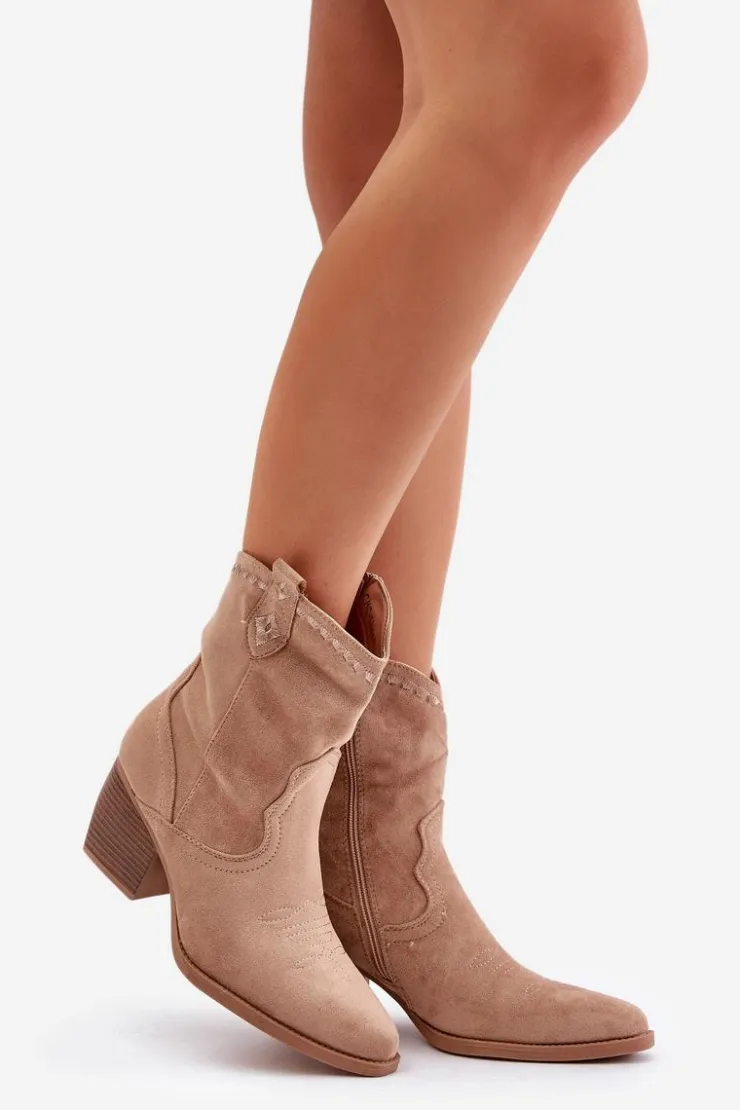 Botki damskie w stylu kowbojek. Wykonane z eko zamszu, to idealny wybór na chłodniejsze dni. Osadzone na stabilnym obcasie typu słupek, zapewniają komfort noszenia. Szpiczaste noski optycznie wysmuklają nogi, dodając sylwetce lekkości. Cholewka ozdobiona przeszyciami. Wnętrze ocieplone kocem obuwniczym gwarantuje ciepło, a suwak ułatwia zakładanie i zdejmowanie butów. Idealne do jesiennych stylizacji. Przy wyborze rozmiaru prosimy sugerować się tabelą rozmiarów.