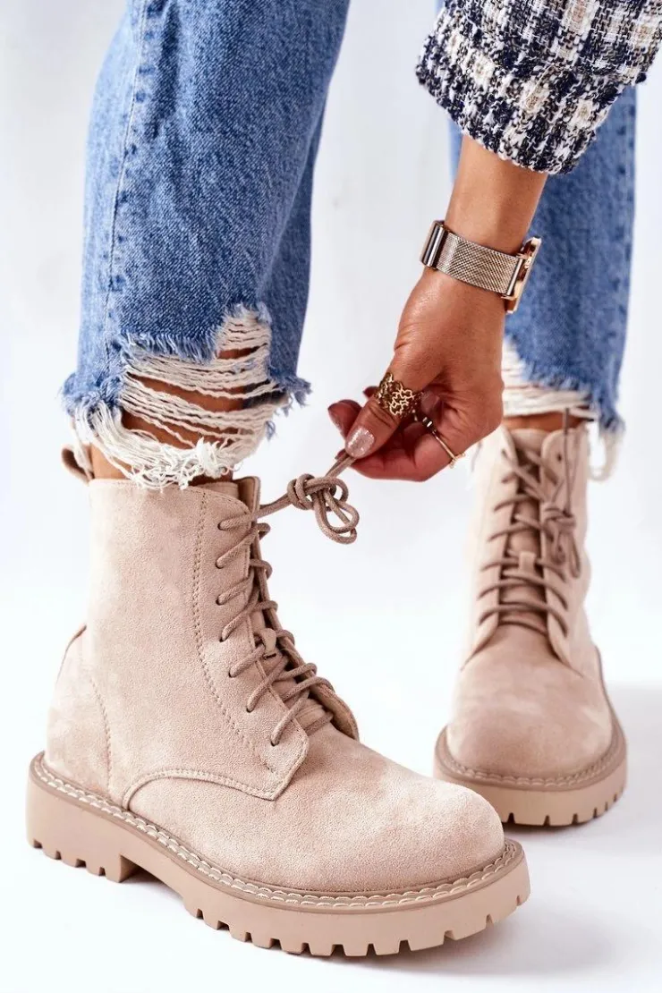 Botki damskie wykonane z zamszowej skóry ekologicznej. Posiadają zapinanie na zamek z boku. Przy wyborze rozmiaru prosimy sugerować się tabelą rozmiarów.