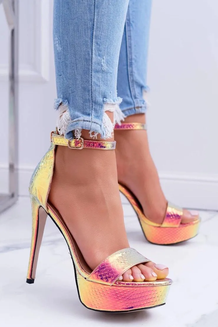 Cudowny model damskich sandałów obok którego nie można przejść obojętnie. Wysoka szpilka, która wspaniale wydłuży i wyeksponuje nasze nogi. Wysoka 4cm platforma sprawi że sandałki stają się jeszcze wygodniejsze. A do tego wszystkiego ten przepiękny benzynowy kolor! My jesteśmy zachwycone i polecamy Wam ten model z całego serca. Z nim każda stylizacja nabierze nowego blasku. Przy wyborze rozmiary prosimy sugerować się tabelą rozmiarów.