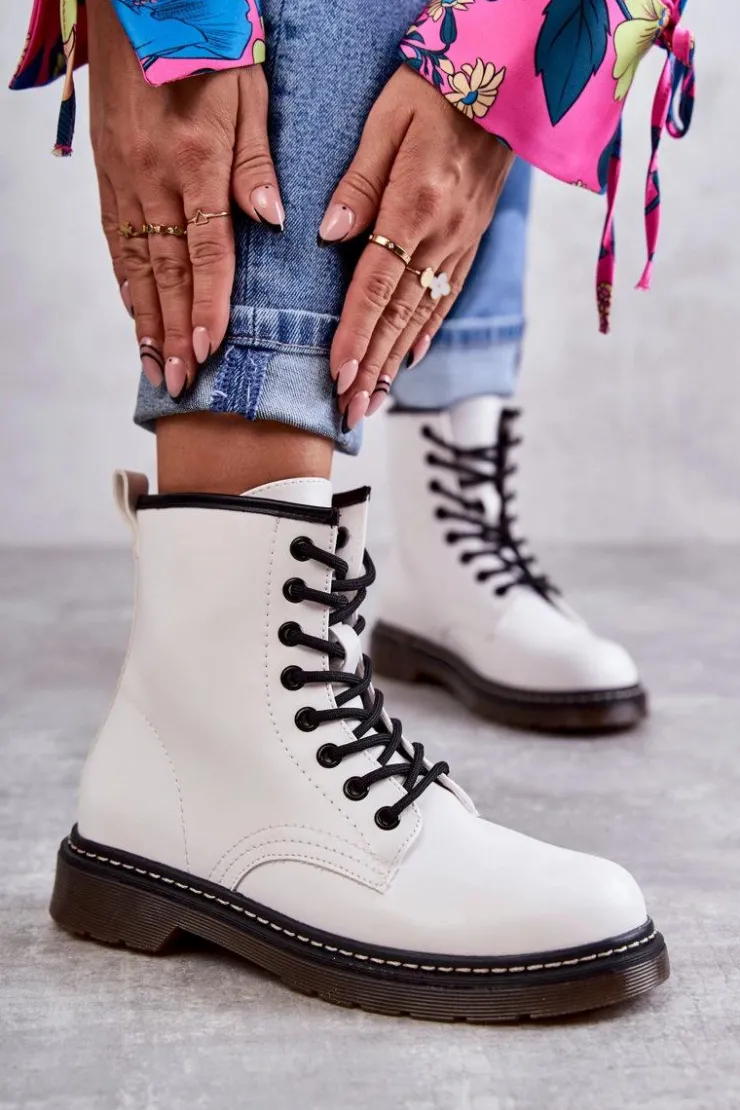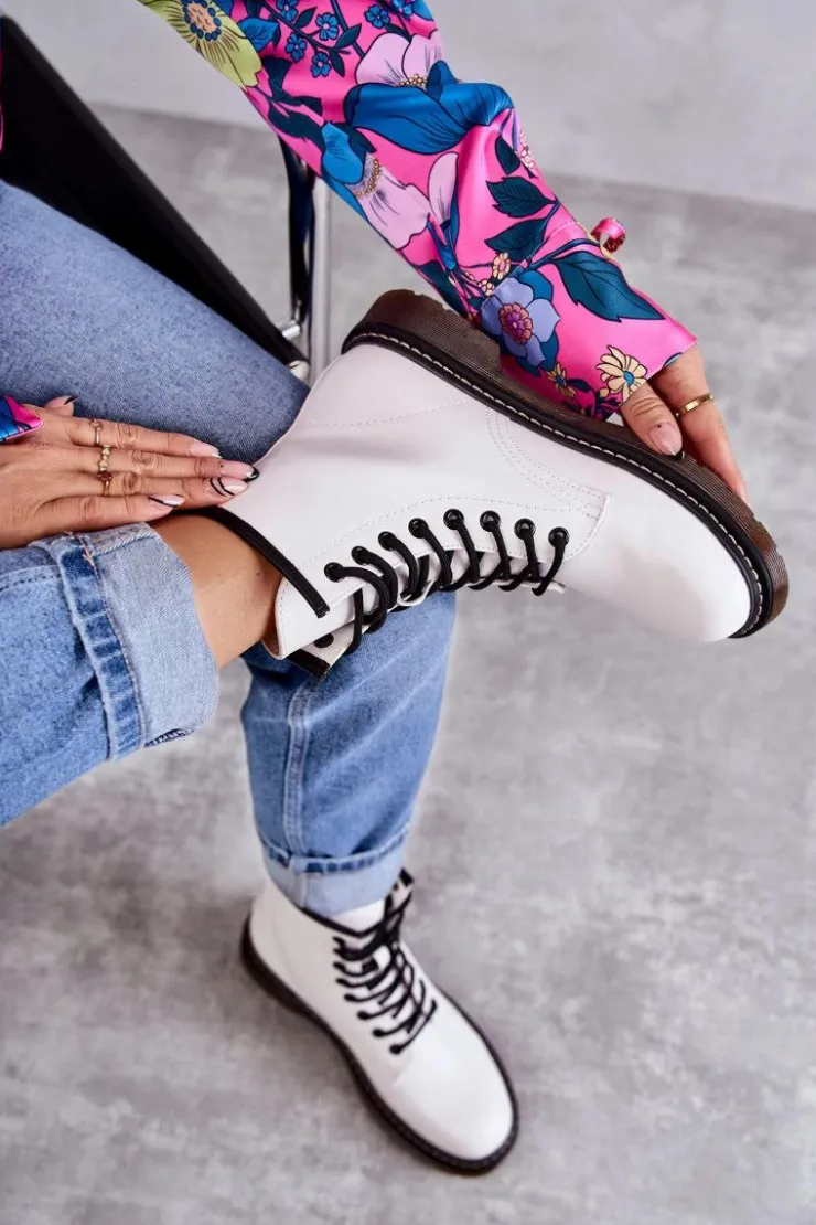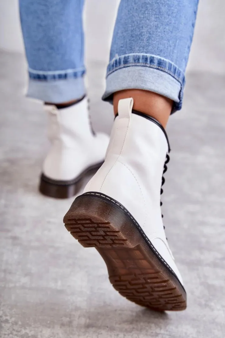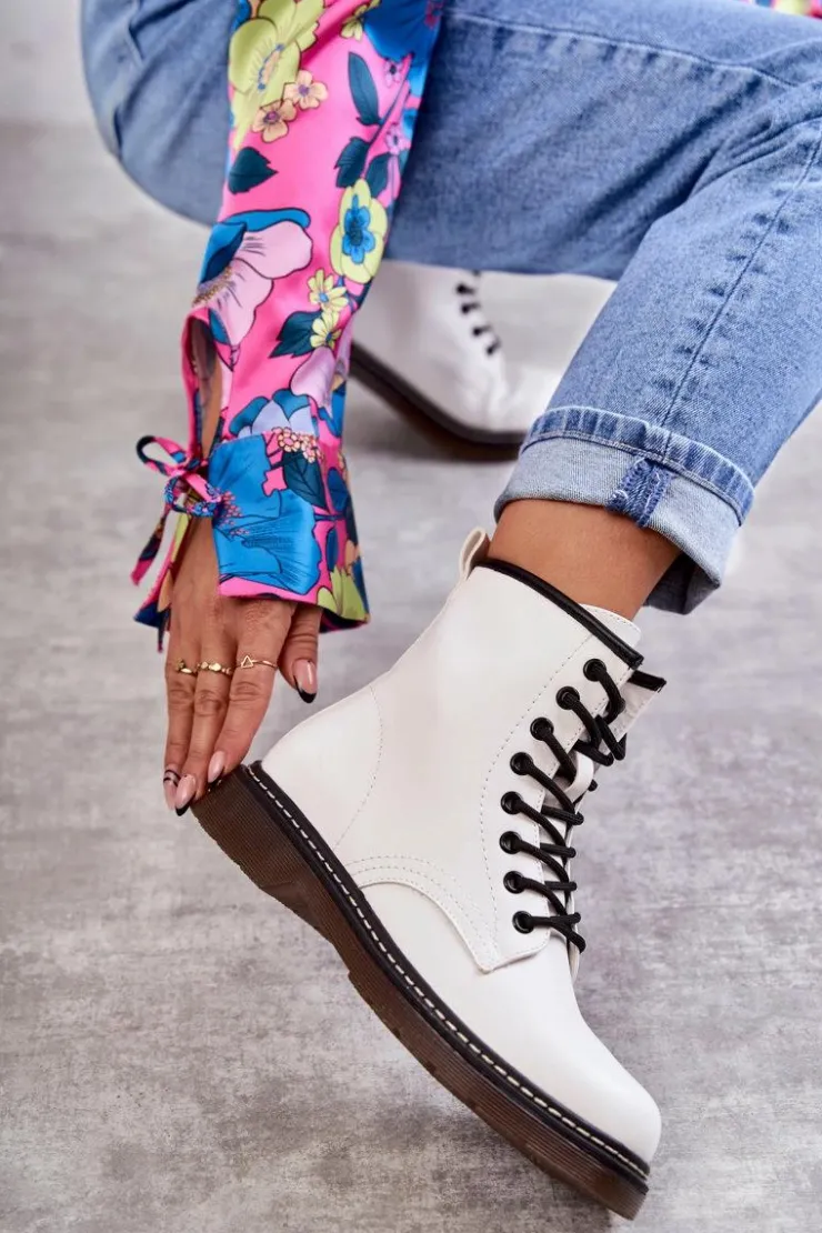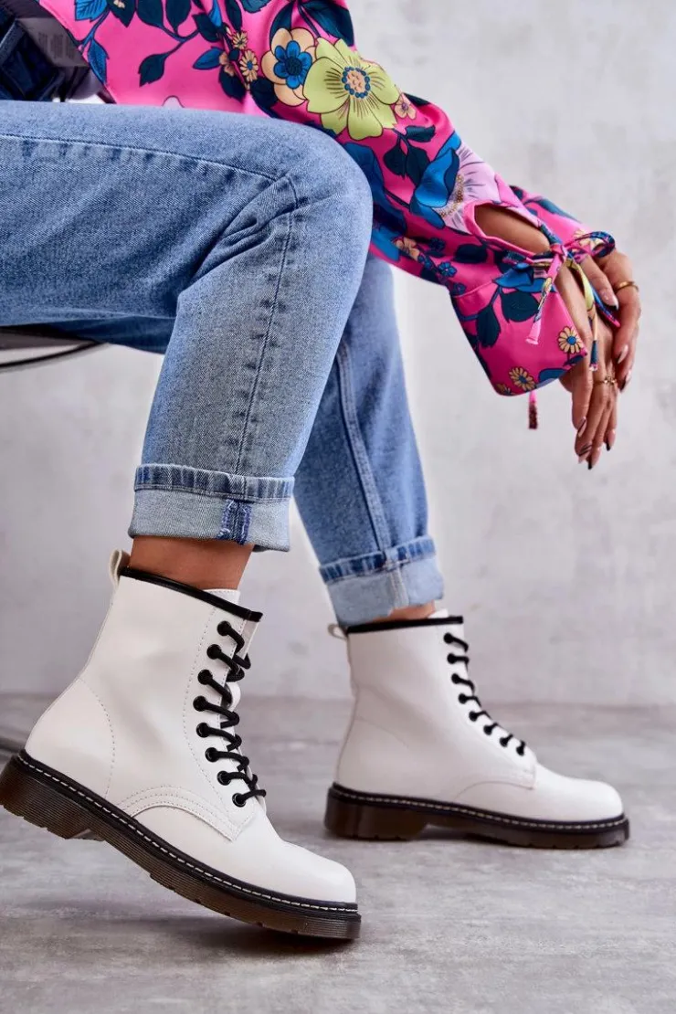 Damskie botki z cholewką za kostkę zostały wykonane z tworzywa. Model ten posiada usztywniany zapiętek. Botki wiązane na okrągłe sznurowadła. Osadzone na niskiej platformie i płaskim obcasie wykonanym z tworzywa gumowego. Są antypoślizgowe. W środku posiadają ocieplenie w postaci koca obuwniczego. Sprawdź także pozostałe modele botków! Przy wyborze rozmiaru prosimy sugerować się tabelą rozmiarów.