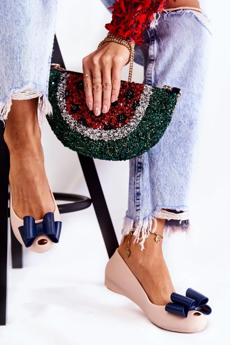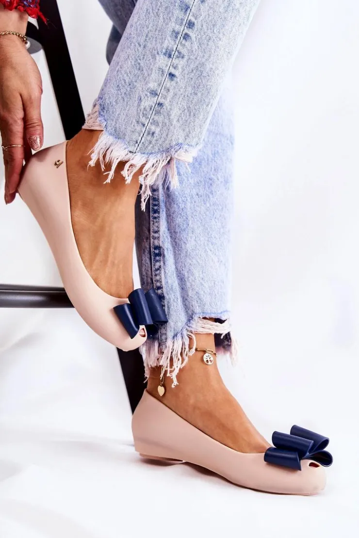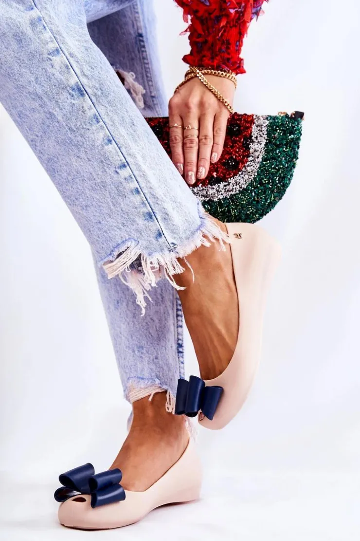 Wyjątkowe baleriny z ozdobną kokardą na przodzie. Dodatkowo na zaokrąglonym nosku znajduje się delikatne wycięcie. Buty zostały wykonane z gumowego tworzywa. Baleriny osadzone są na płaskim obcasie z antypoślizgową podeszwą. Miękka wkładka zapewni komfort podczas użytkowania. Z boku cholewki znajduje się ozdobny element. Te baleriny świetnie sprawdzą się na różnego rodzaju uroczystościach. Przy wyborze rozmiaru prosimy sugerować się tabelą rozmiarów.