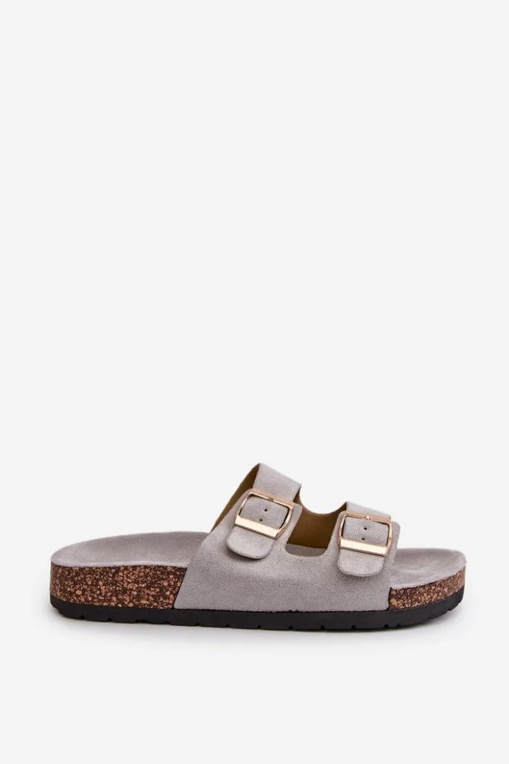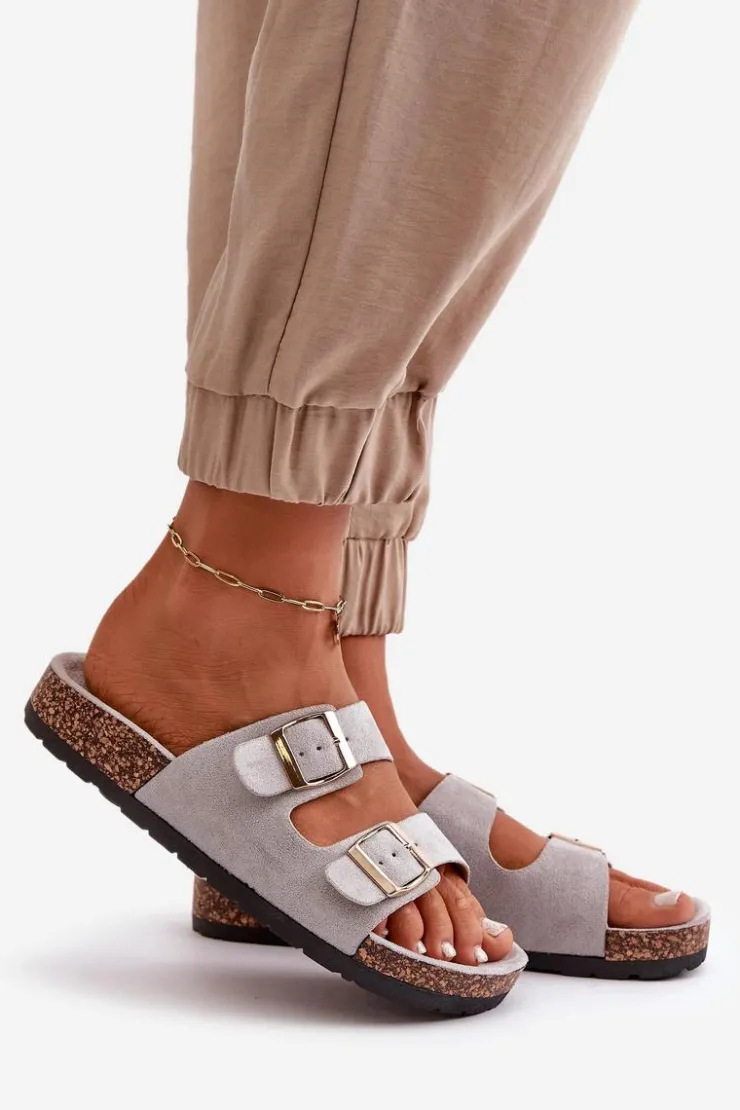 Klapki te posiadają dwa szerokie paski zapinane na sprzączkę, które można regulować. Idealne na letnie spacery oraz codzienne wyjścia na zakupy. Profilowana, wykonana z eko zamszu wkładka zapewni wygodę oraz komfort. Podeszwa została wykonana z tworzywa sztucznego. Klapki te sprawiają, że Twoje stopy będą wypoczęte i zrelaksowane. Przy wyborze rozmiaru prosimy sugerować się tabelą rozmiarów.