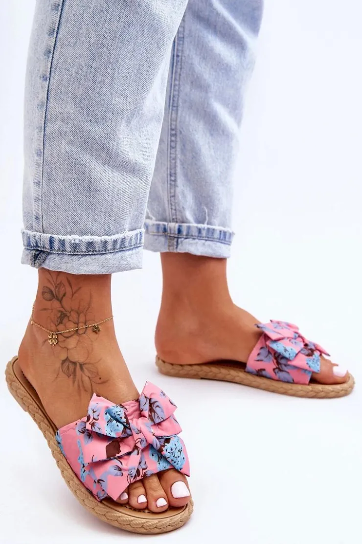 Piękne, damskie klapki zostały wykonane z zewnątrz z materiału tekstylnego w kwiecisty wzór. Klapki zostały wykonane z gumowego tworzywa. Osadzone na płaskim obcasie. Model ten jest wsuwany. Klapki cudnie będą prezentować się z sukienkami czy spódniczkami. Idealne obuwie na upalne dni! Przy wyborze rozmiaru prosimy sugerować się tabelą rozmiarów.