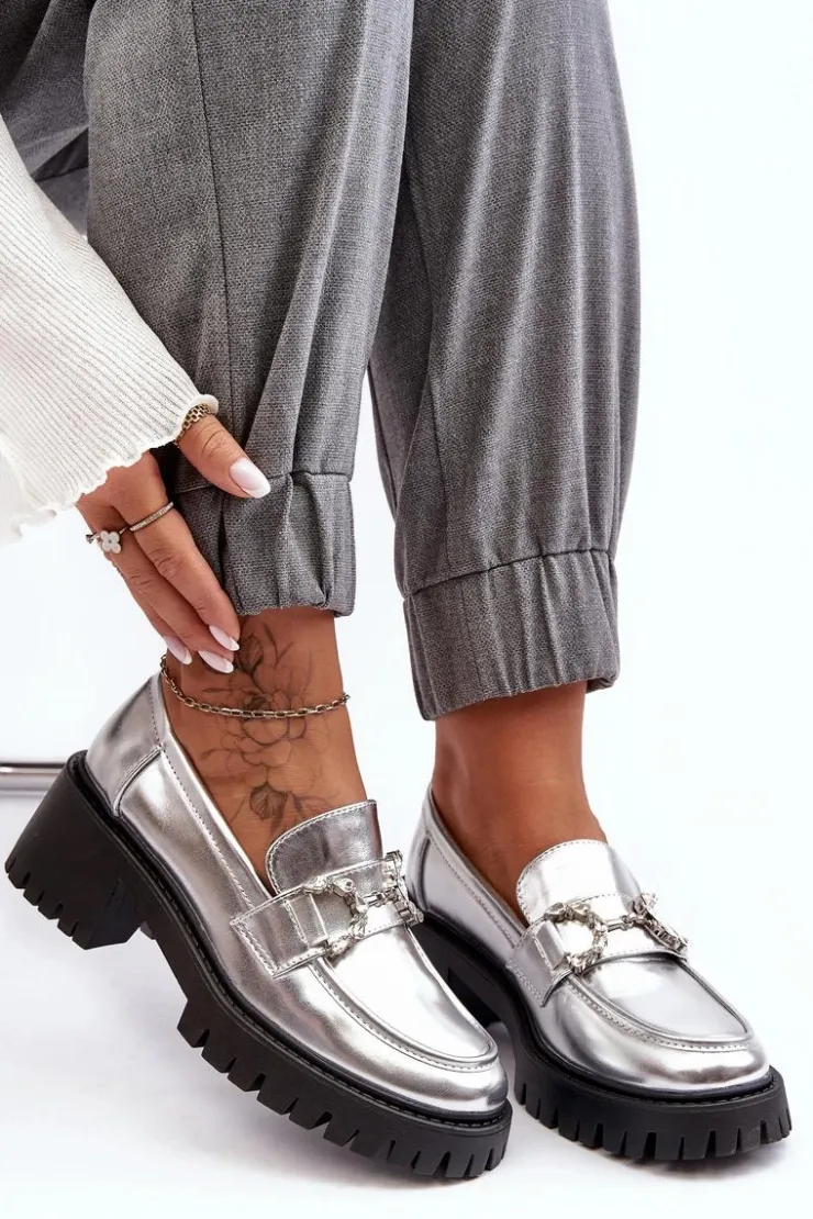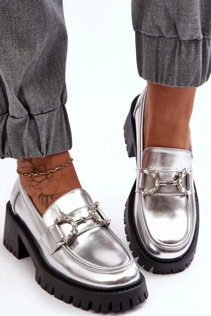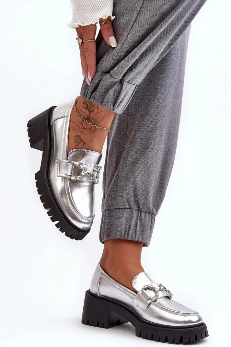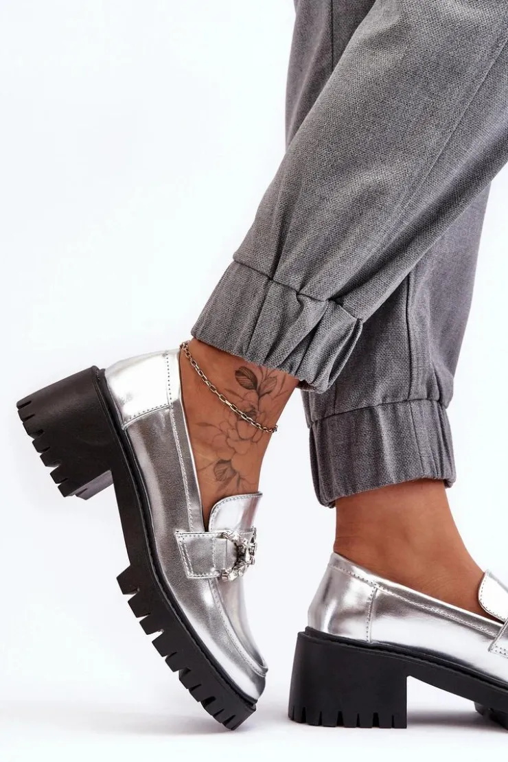 Półbuty damskie wykonane z eko skóry. Osadzone na masywnym, niskim obcasie i platformie. Z przodu na pasku biżuteryjna ozdoba. Noski zaokrąglone. Usztywniony zapiętek. Z tym modelem stworzysz wiele świetnych jesiennych stylizacji! Przy wyborze rozmiaru prosimy sugerować się tabelą rozmiarów.